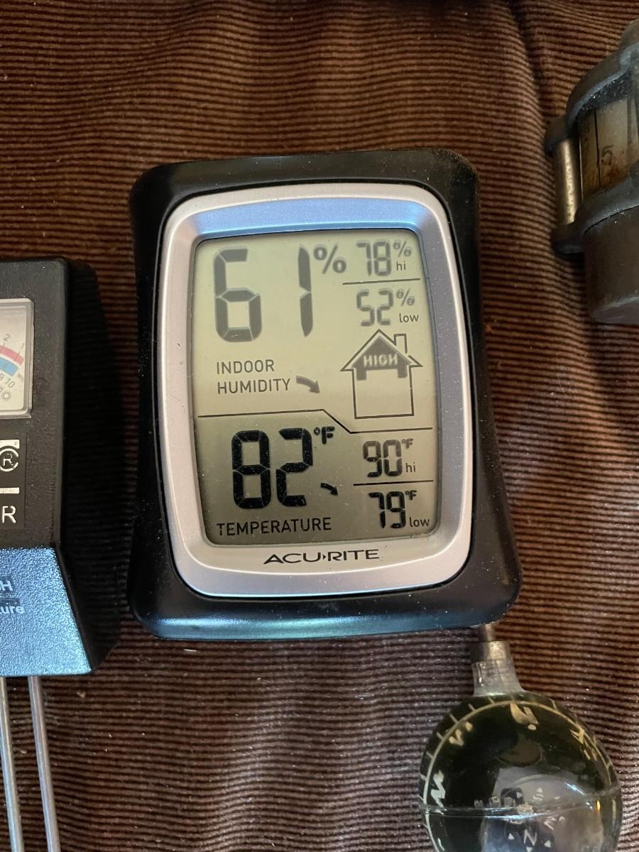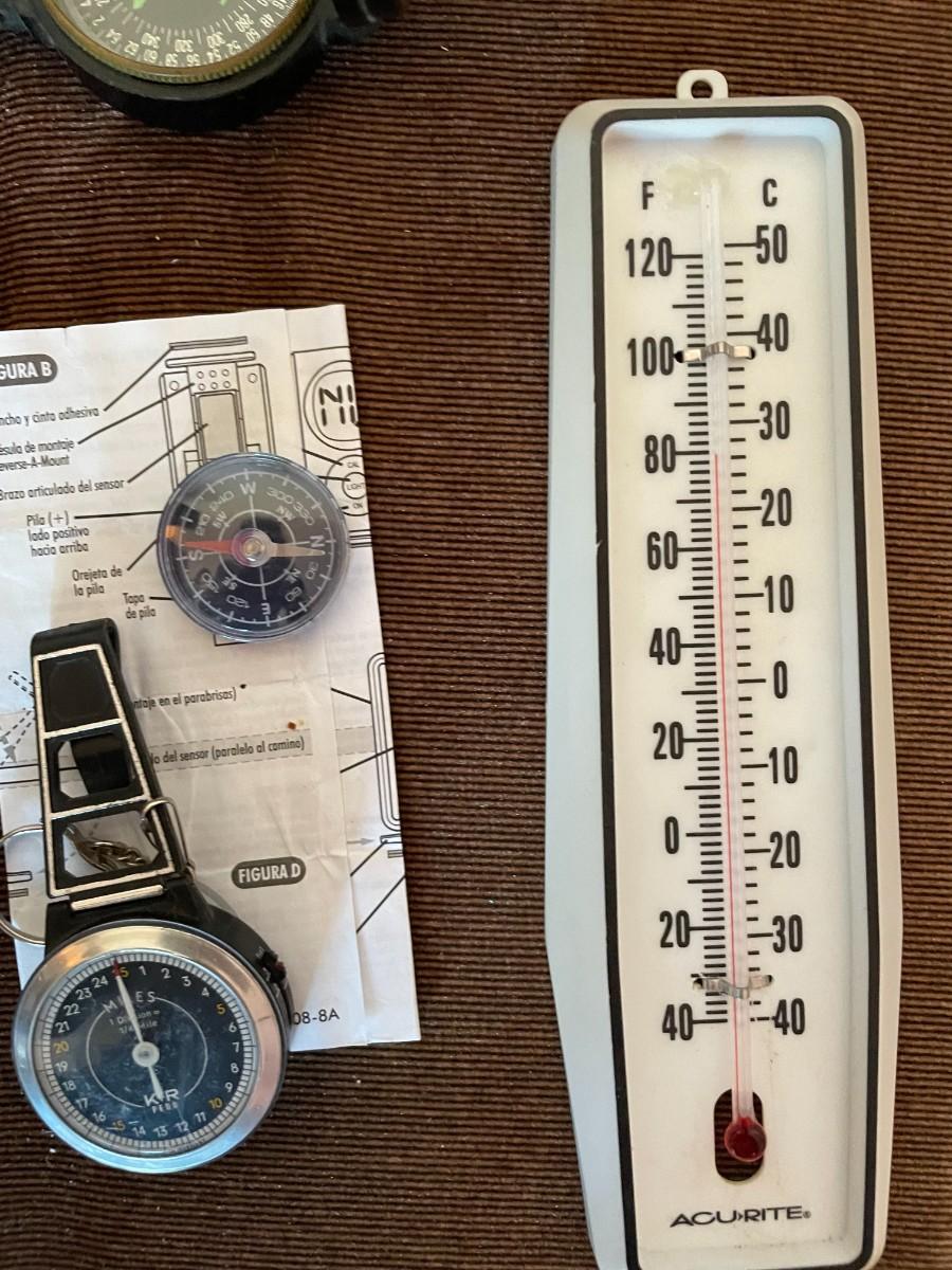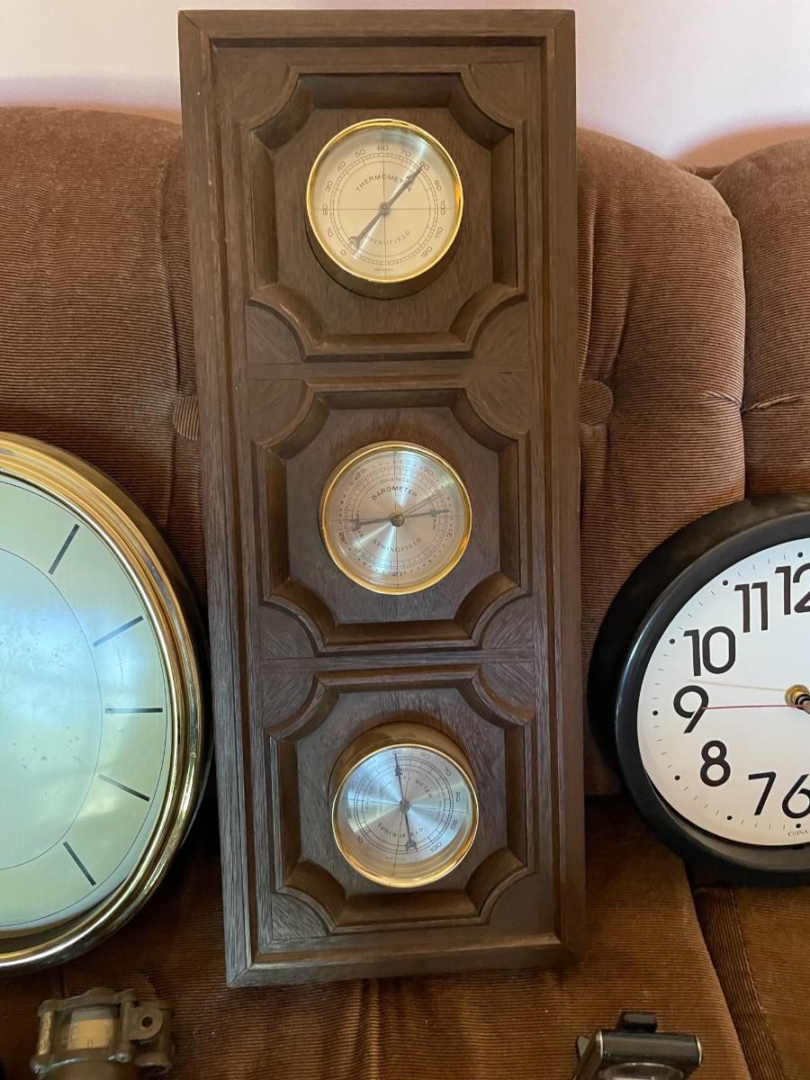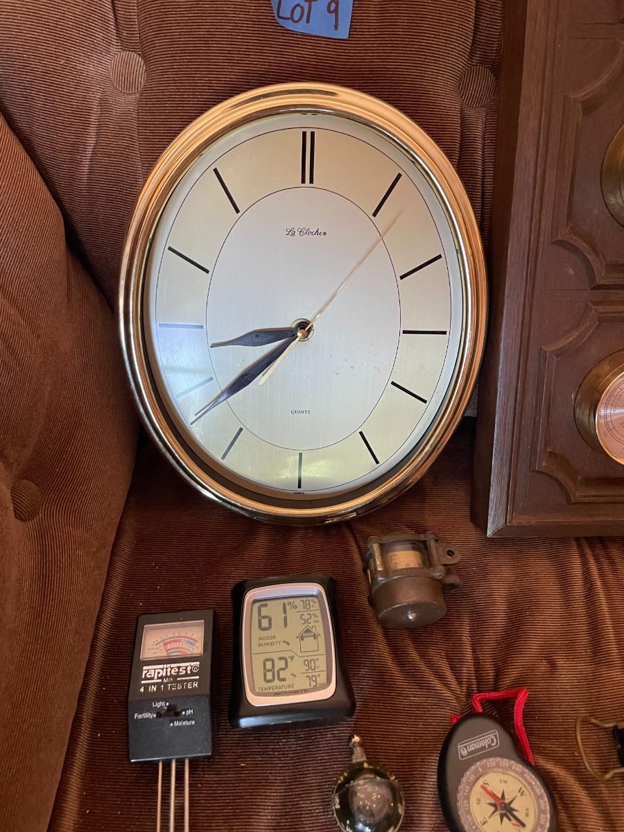 (2) Clocks, indoor humidity clock, rapidest, barometer, acurite, compasses, alarm clocks.