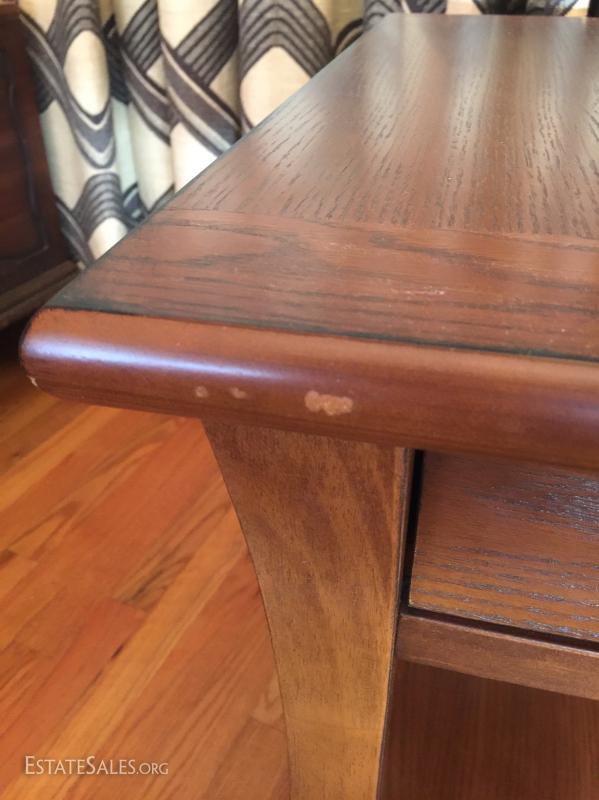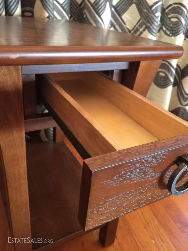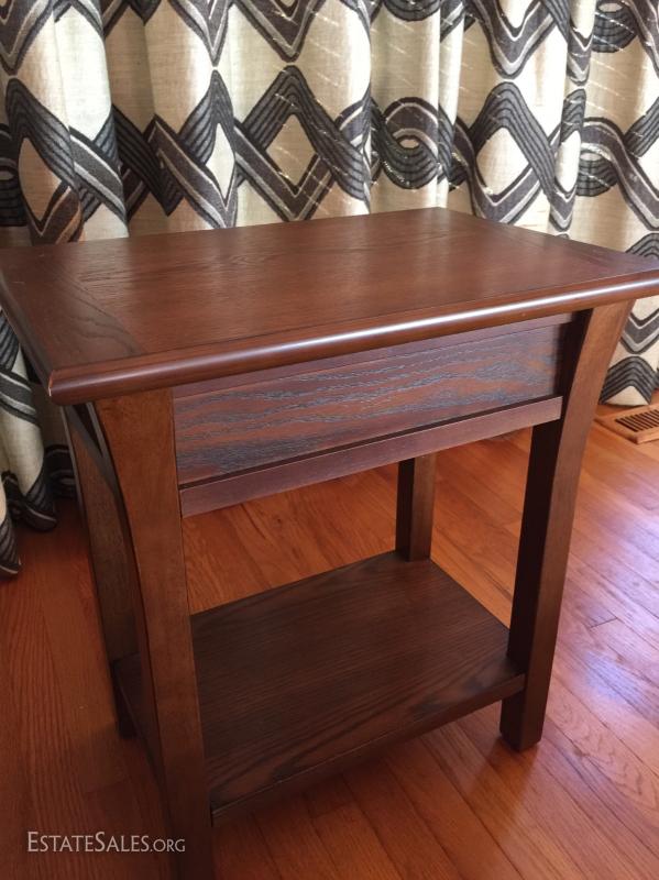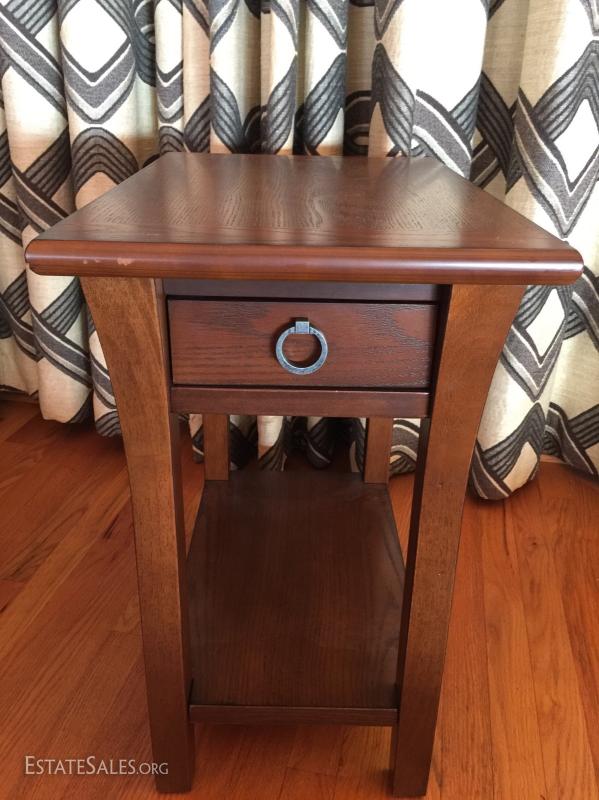 End table with drawer and shelf. See photos for details. Sold as is.