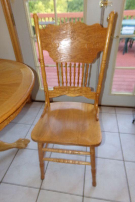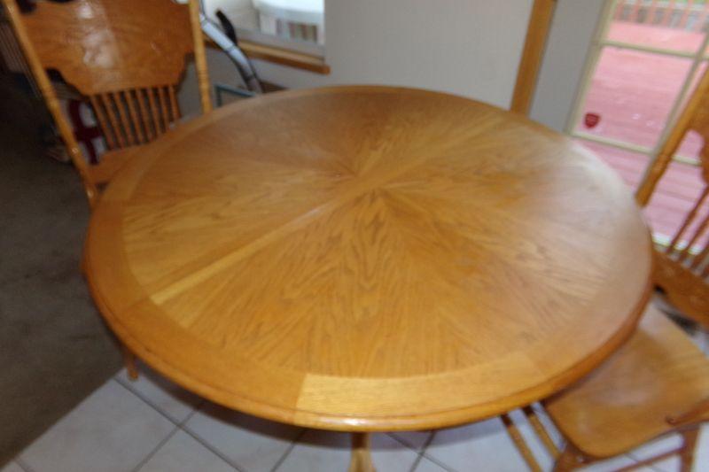 TABLE MEASURES 48" IN DIAMETER, IT INCLUDES 2 OAK CHAIRS. THERE ARE NO LEAVES TO THIS TABLE