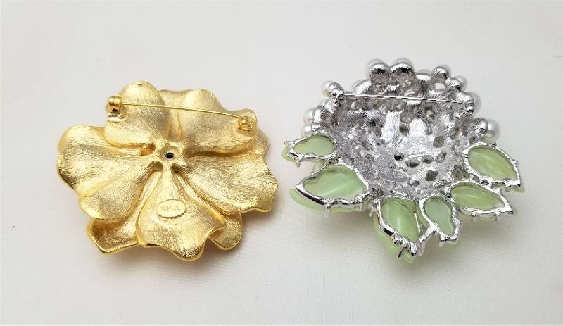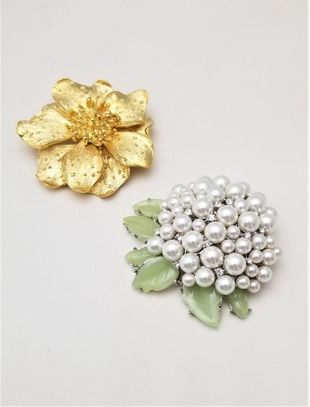 Nice brooch lot here - the gold tone is by Kenneth J. Lane - flower in full bloom, nice and bright. The other is faux pearls with thermo-plastic leaves by Nolan Miller. Both are about 2.5 inches across.