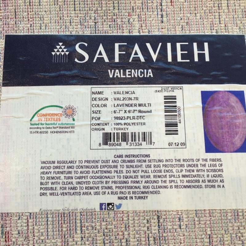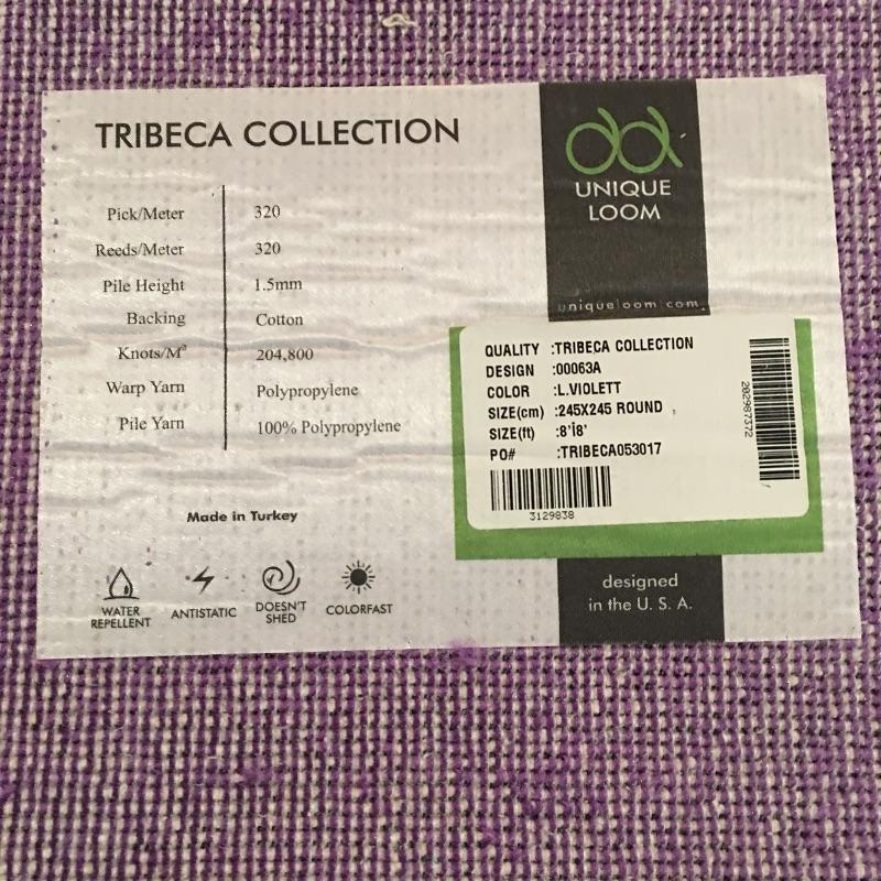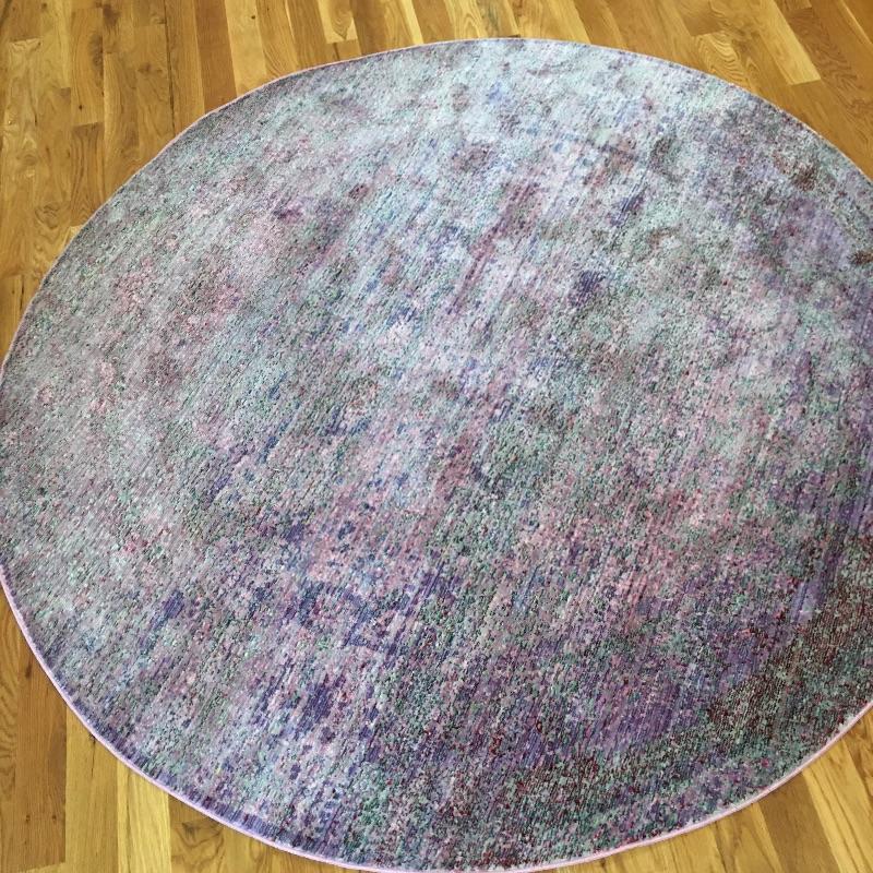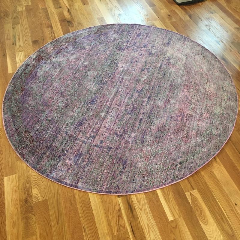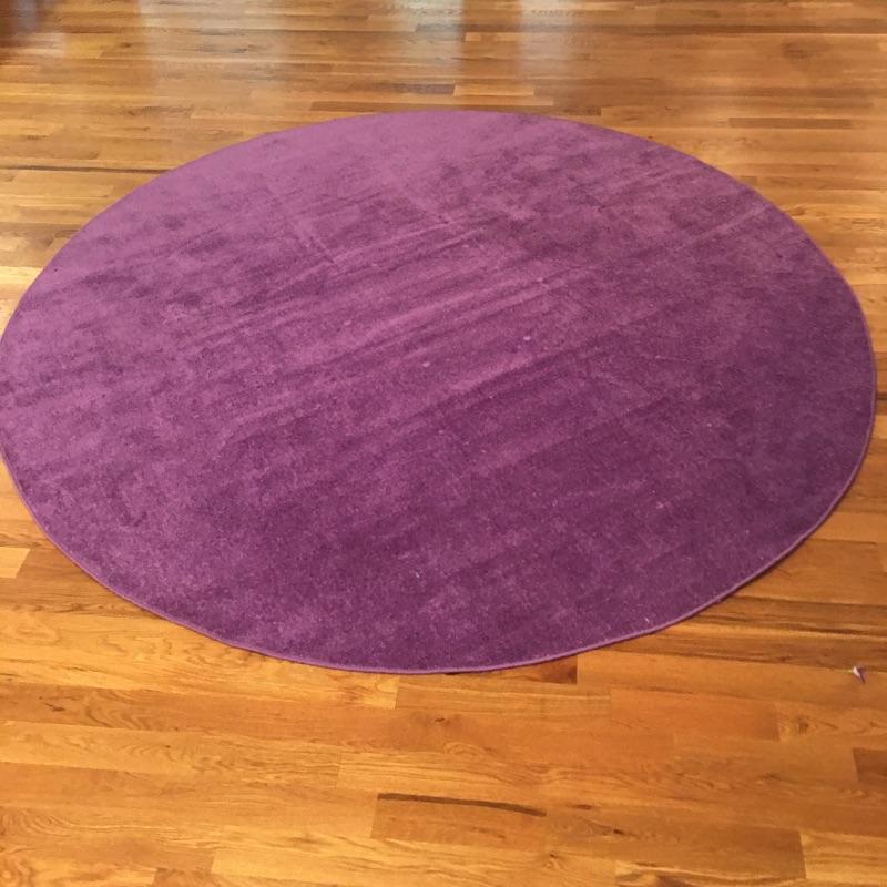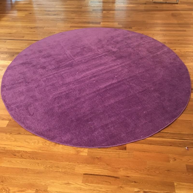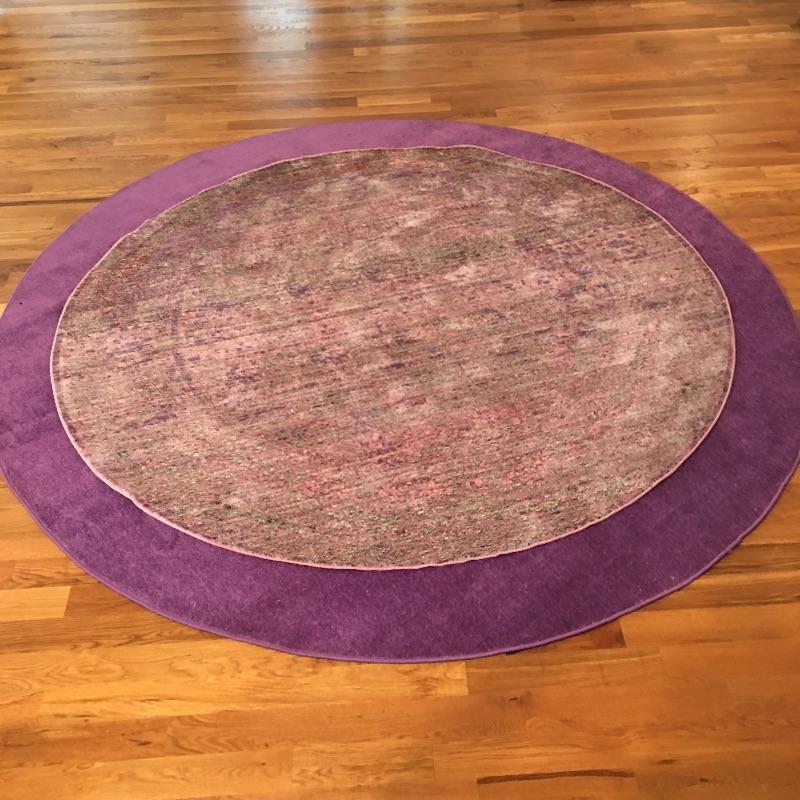 Pair of round includes large purple rug that measures 96”D and multi color rug that measures 78”D. Add some color to your home with these two bright colored rugs.