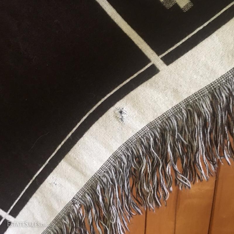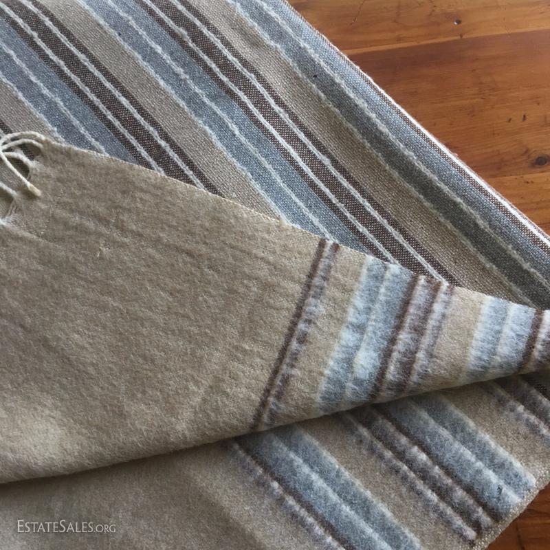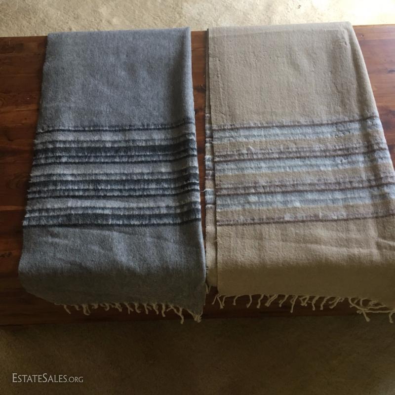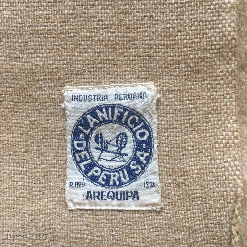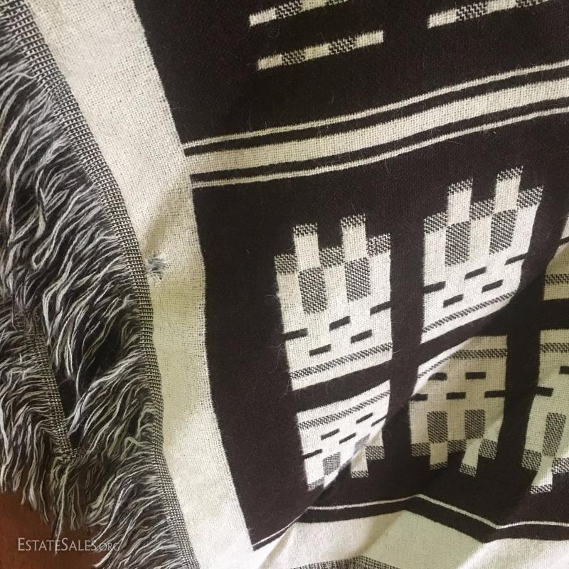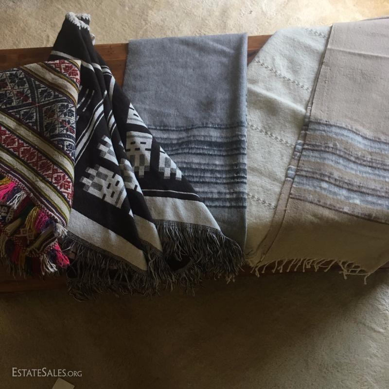 Two Ponchos (one reversible dark Peruvian wool, one more Mexican style) and two large wool shawls / scarves. Also includes thick beige woven table cloth. Small marks on beige wool shawl.