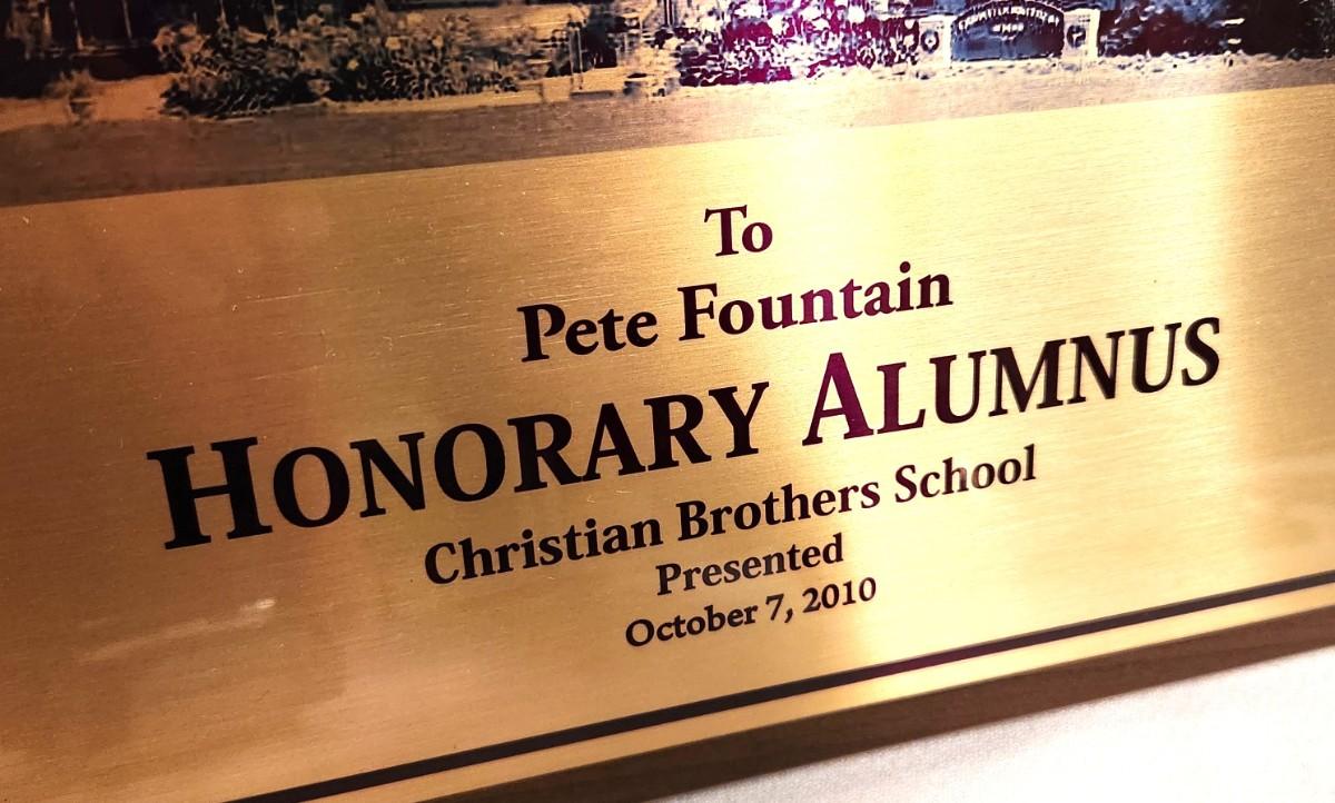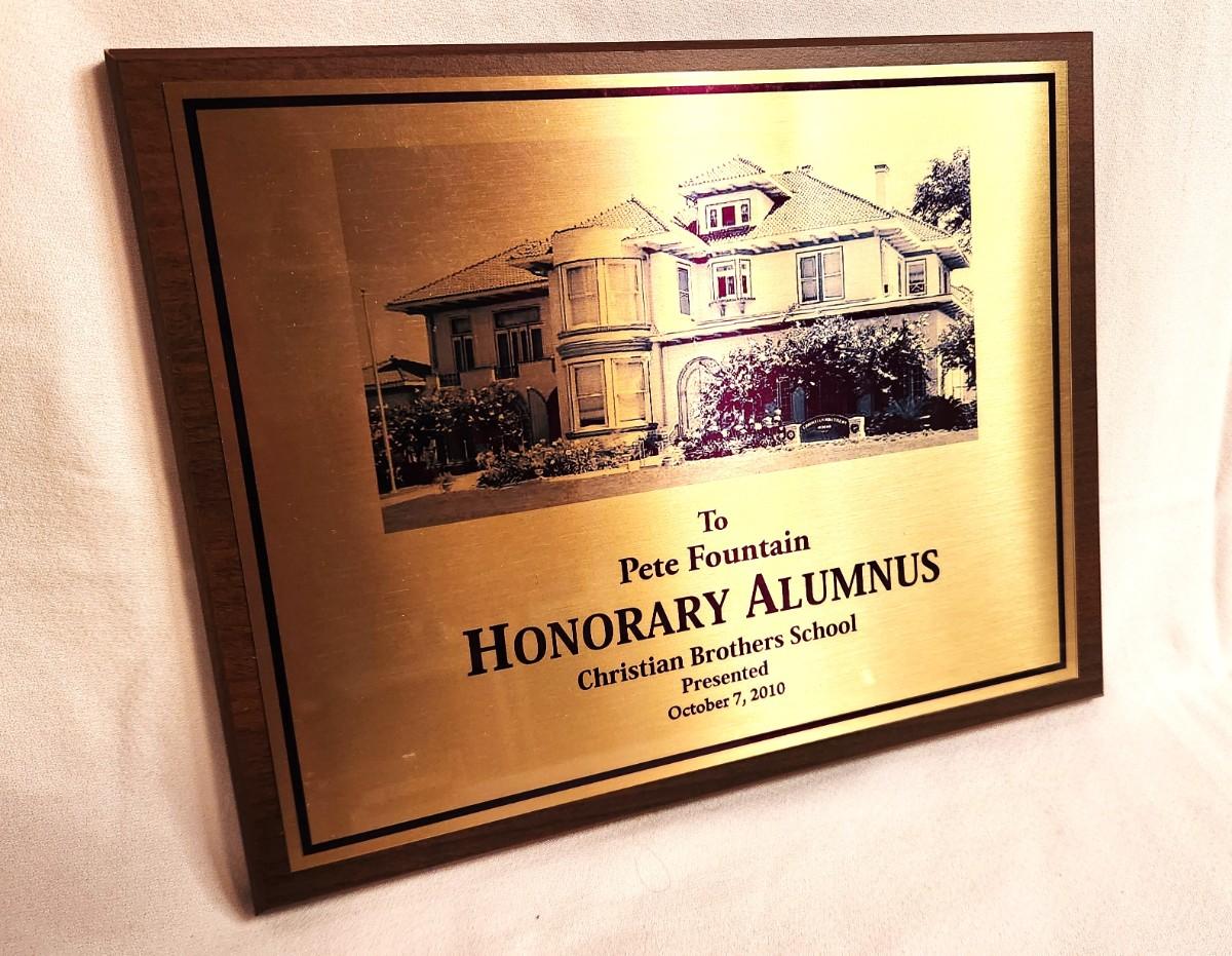 Award from Christian Brothers School naming Pete Fountain an Honorary Alumnus - dated 2010. Metal on wooden mount, 13" x 11" - good condition.