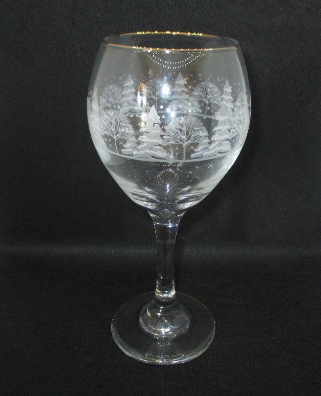 Very pretty wine stems that would be great for the winter season, but are not Christmas specific. Each is about 7.75" tall, is etched with a variety of trees that are now-capped, and have a gold paint around the bowl's rim. The gold paint is in excellent condition.