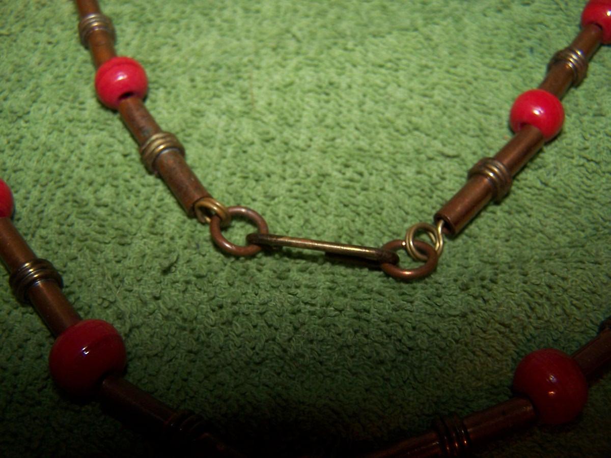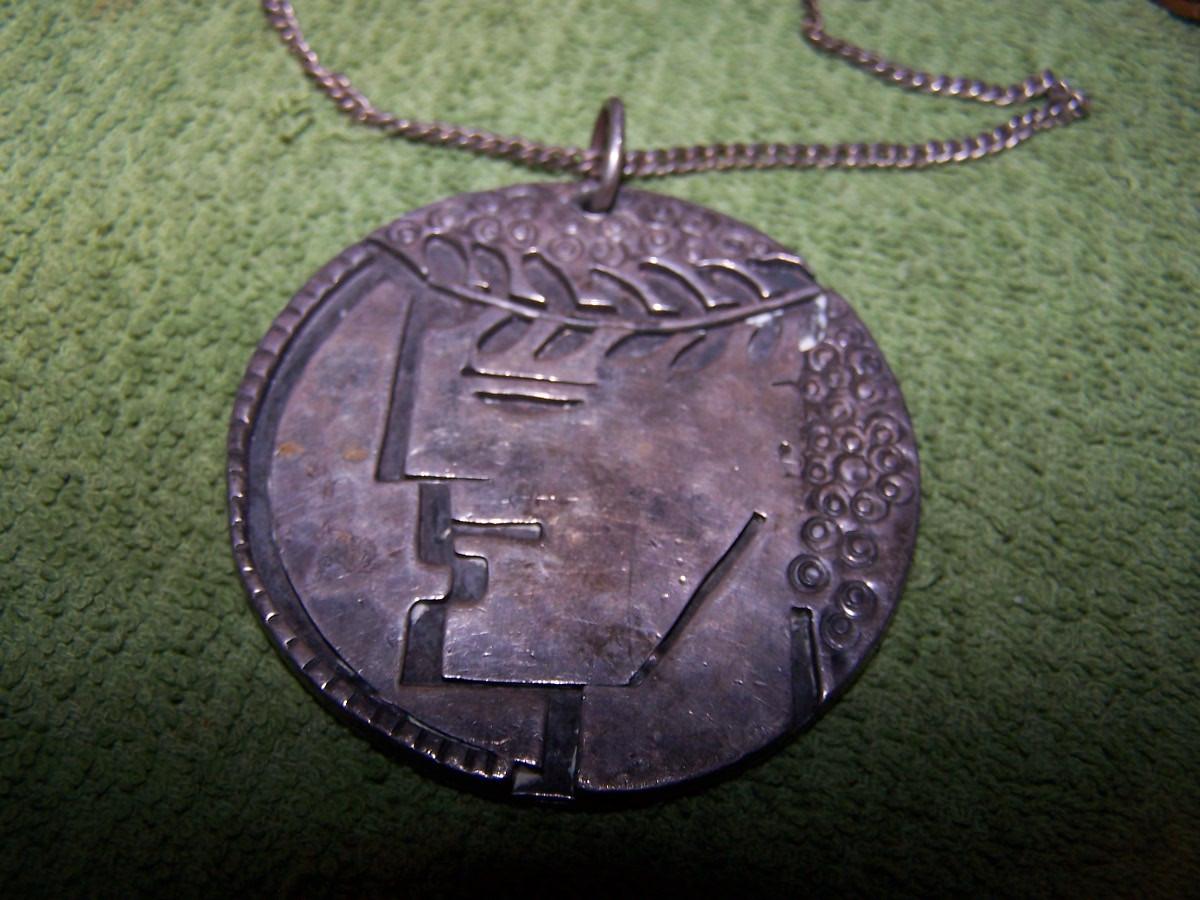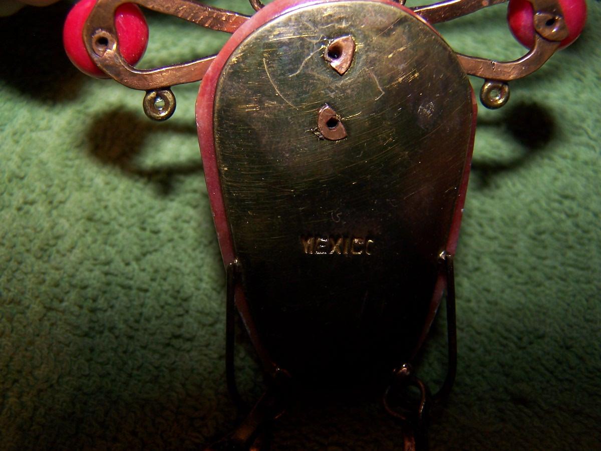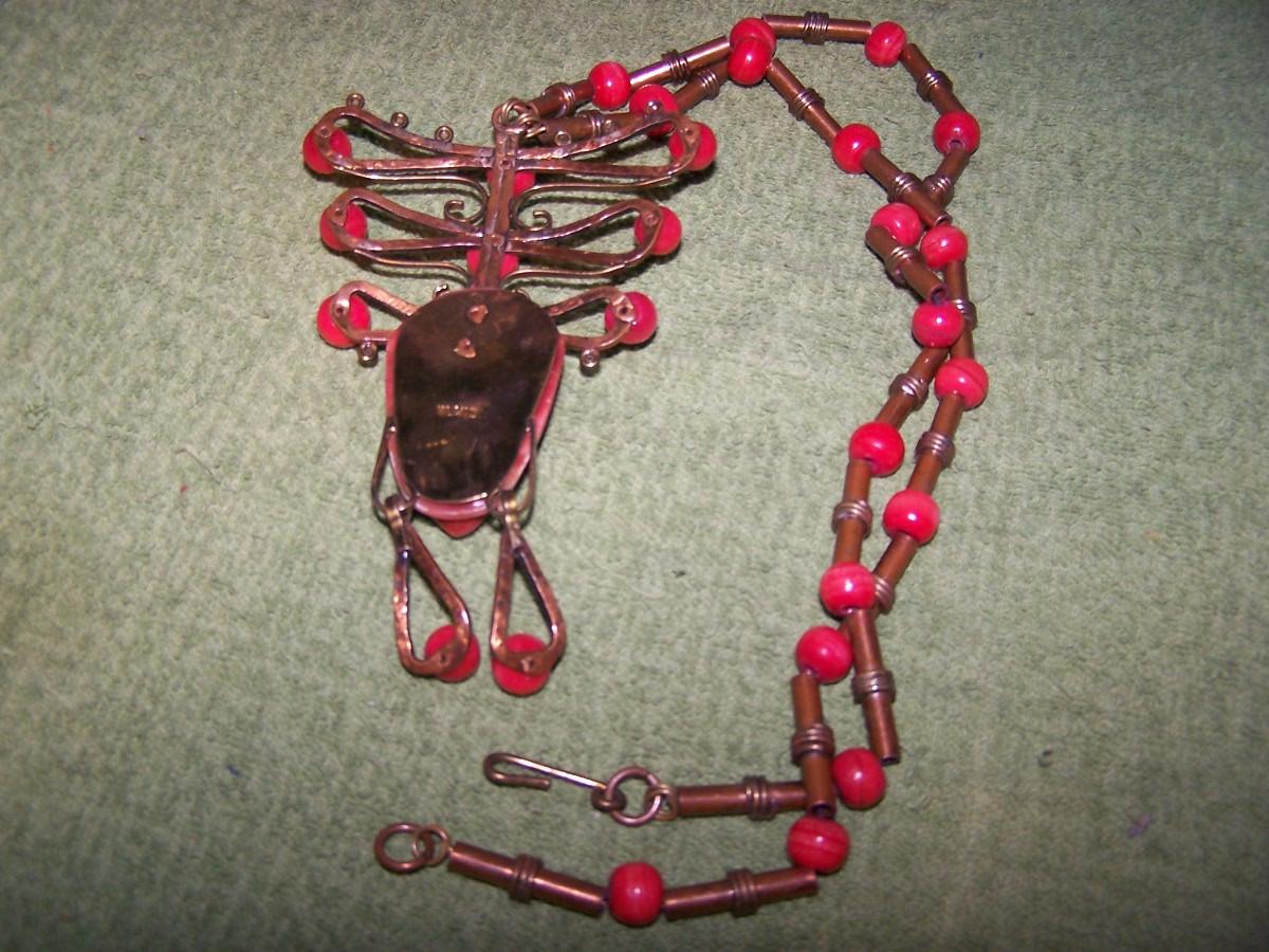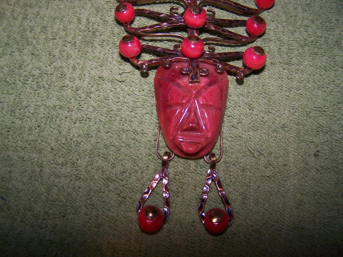 THESE ARE SPECTACULAR MID CENTURY LARGE NECKLACES!!! THE MEXICAN NECKLACE IS COPPER WITH ORANGE CORAL(I THINK)., IS 28 1/2'' LONG. THE REBAJES PENDANT IS 2 1/4'' ACROSS. LIGHT WEAR...