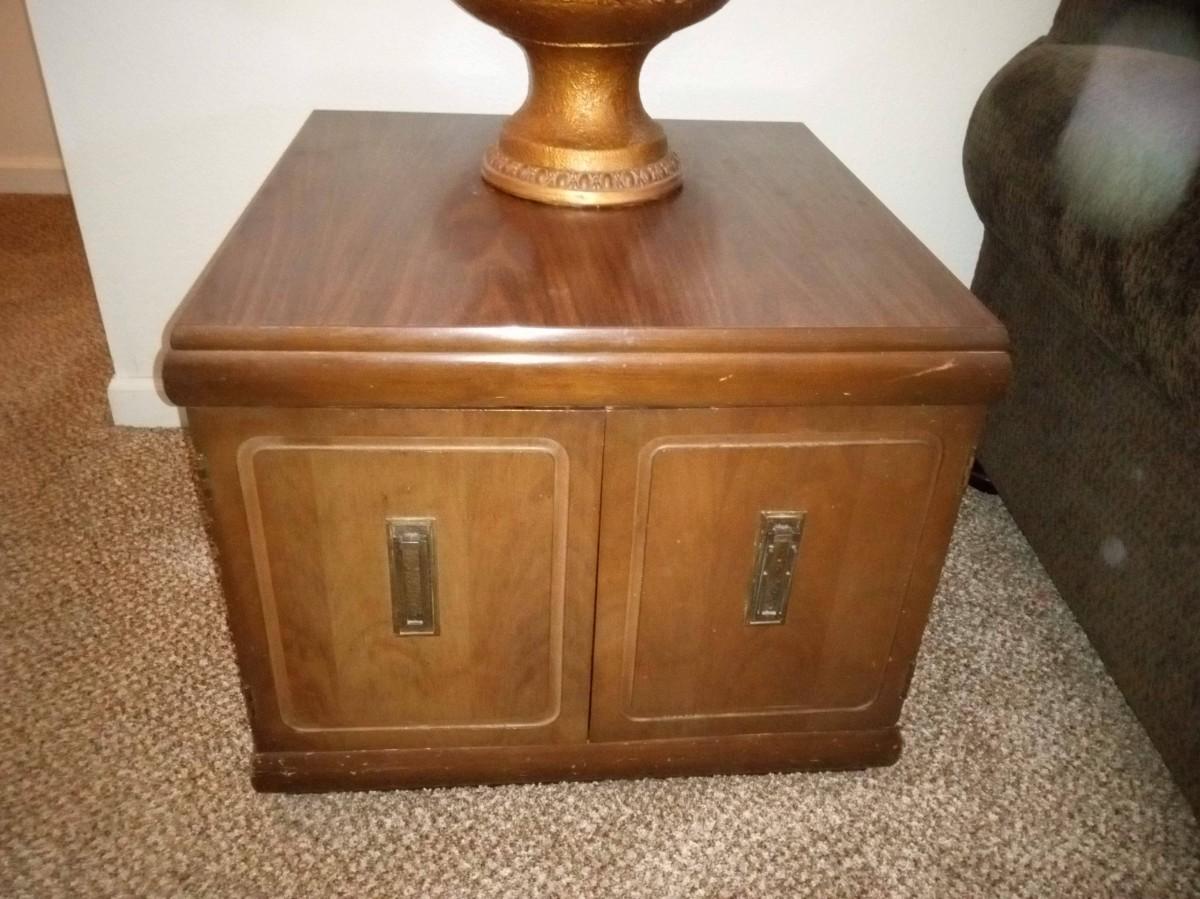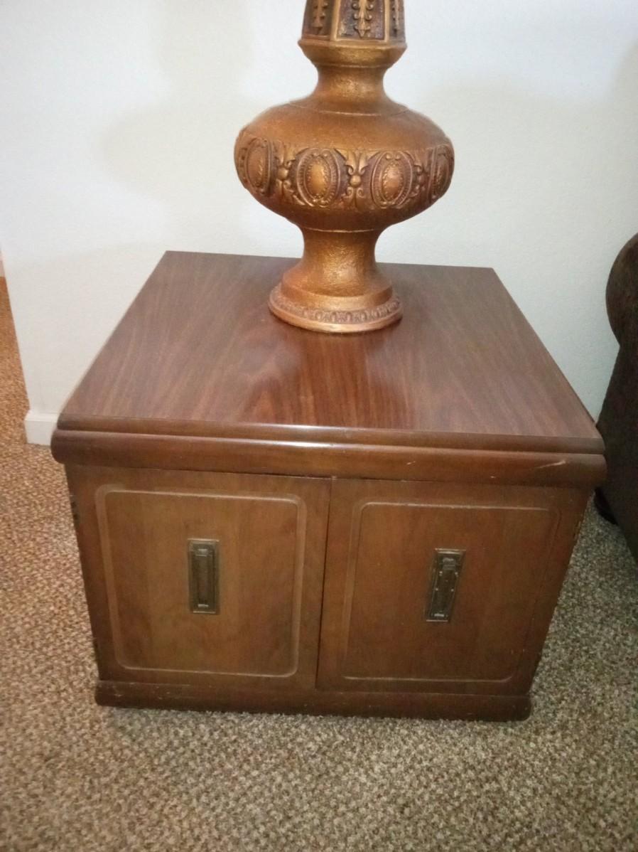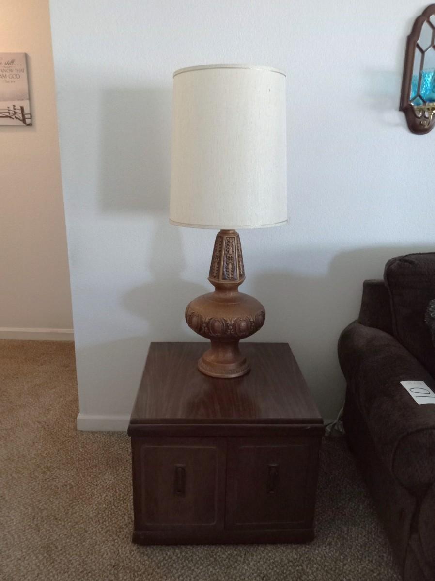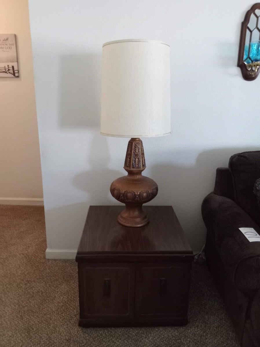 PERFECT FOR ANY LIVING ROOM/BEDROOM THIS TABLE LAMP IS 40" TALL WITH A BEAUTIFUL DESIGN ON THE BASE AND WHITE CYLINDER LAMP SHADE. THE END TABLE IS 24×20 WITH TWO CABINET DOORS THAT OPEN IT IS IN GREAT SHAPE