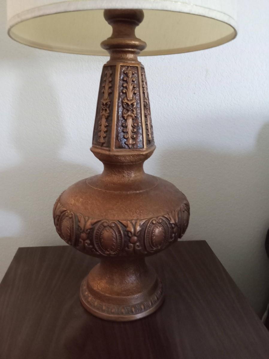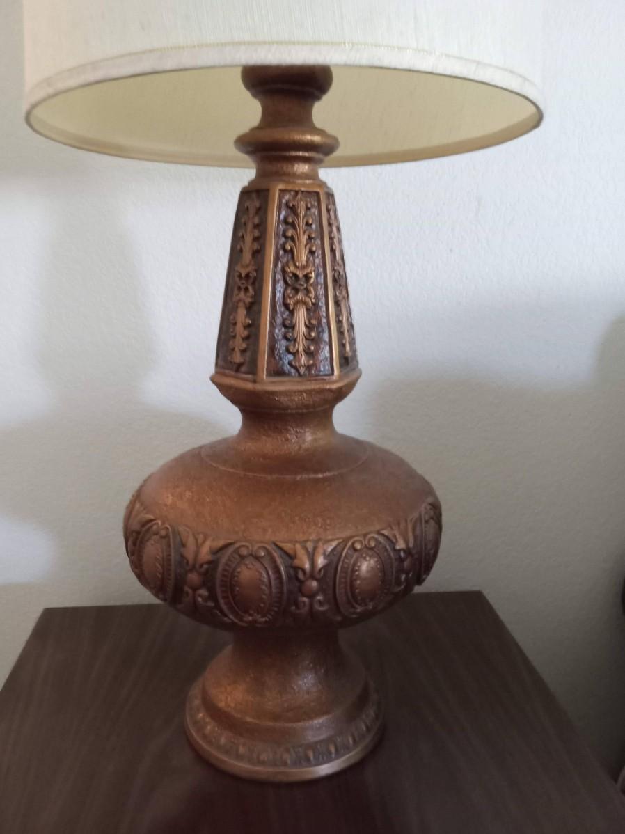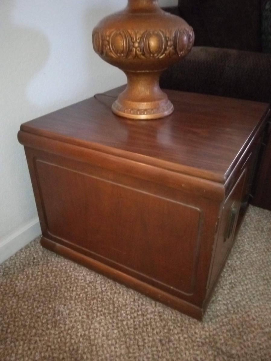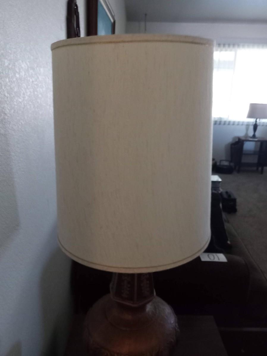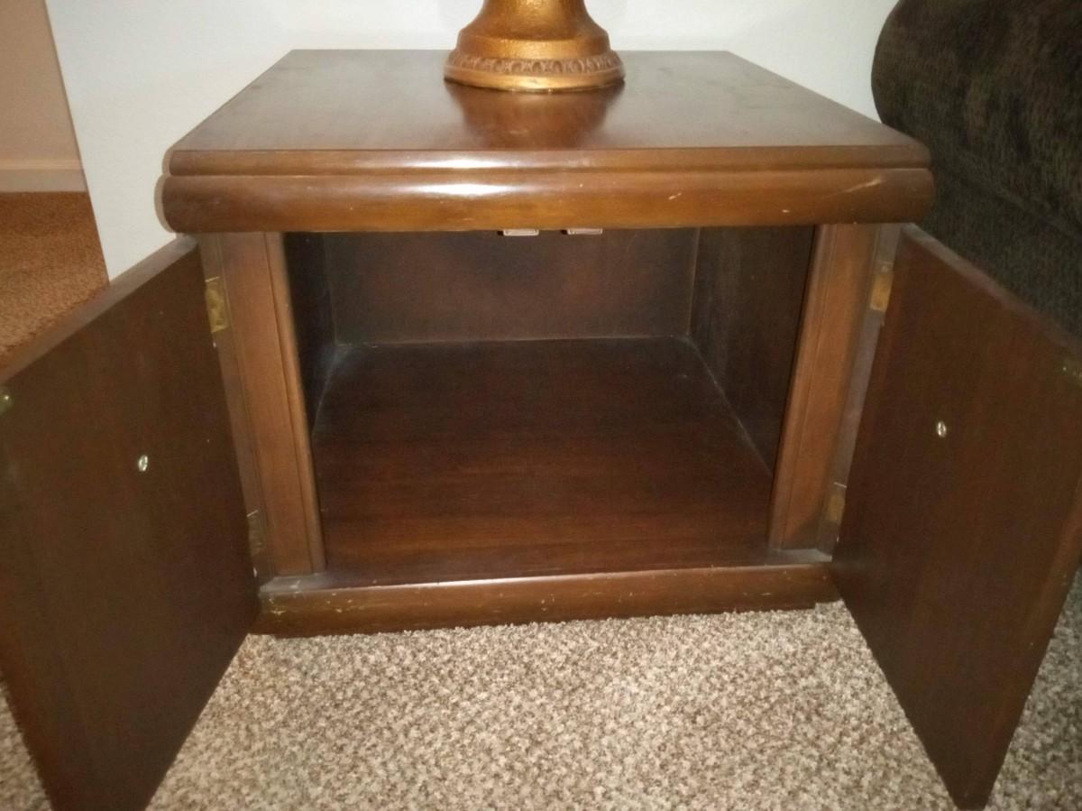 PERFECT FOR ANY LIVING ROOM/BEDROOM THIS TABLE LAMP IS 40" TALL WITH A BEAUTIFUL DESIGN ON THE BASE AND WHITE CYLINDER LAMP SHADE. THE END TABLE IS 24×20 WITH TWO CABINET DOORS THAT OPEN IT IS IN GREAT SHAPE