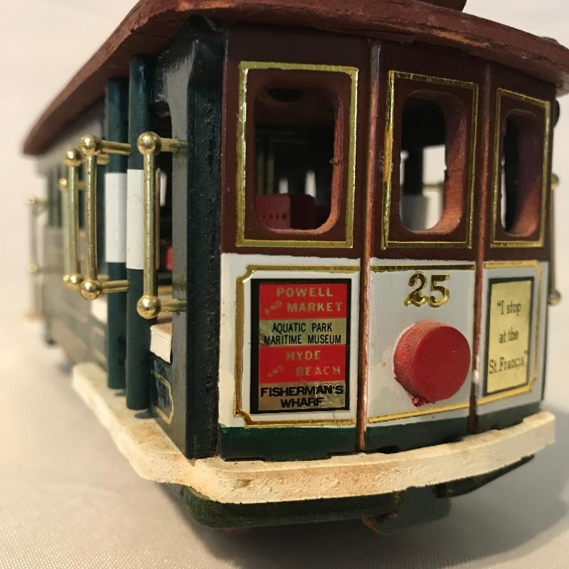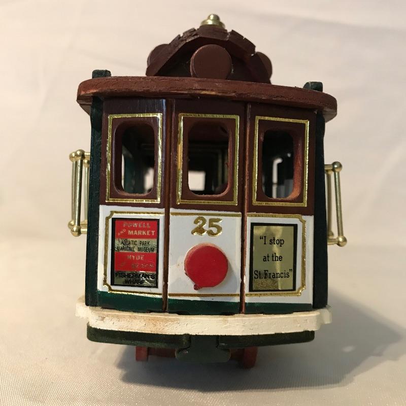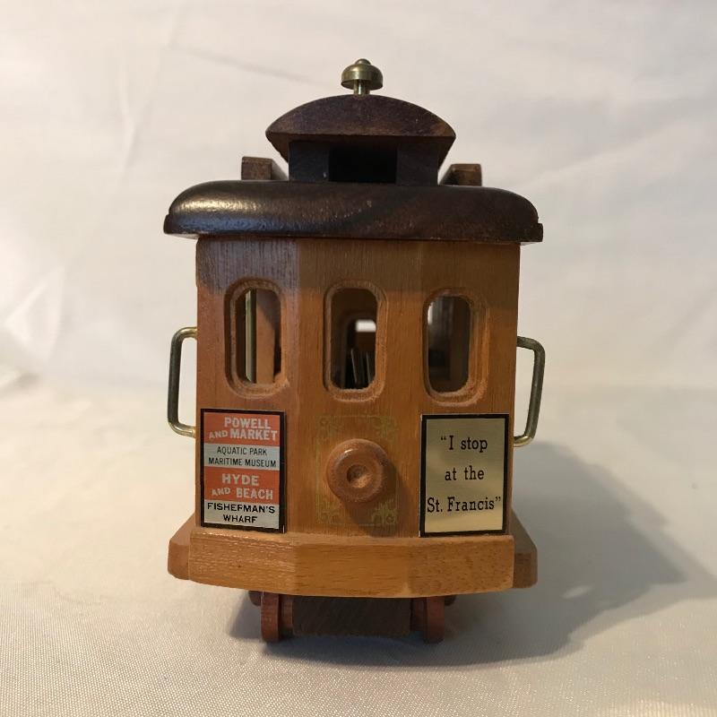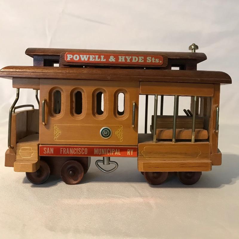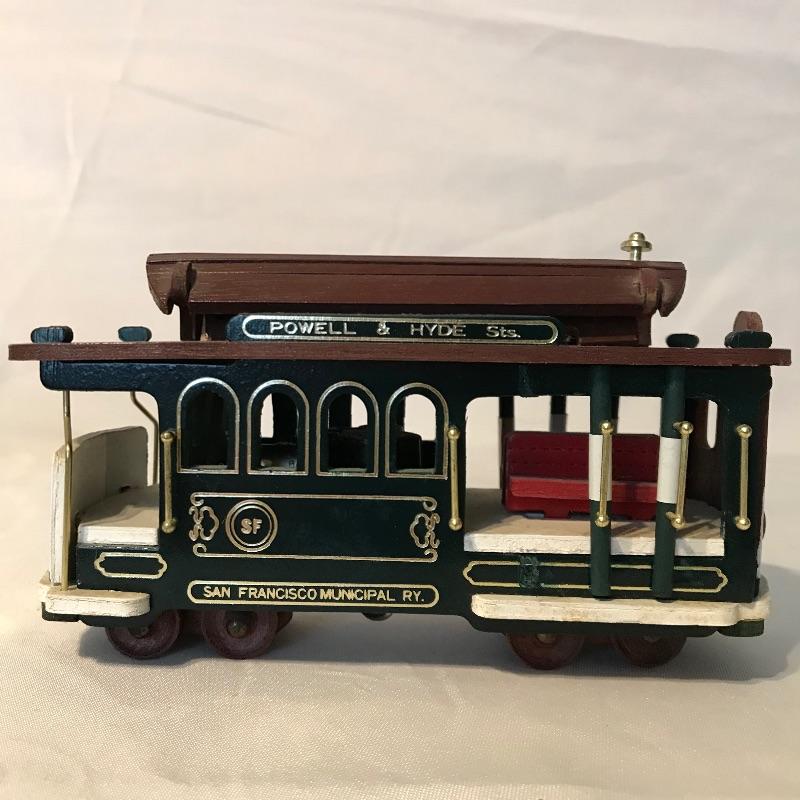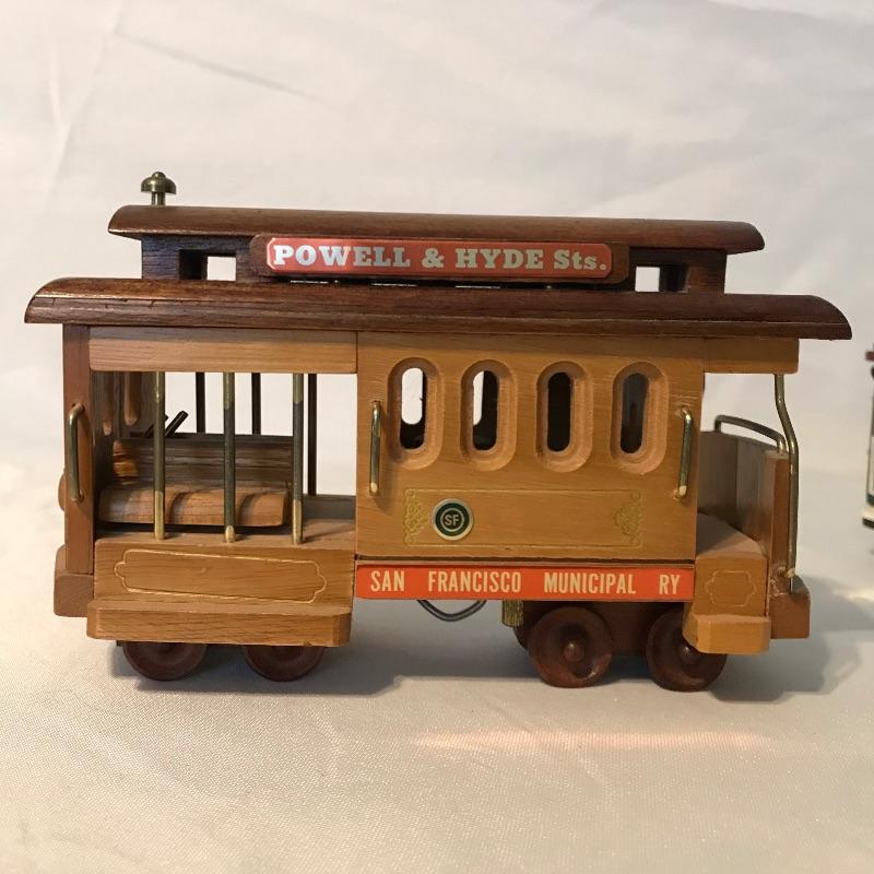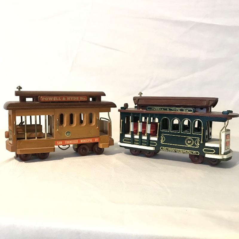 Two lovely Powell & Hyde musical cable cars ready to take you around San Francisco! Both have the same lovely melody and appear in very nice shape. The wood stained car has an on/off switch and is made of a heavier wood (possibly solid wood). The green car is lighter and is probably compiled from mostly pressed/ply wood. The green car also has one broken hand rail. Some glue and compressed air would likely get these two like new! See photos. Shipping available.