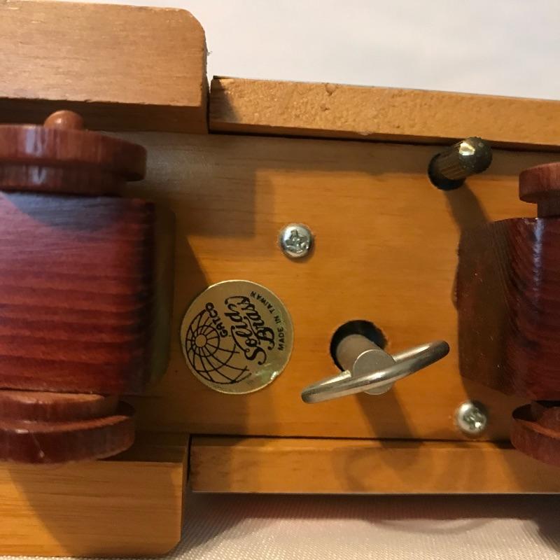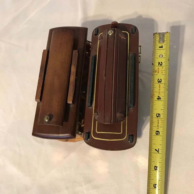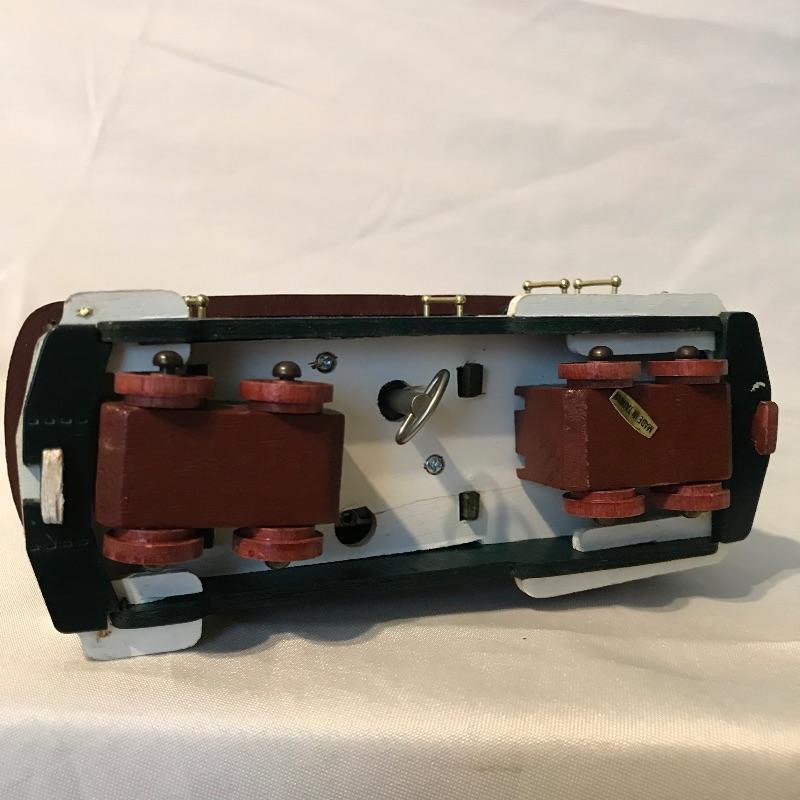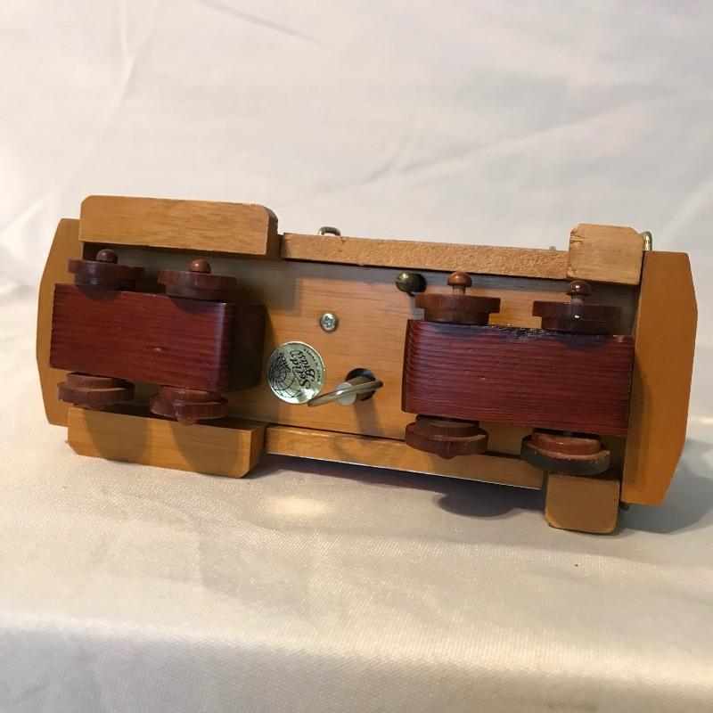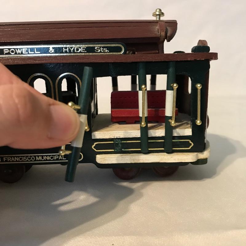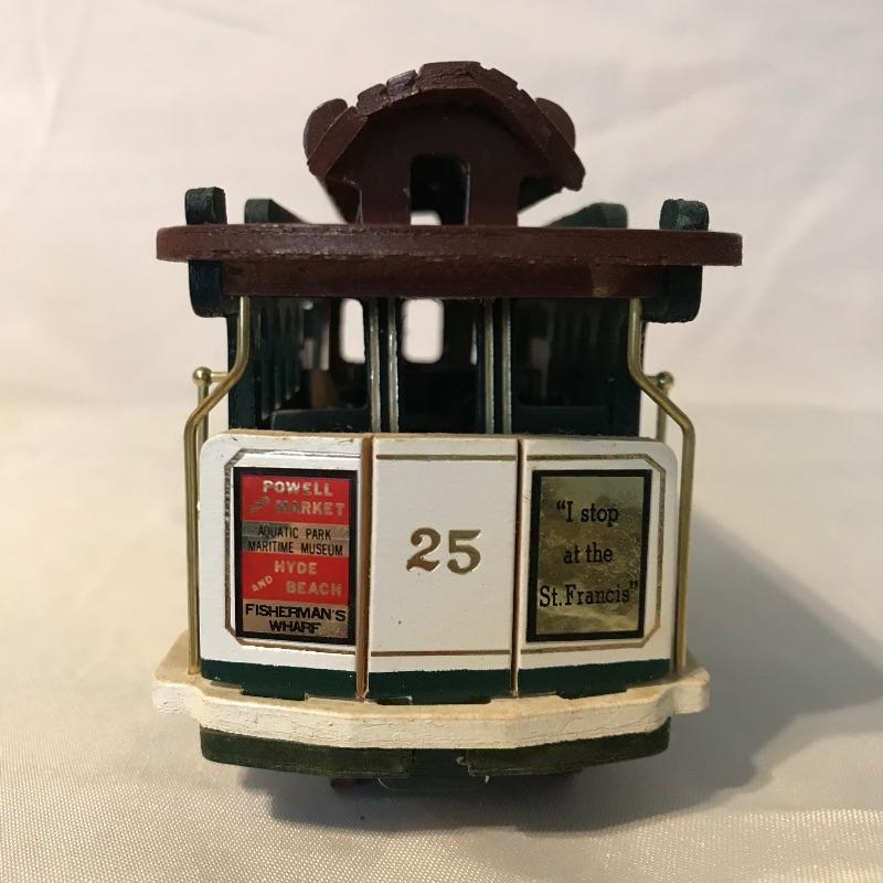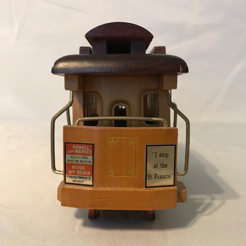 Two lovely Powell & Hyde musical cable cars ready to take you around San Francisco! Both have the same lovely melody and appear in very nice shape. The wood stained car has an on/off switch and is made of a heavier wood (possibly solid wood). The green car is lighter and is probably compiled from mostly pressed/ply wood. The green car also has one broken hand rail. Some glue and compressed air would likely get these two like new! See photos. Shipping available.