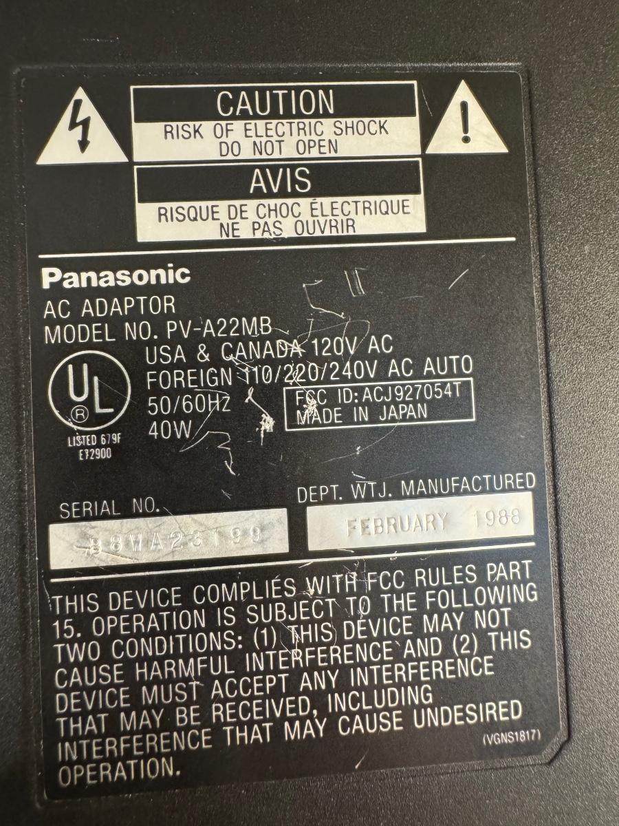 Includes Panasonic OnmiMovie HQ Video Camera, Panasonic AC Adapter model PV A22MB, Varta Video Hightech battery pack VLAI-2 and hard carry case.