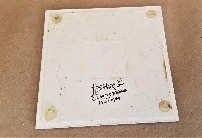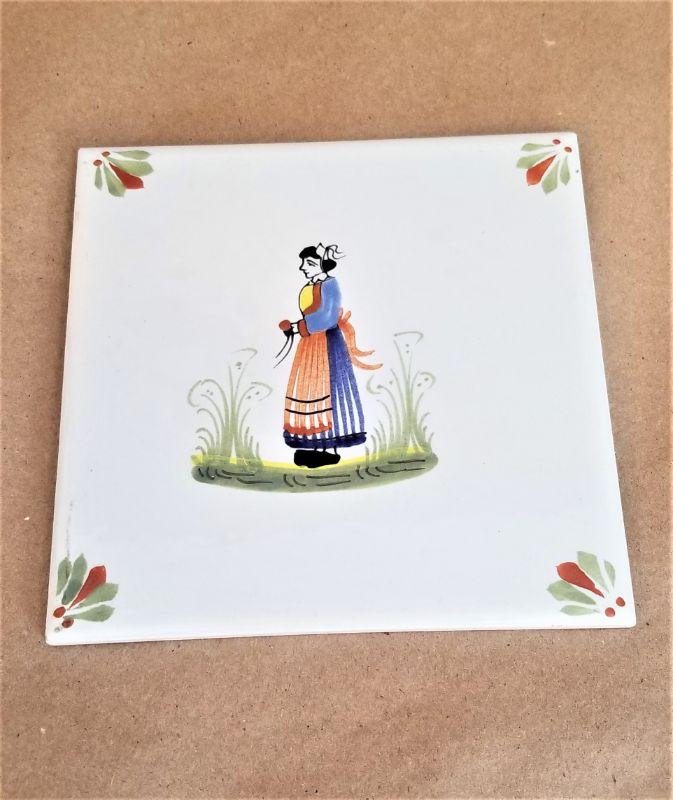 Sweet little Quimper tile featuring the figure of a Breton Lady on the front. Marked on reverse. Measures 6" x 6".
