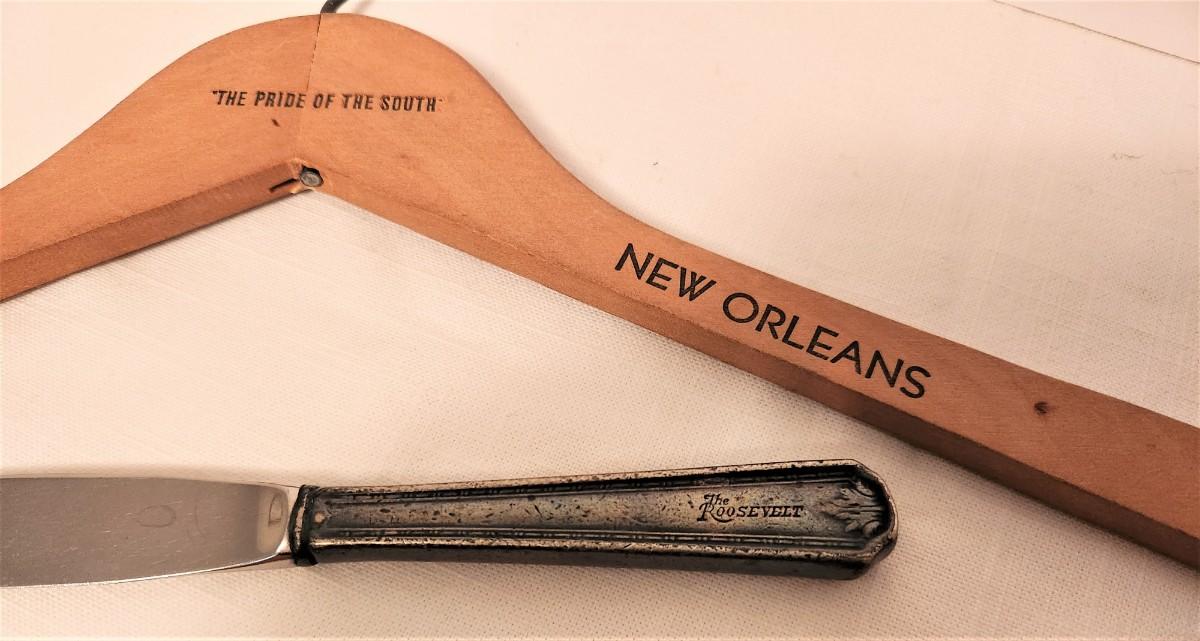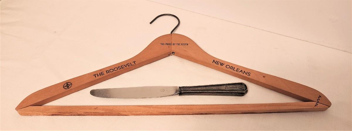 Two items from the old New Orleans Roosevelt Hotel, wooden hanger (17" across) and dinner knife (9" long).