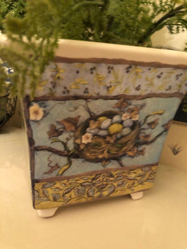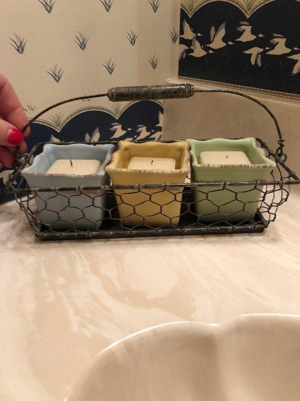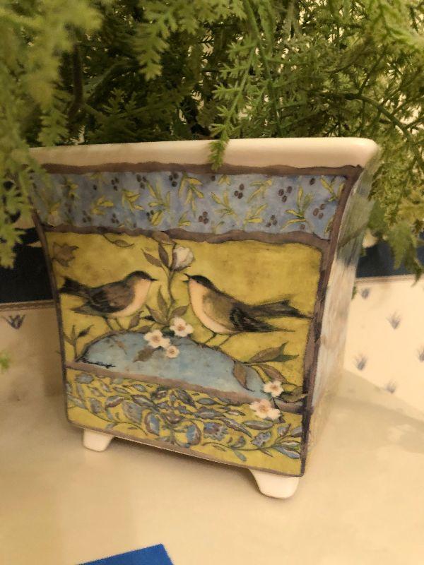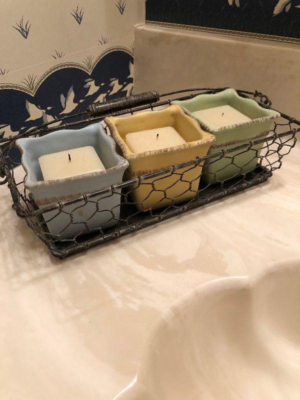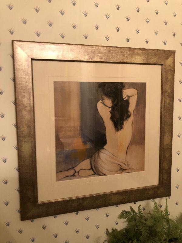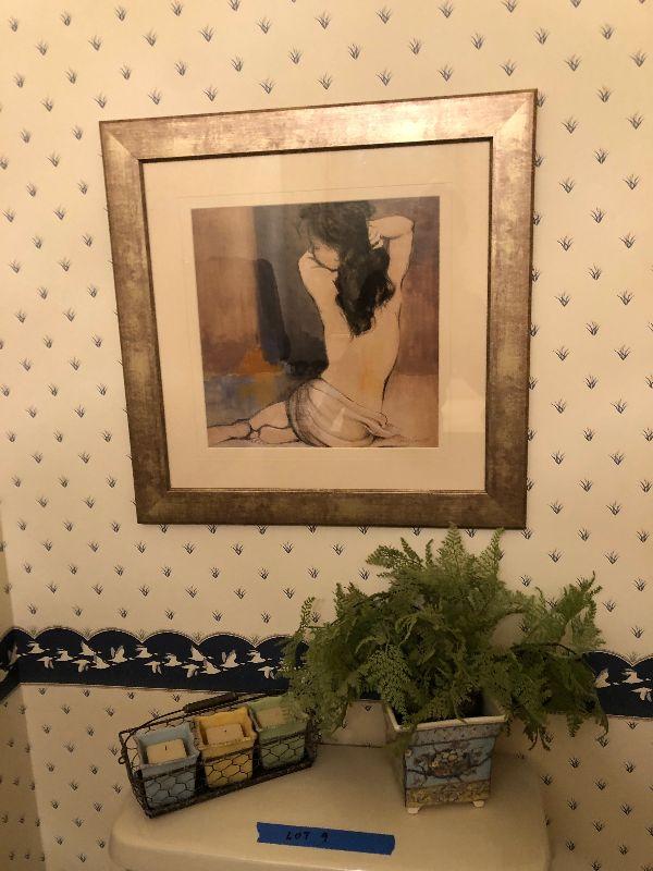 Framed Picture with Decorative Candle Holders and Fern in Decorative Ceramic Pot.