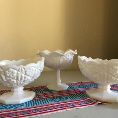 Beautiful set of white milk glass bowls, pedestals, goblets, and a tiny pour cup. Immaculate condition. Heavy to ship.