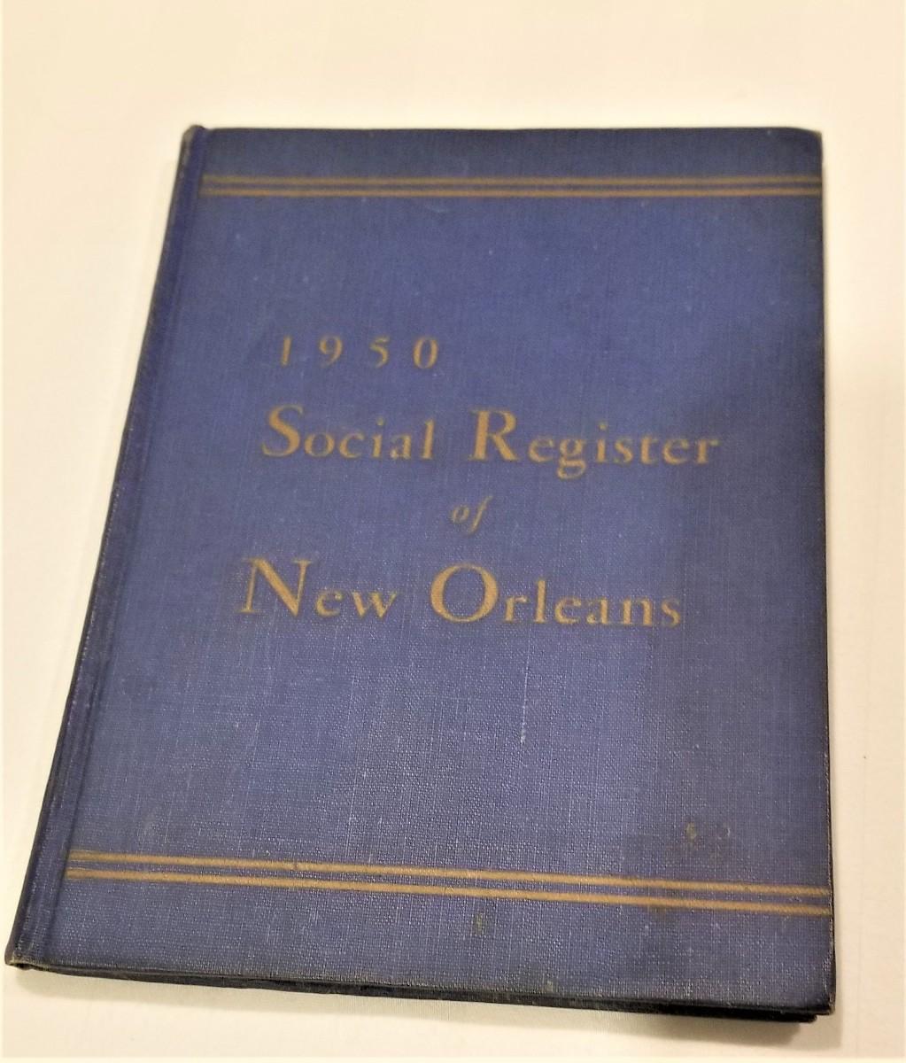 1950 New Orleans Social Register, hardcover, 127 pages. Names, addresses, and club affiliations of the New Orleans "society set" in 1950. List of clubs in the front that were considered "social" at the time. The book has a bit of foxing on the front few pages, but doesn't not affect content. Rather scarce, as they were never sold to the general public.