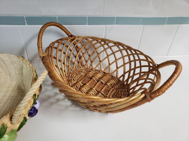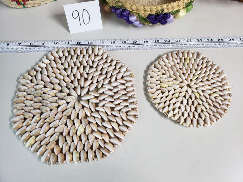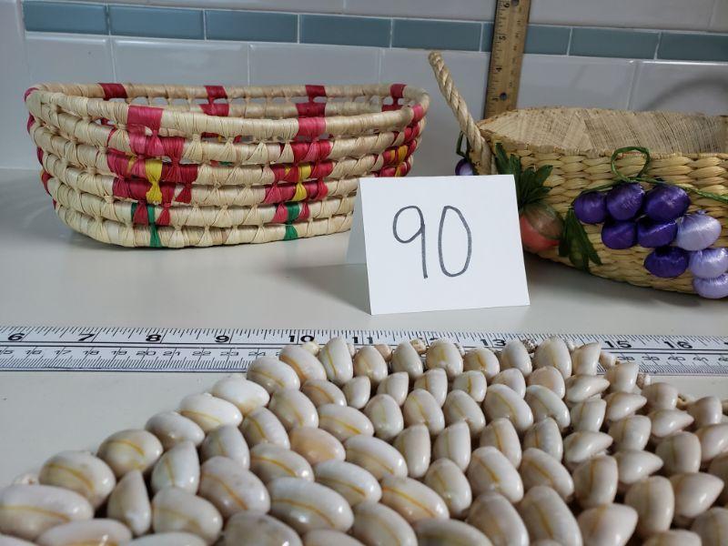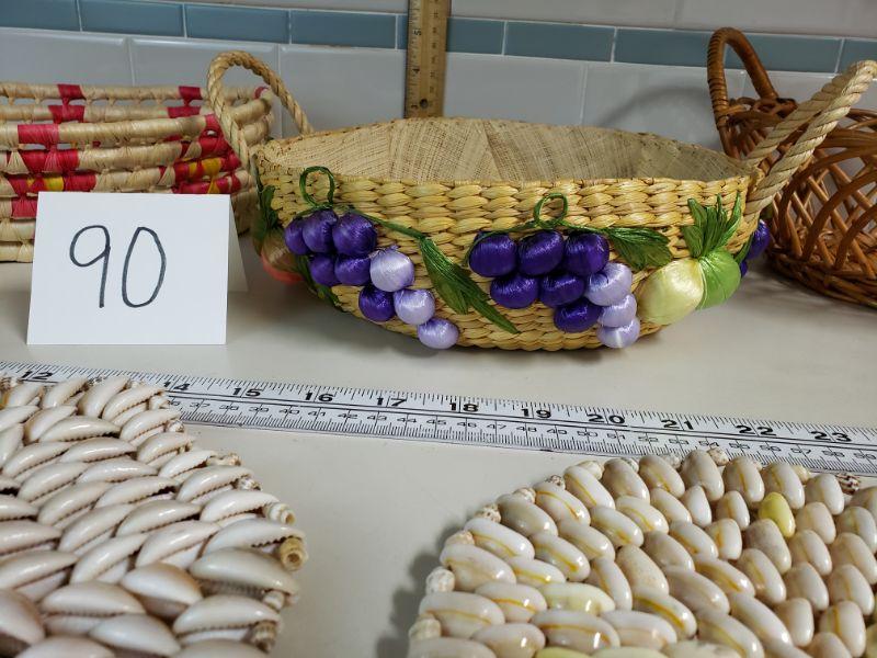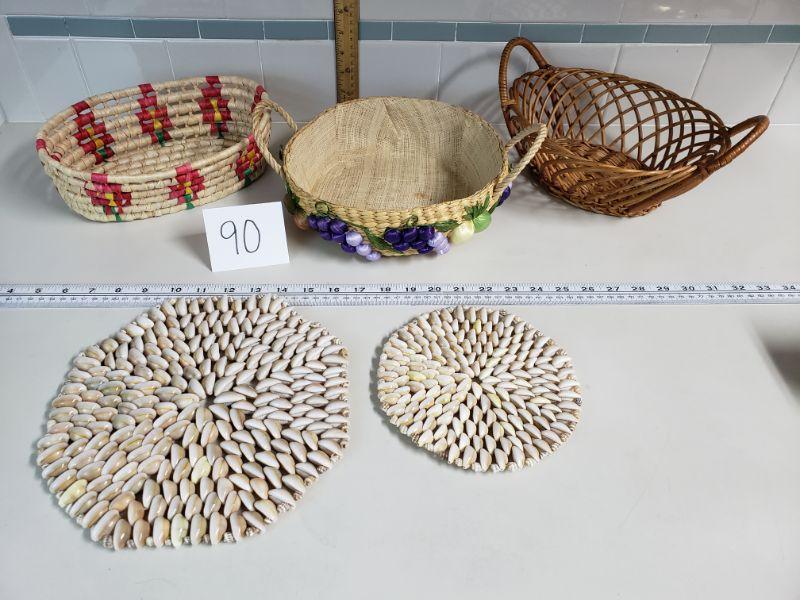 1 Pyrex size Basket, 2 bread basket sizes and shell hot pads.
