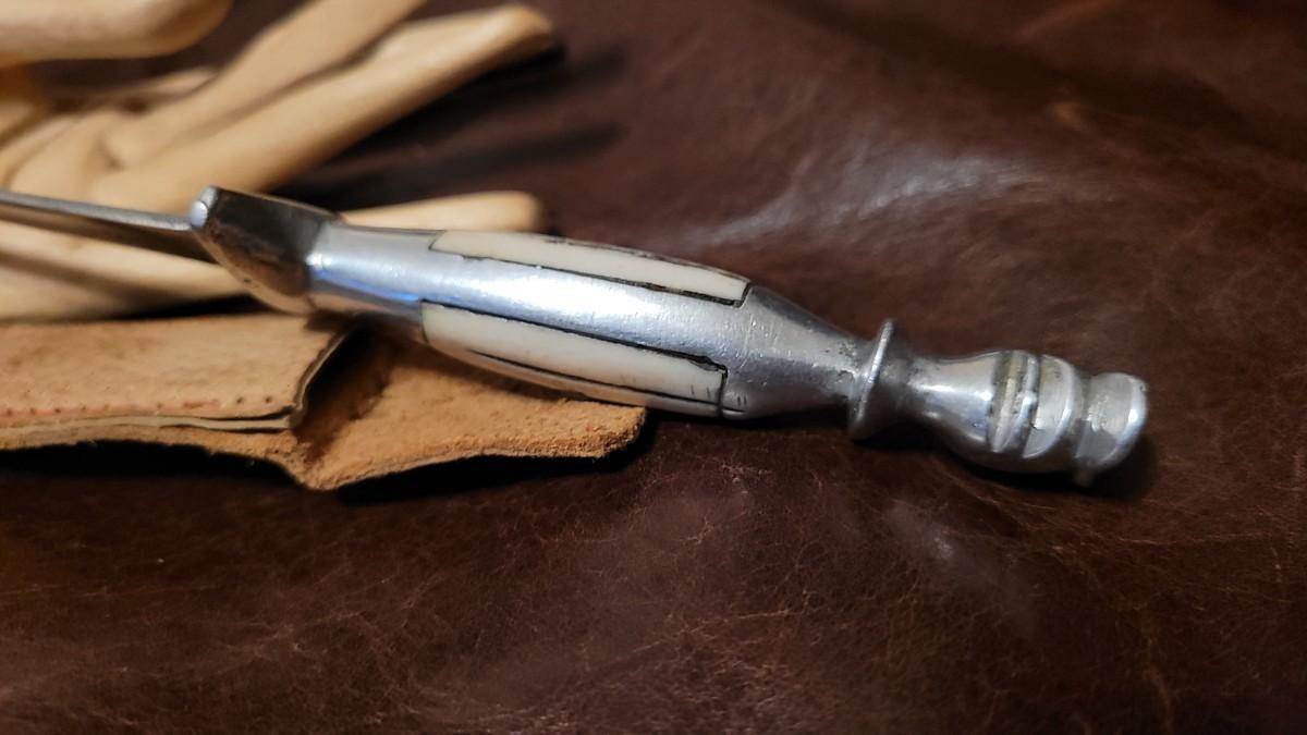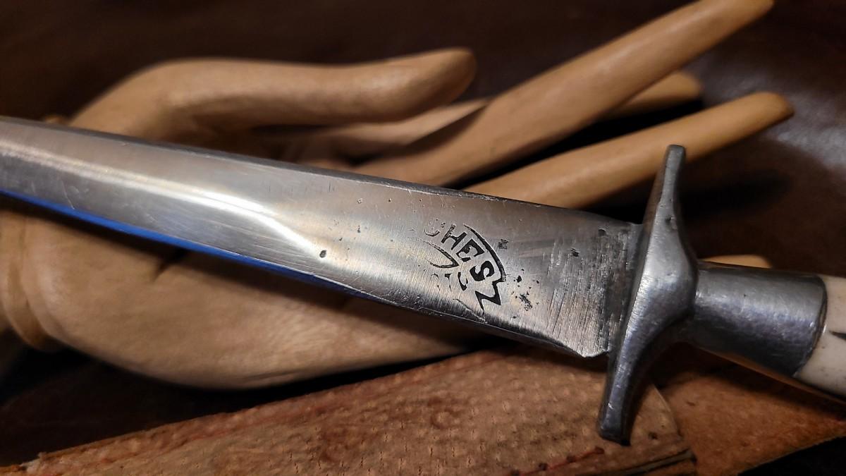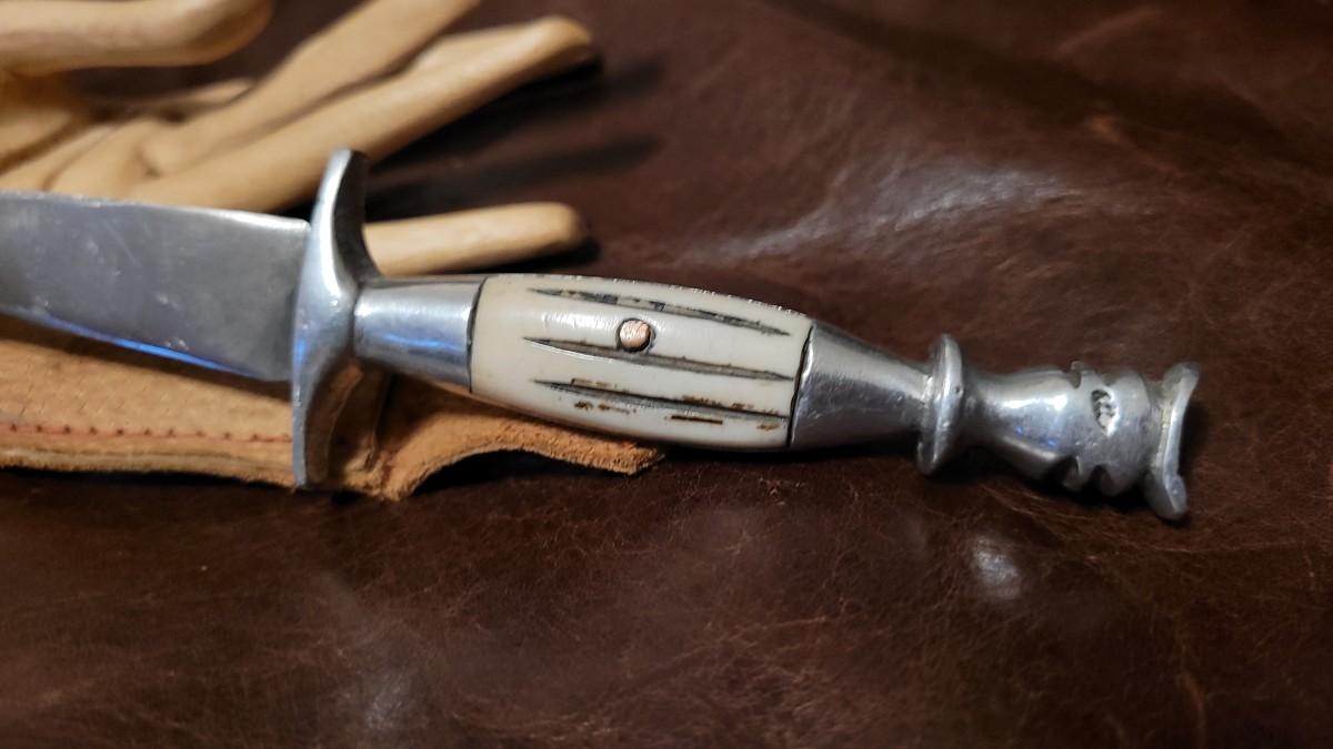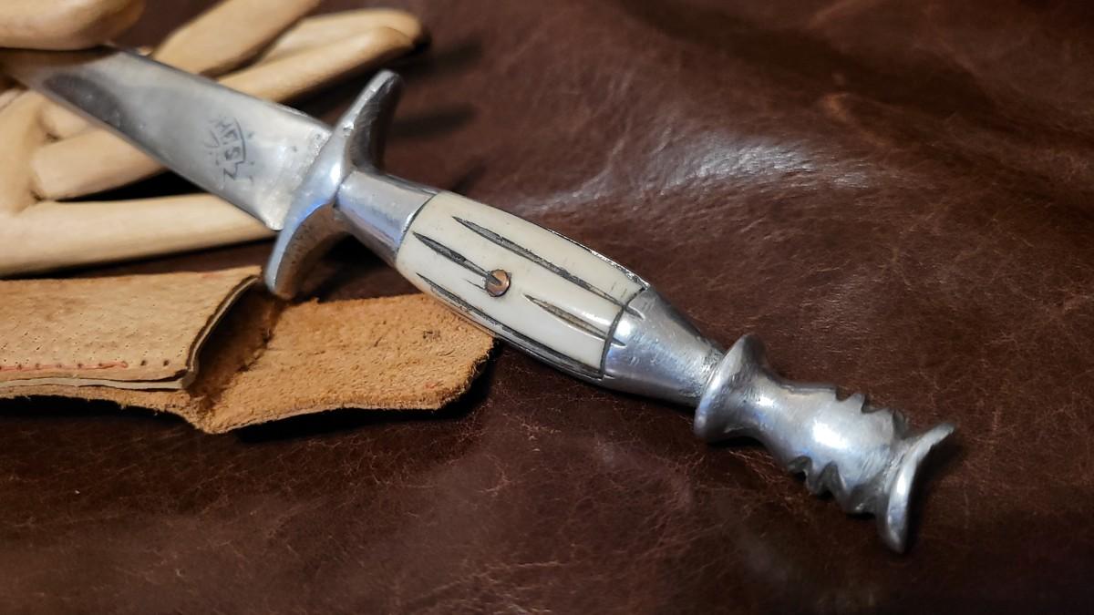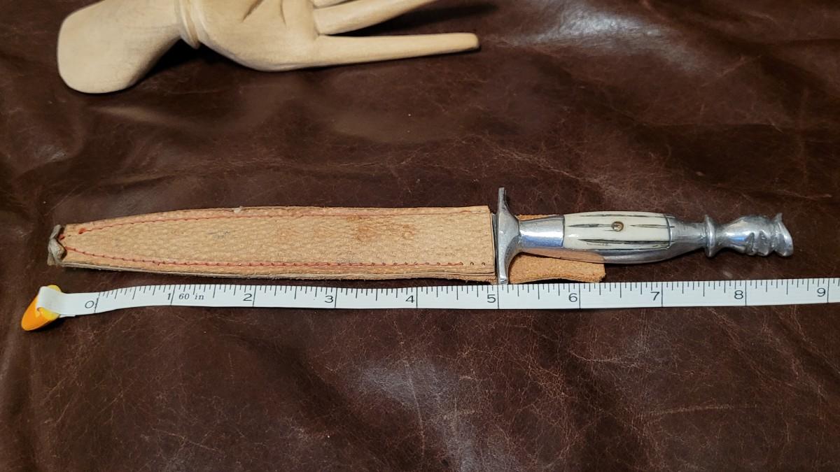 Very stylish Vintage Made in Mexico Shiny Dagger with Leather Sheath. Handle is complete and the blade is also complete with no major defects upon inspection.