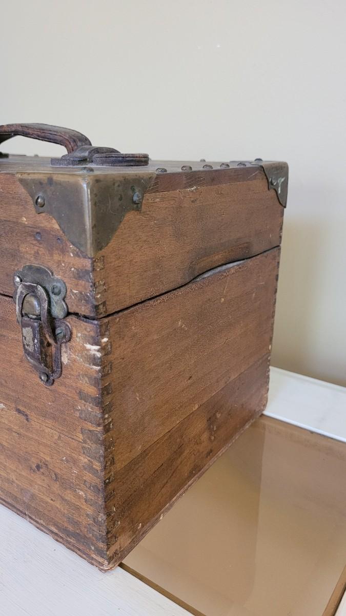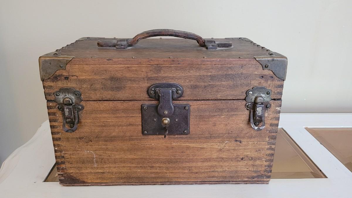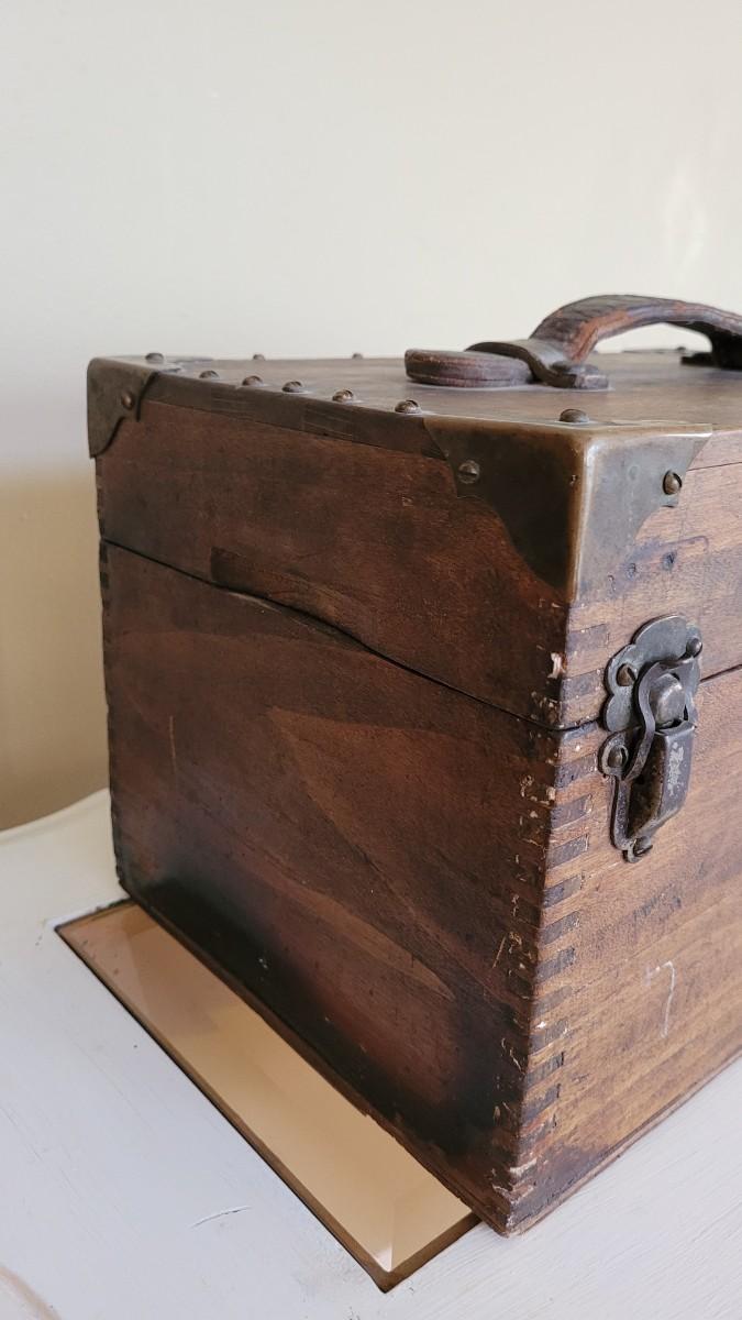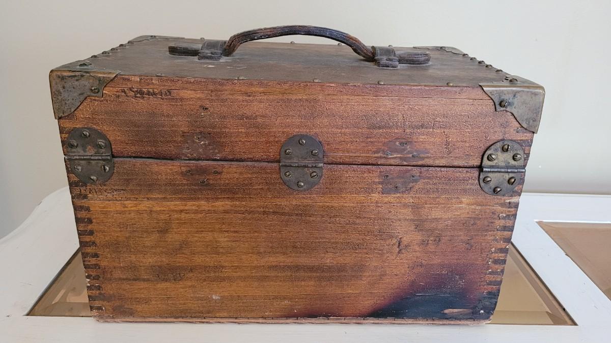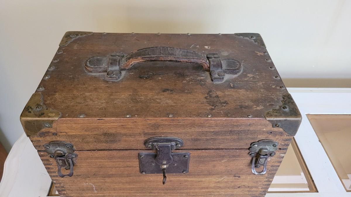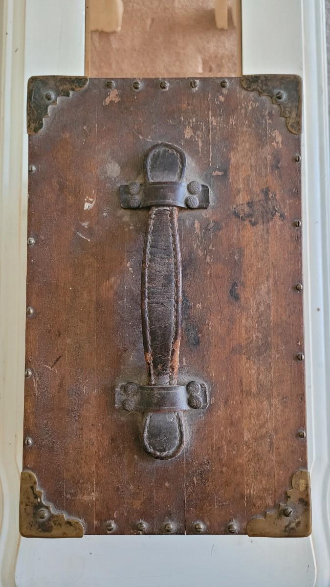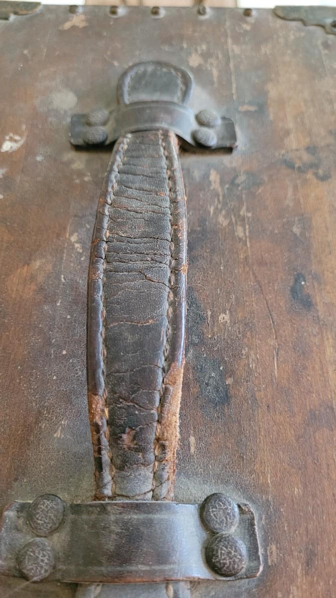 Lot 90: Antique Wood Chest with Leather Handle & Beautiful Metal Hardware