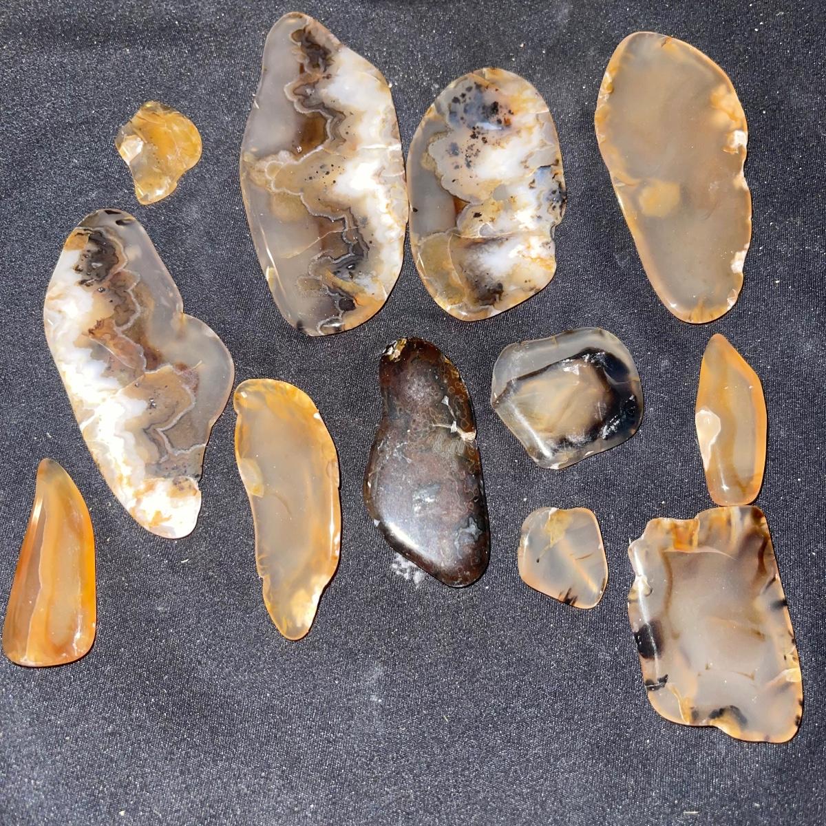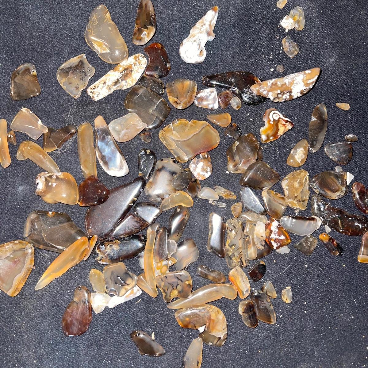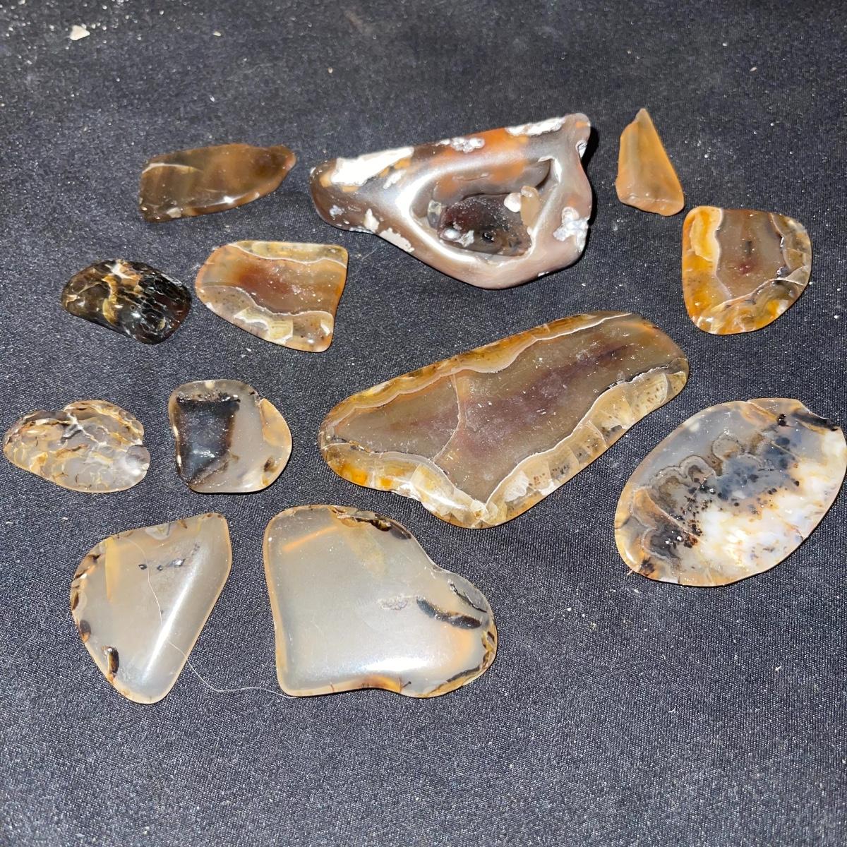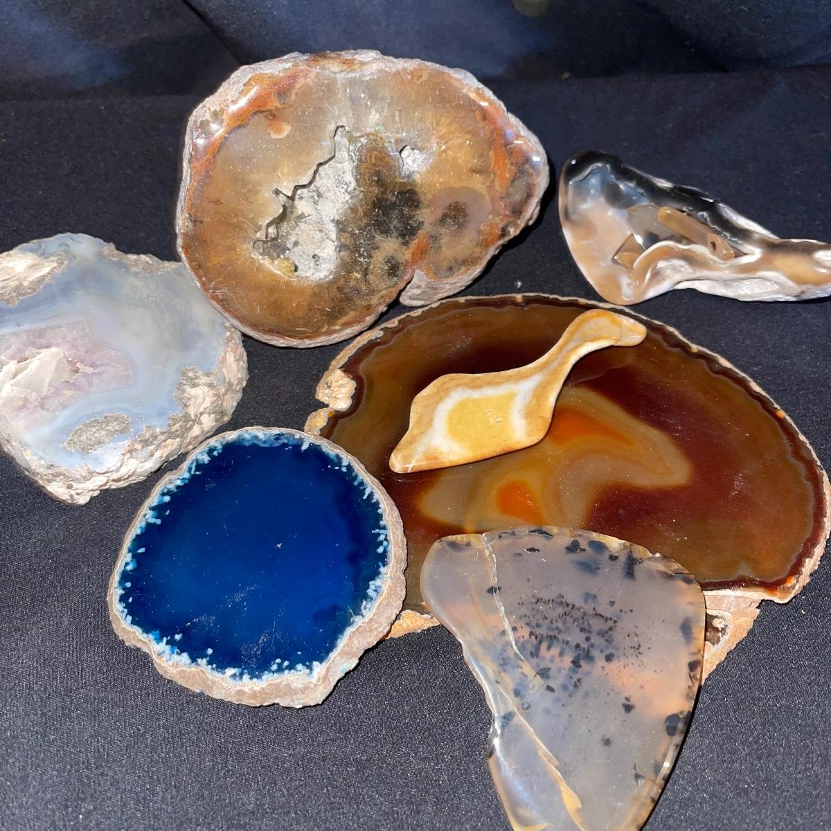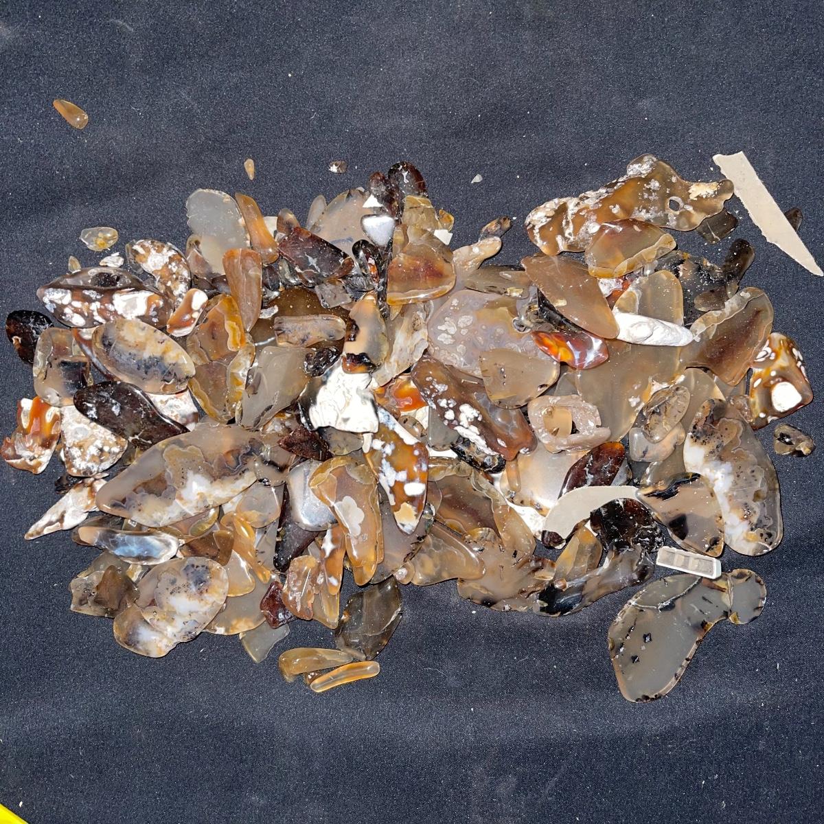 The majority of agate pieces in this lot are in the orange, red, brown,and white spectrums of color. There are some pieces with some blues and other hues, notably, a circular dark blue flat