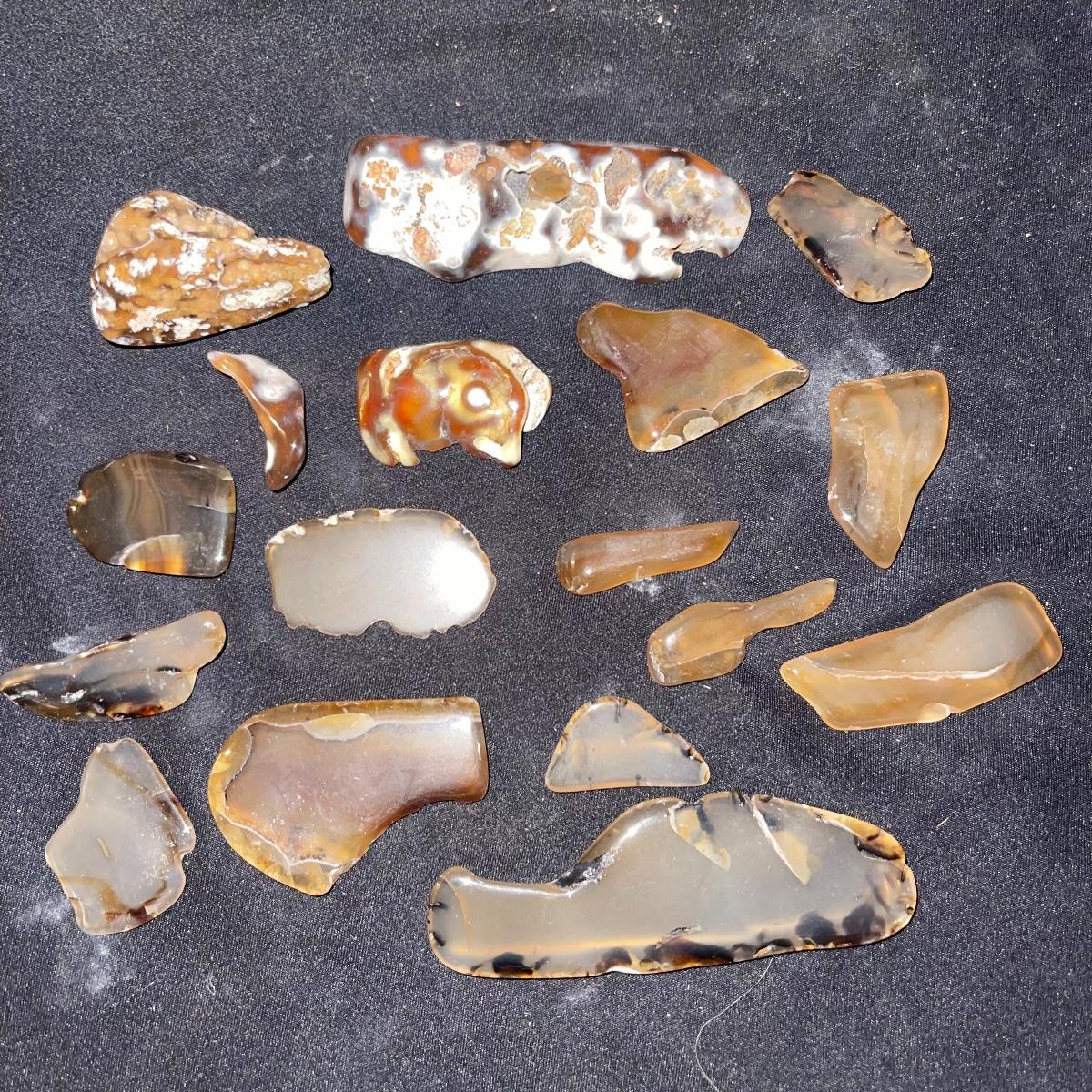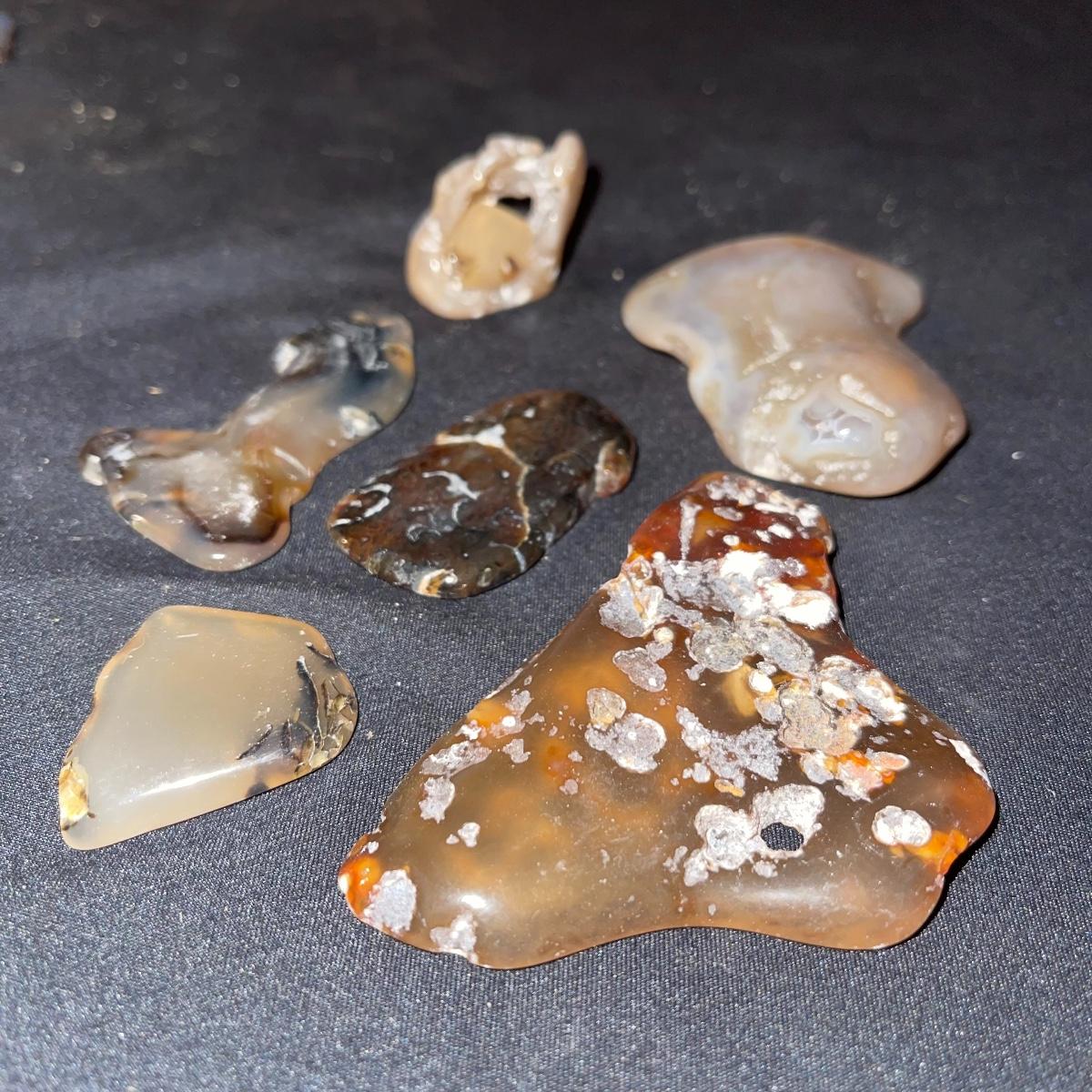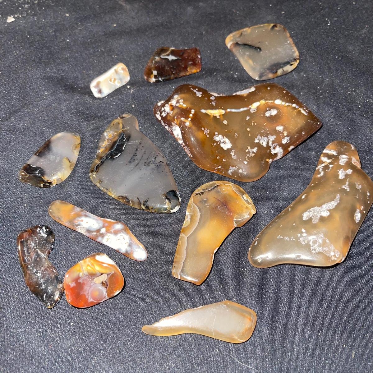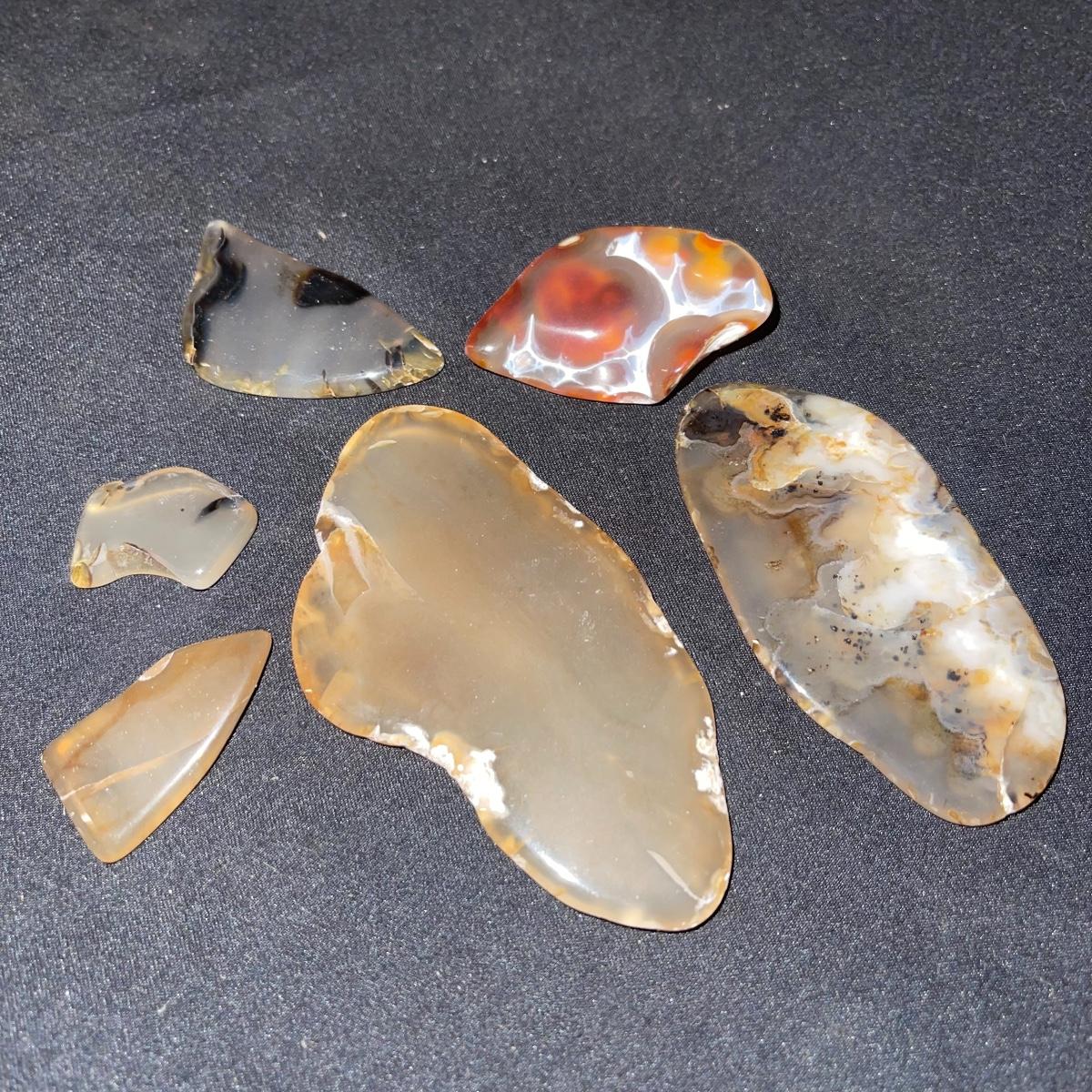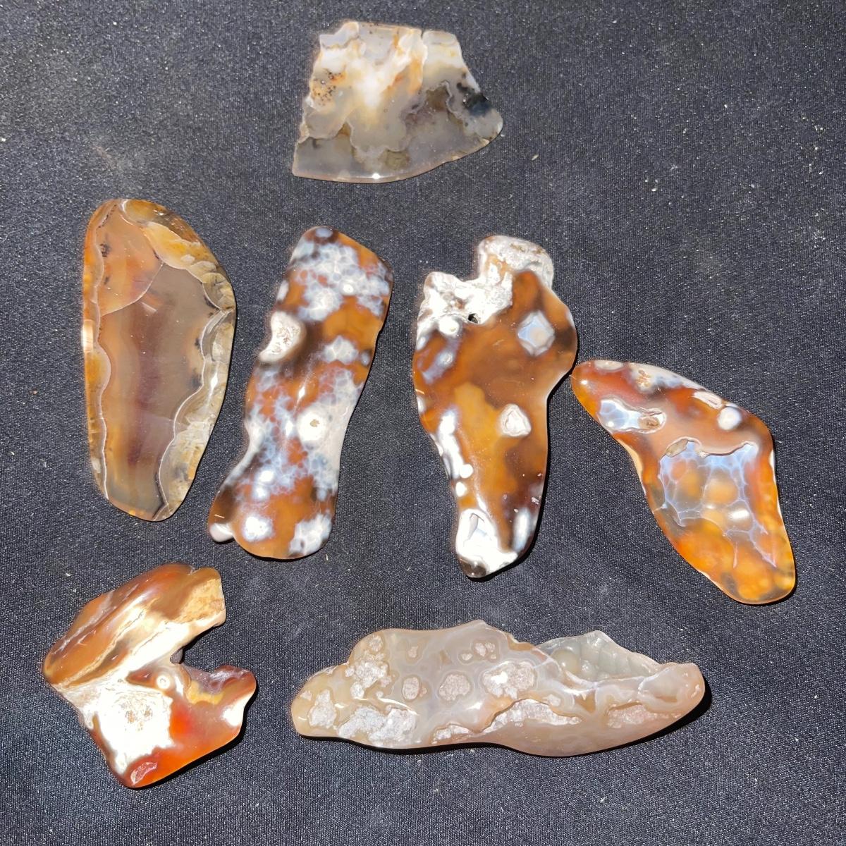 The majority of agate pieces in this lot are in the orange, red, brown,and white spectrums of color. There are some pieces with some blues and other hues, notably, a circular dark blue flat