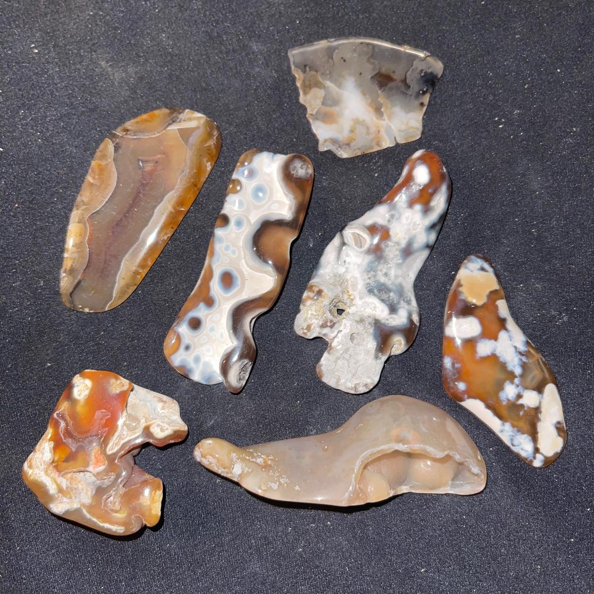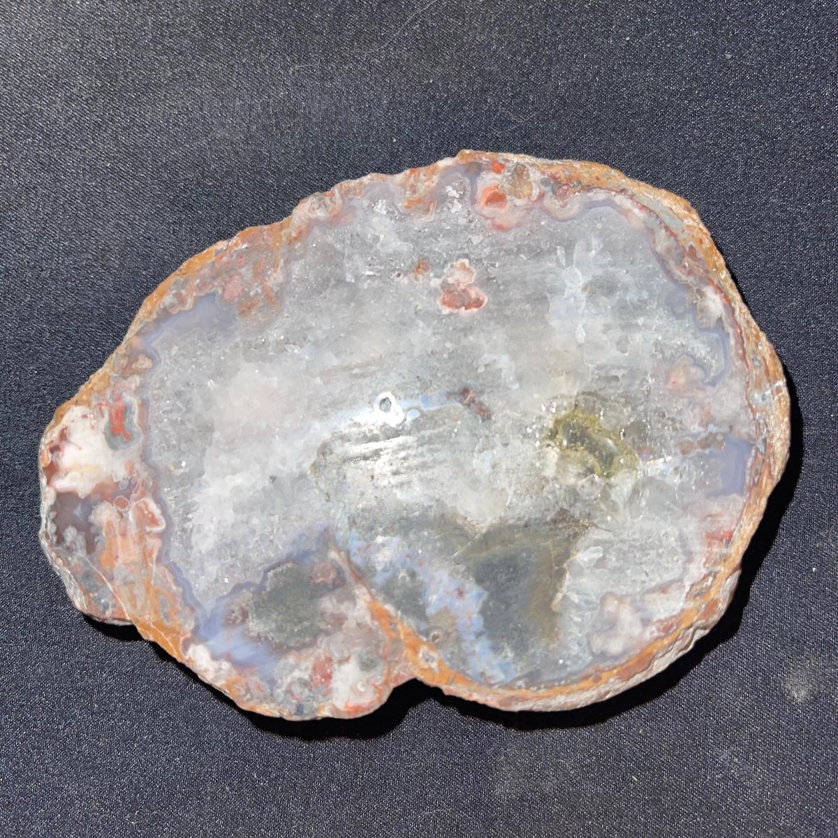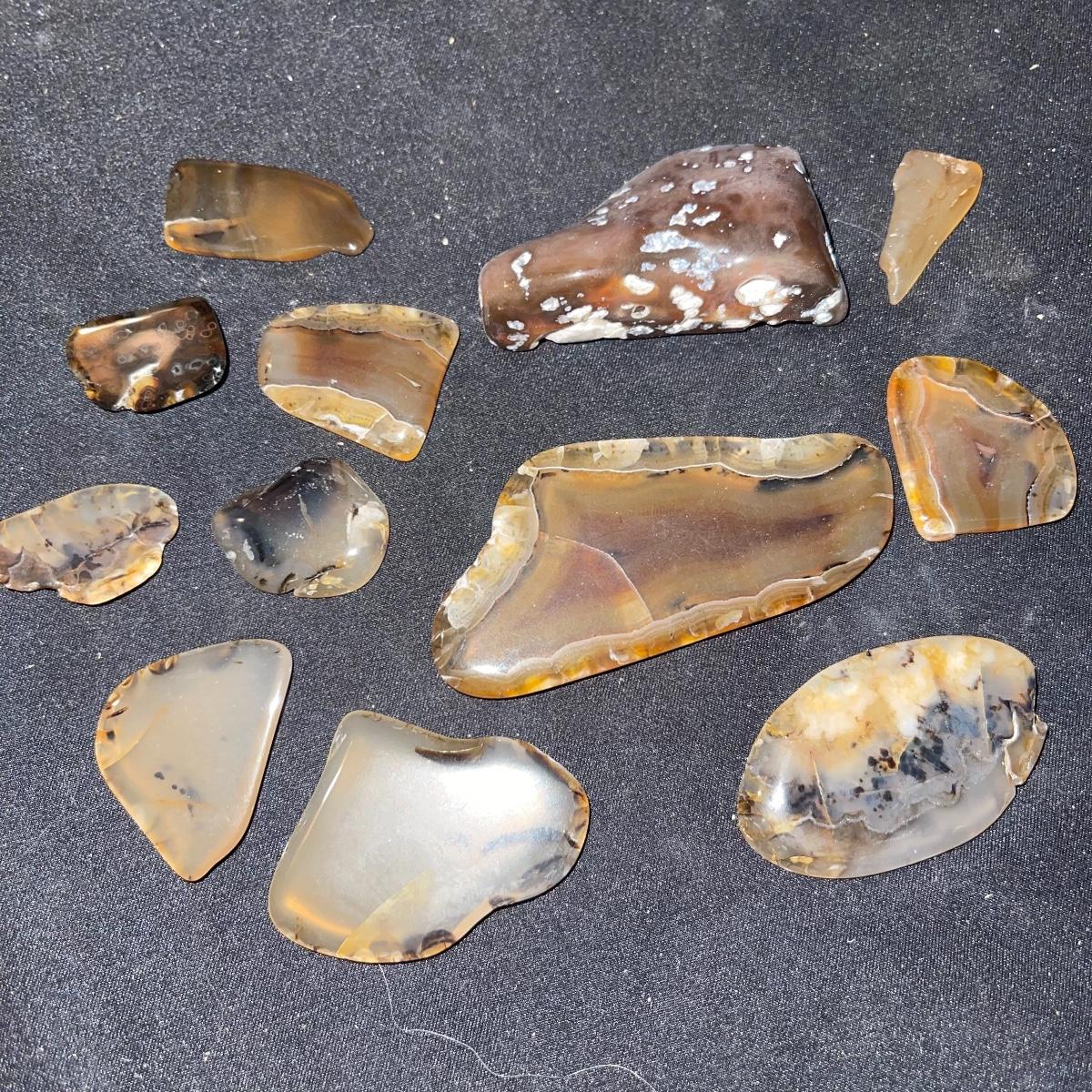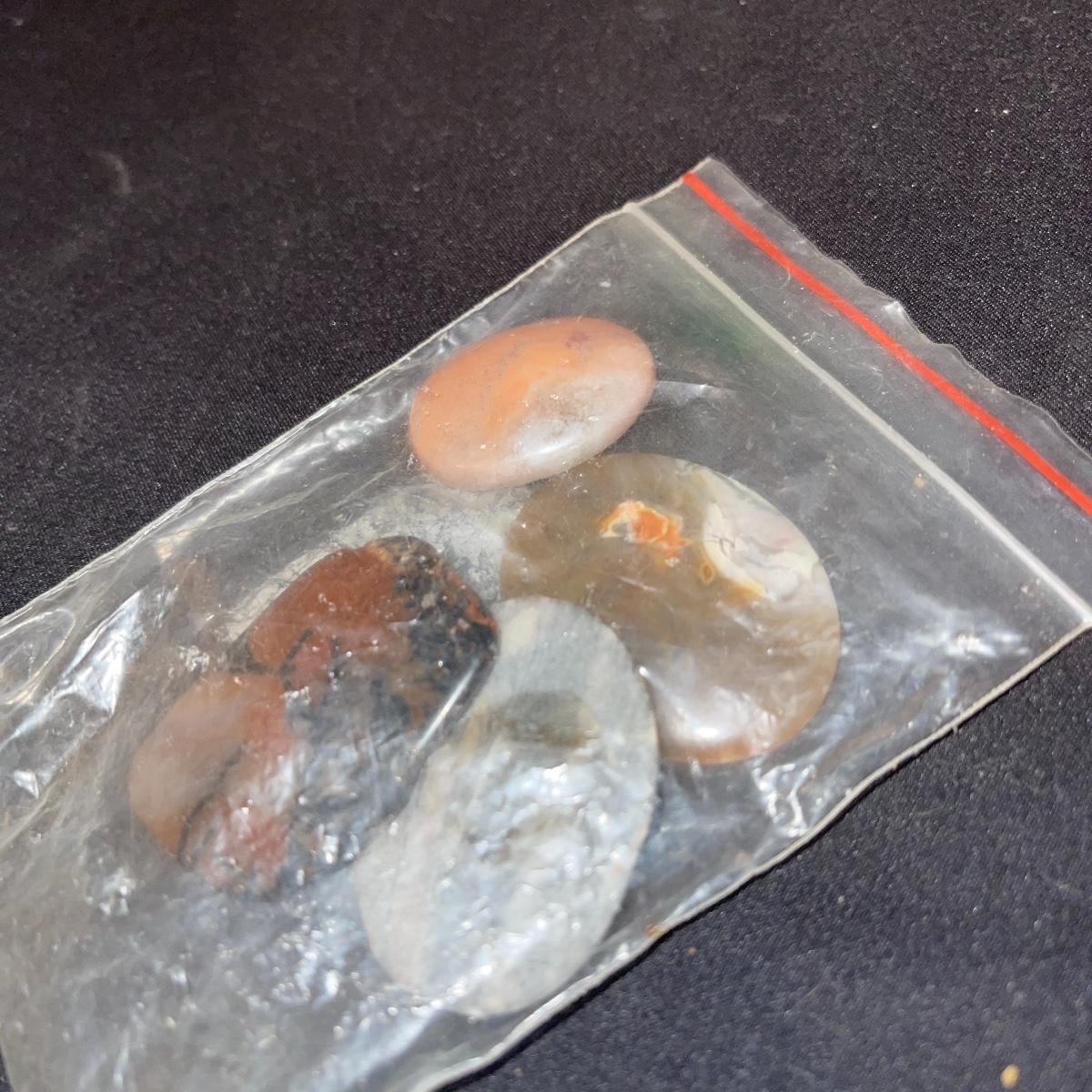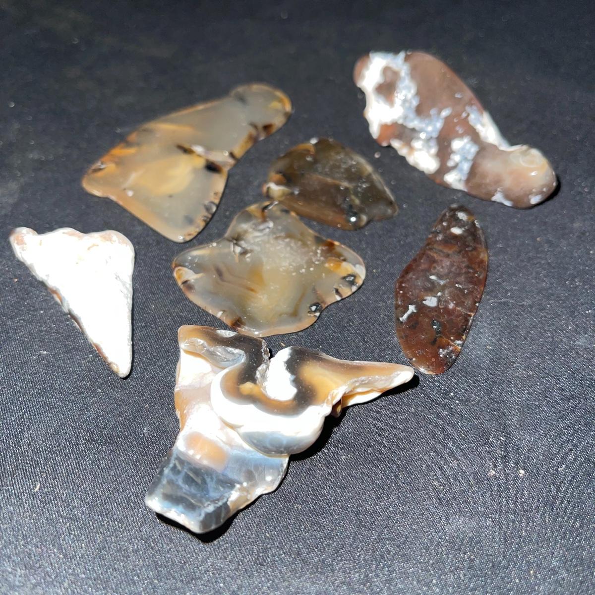 The majority of agate pieces in this lot are in the orange, red, brown,and white spectrums of color. There are some pieces with some blues and other hues, notably, a circular dark blue flat