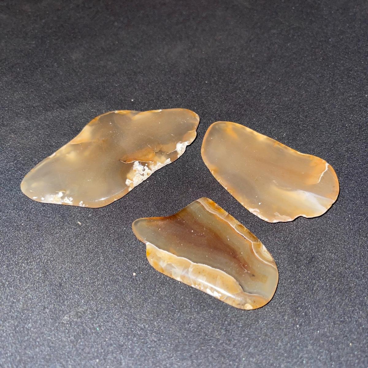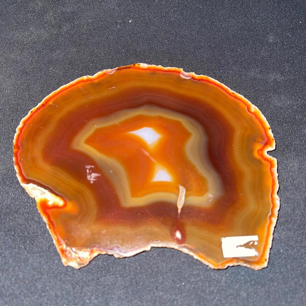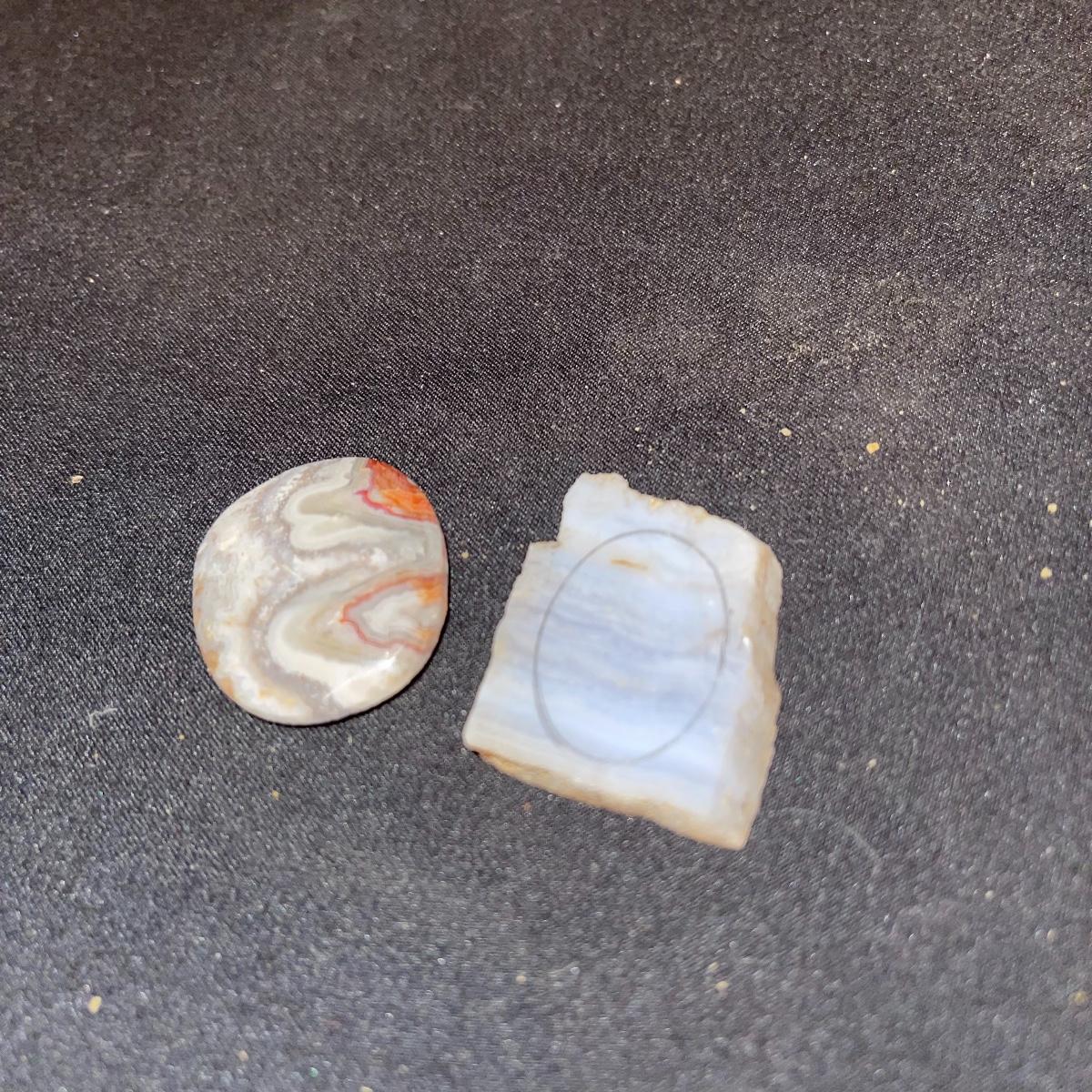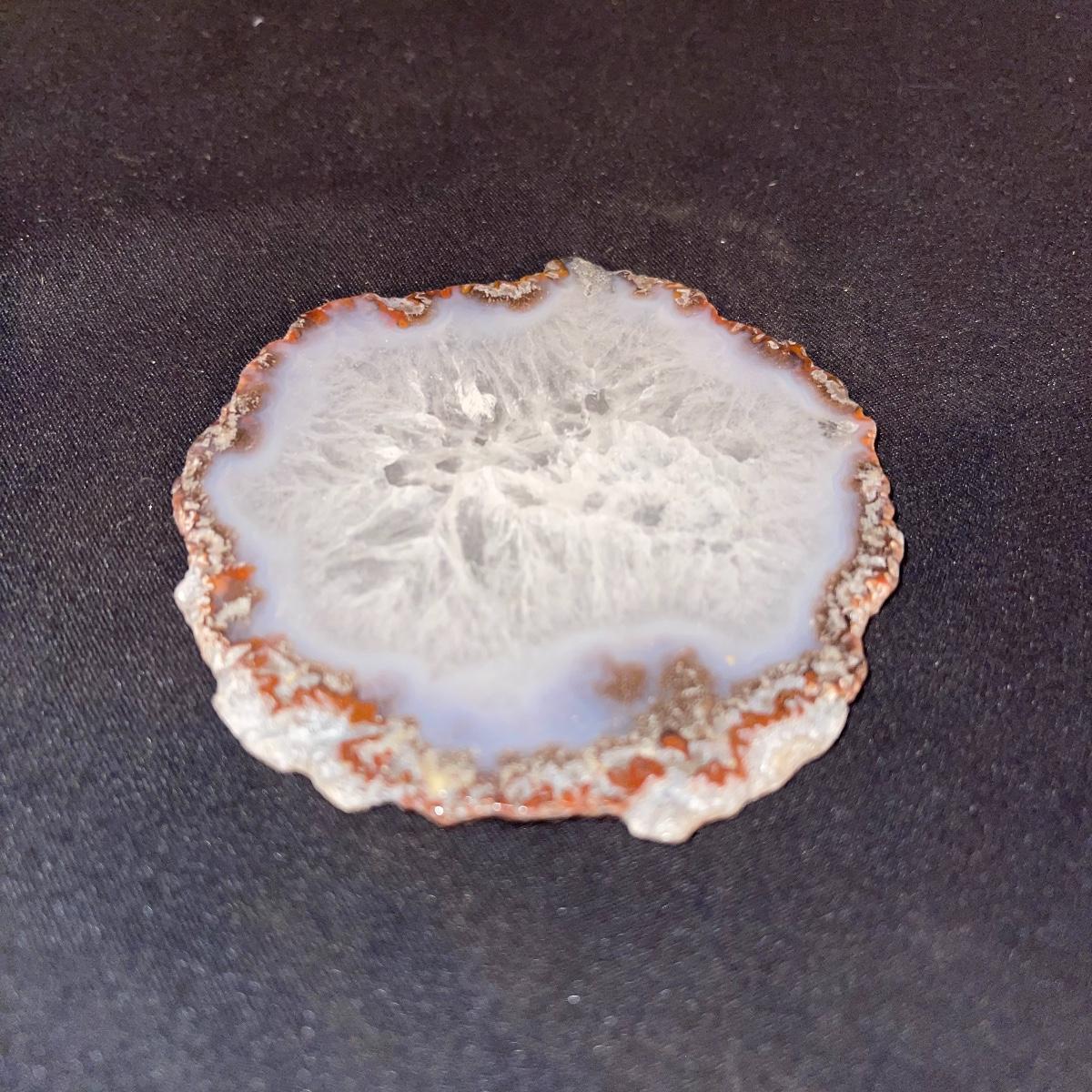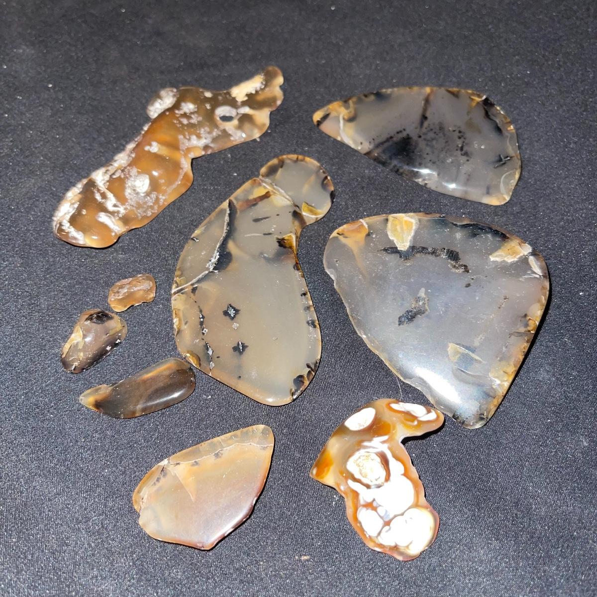 The majority of agate pieces in this lot are in the orange, red, brown,and white spectrums of color. There are some pieces with some blues and other hues, notably, a circular dark blue flat