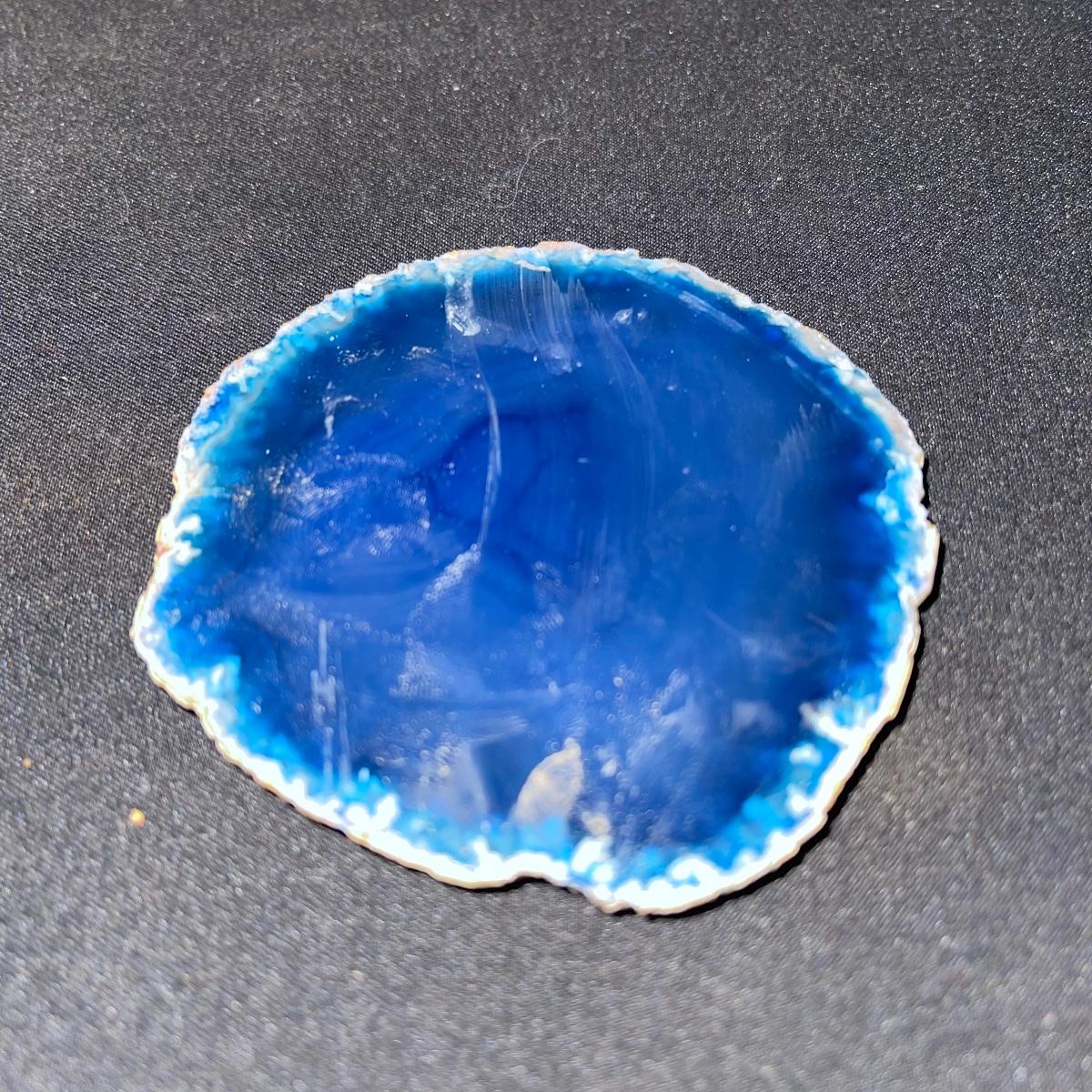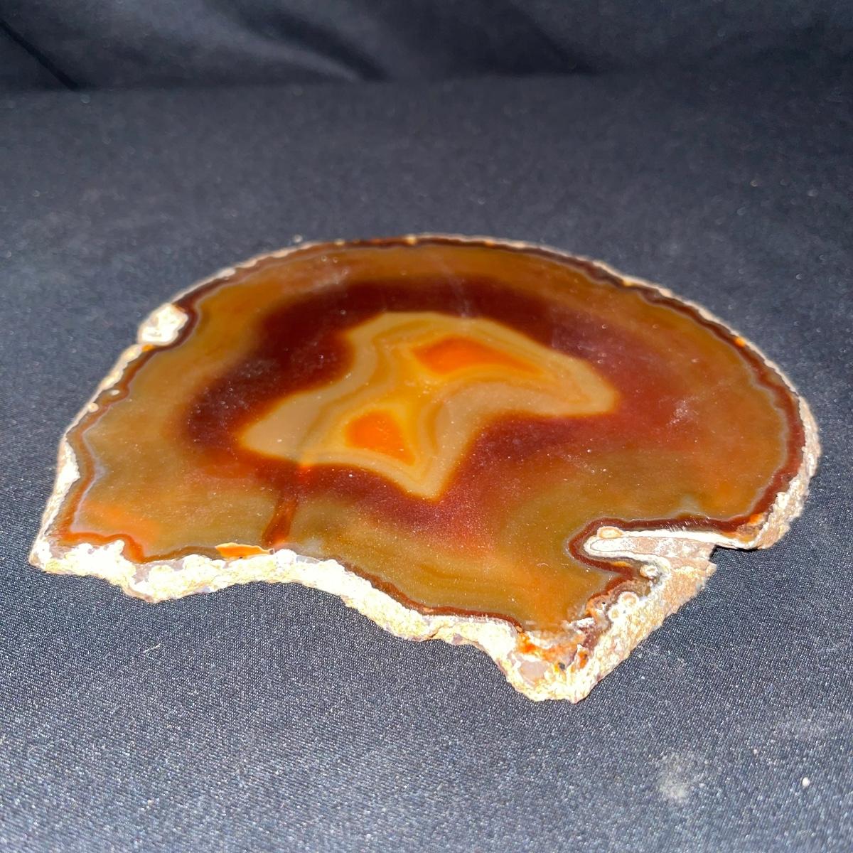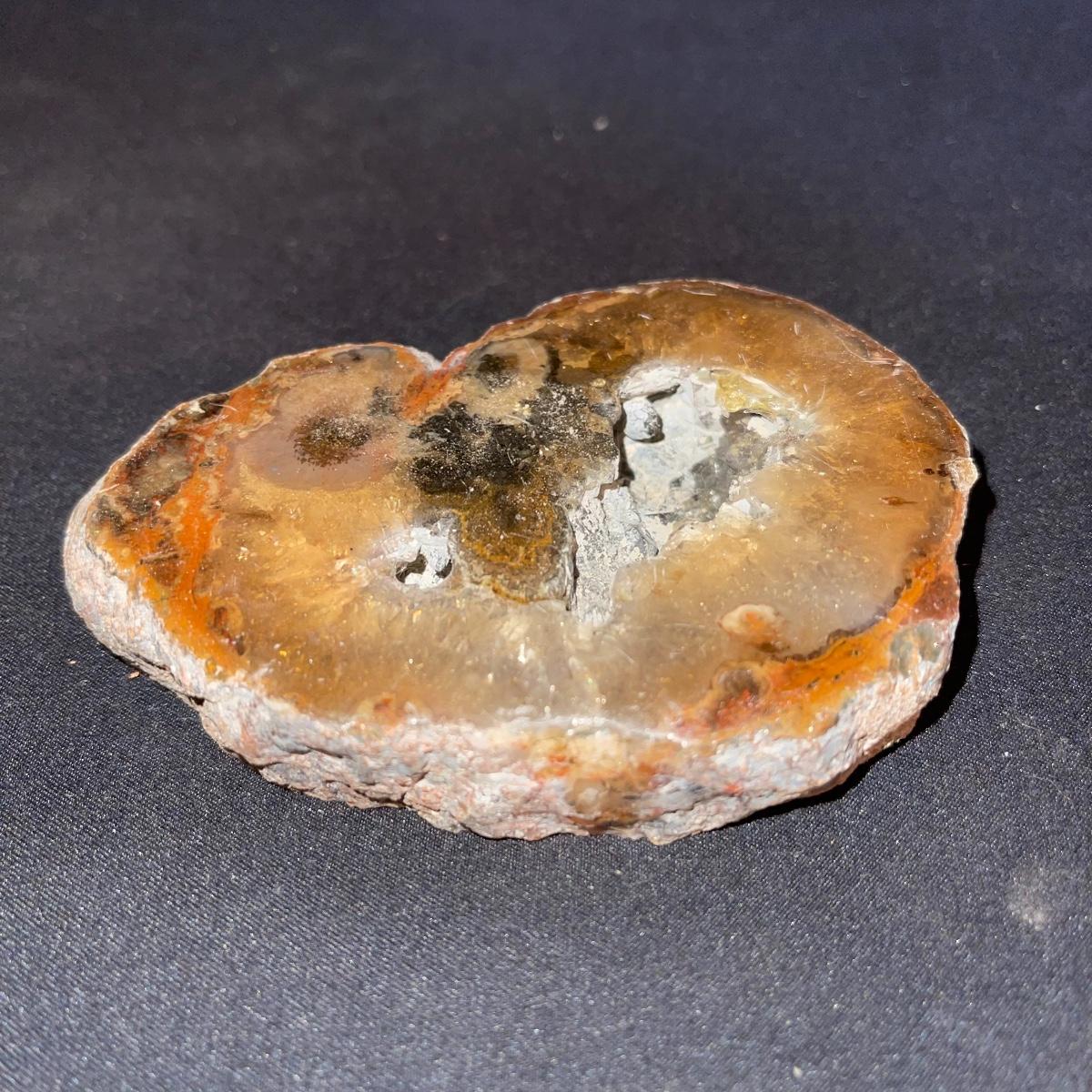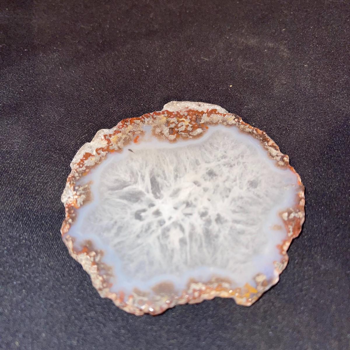 The majority of agate pieces in this lot are in the orange, red, brown,and white spectrums of color. There are some pieces with some blues and other hues, notably, a circular dark blue flat