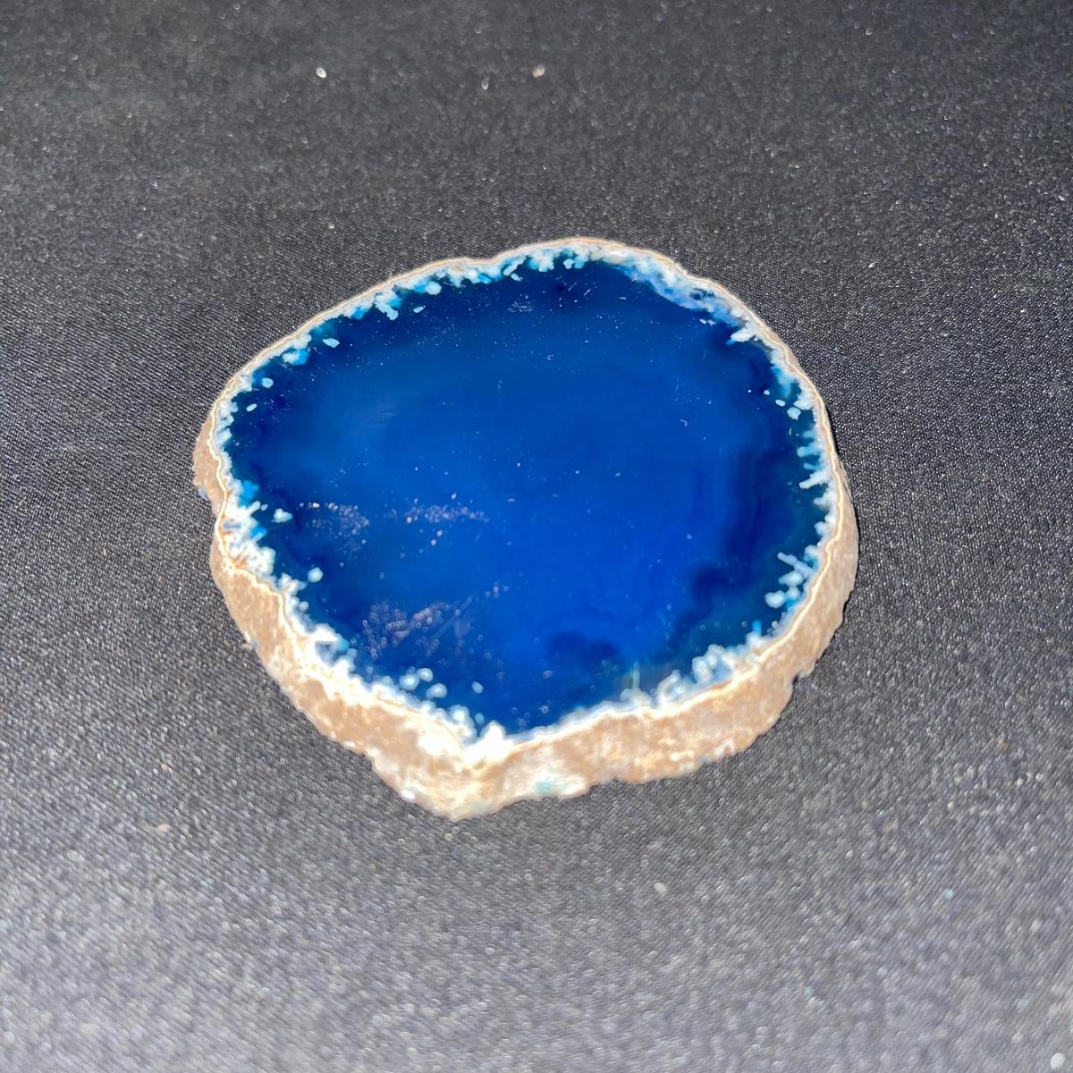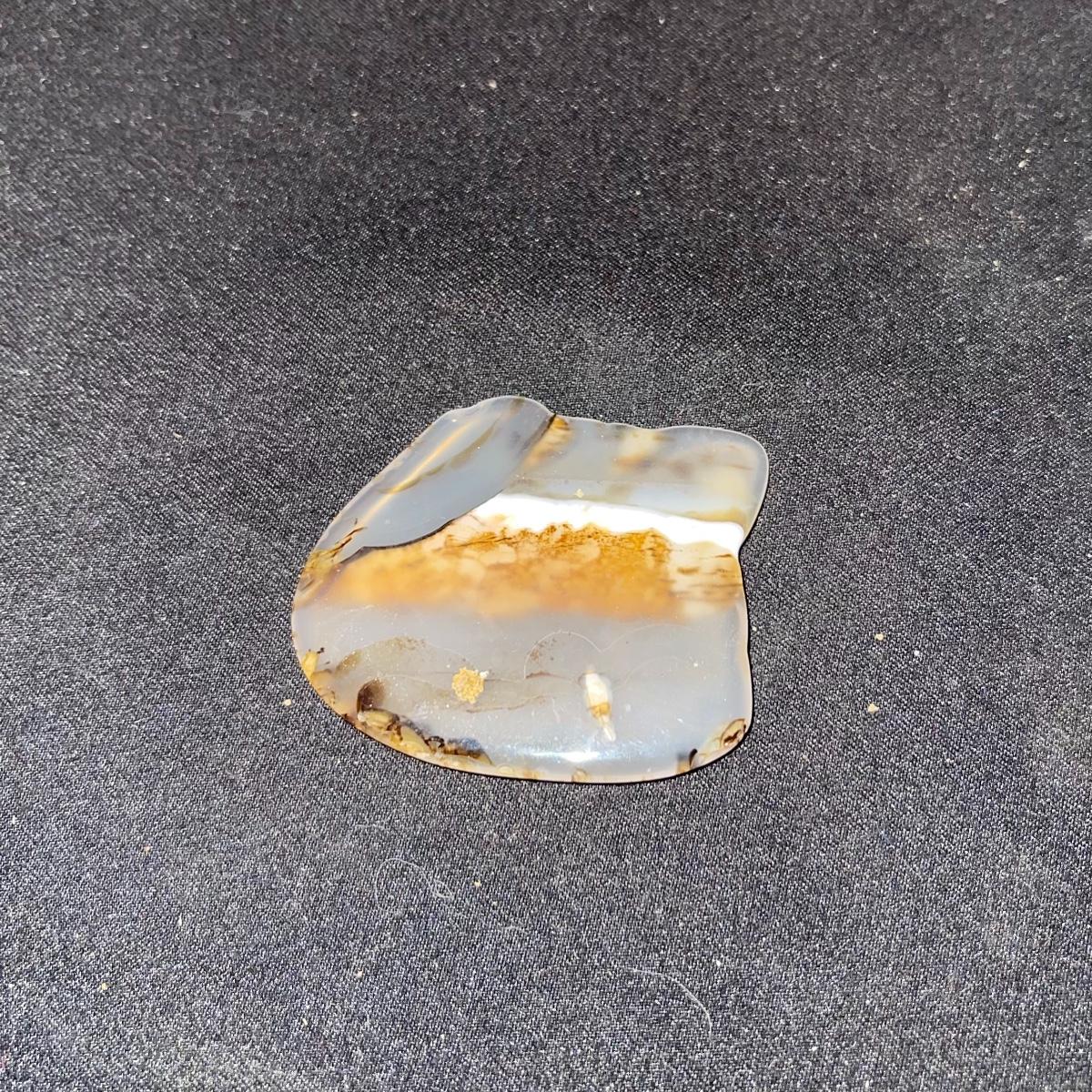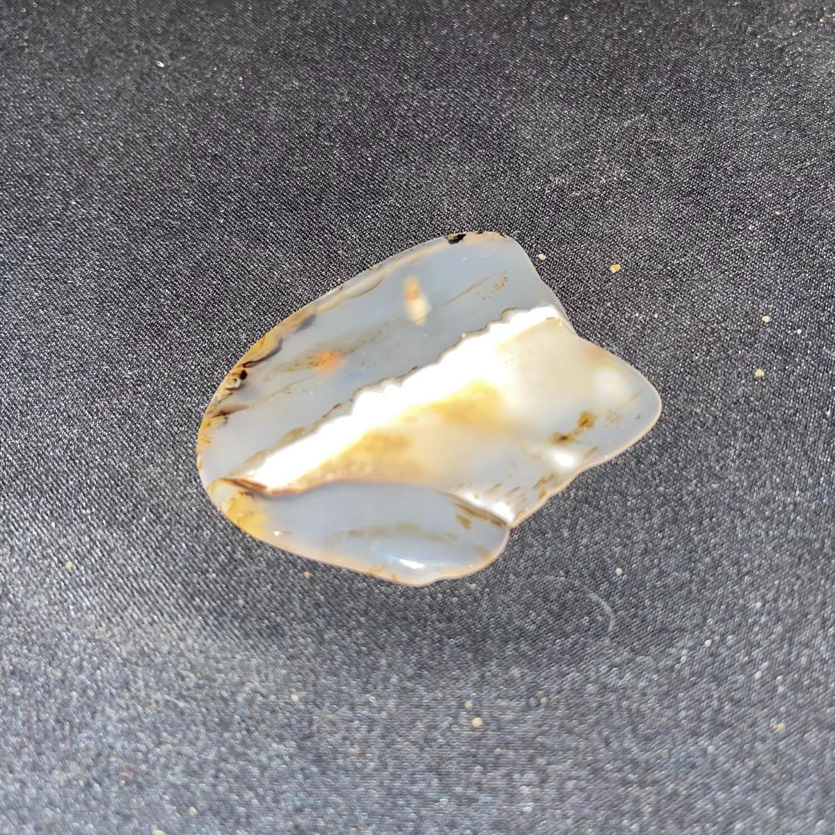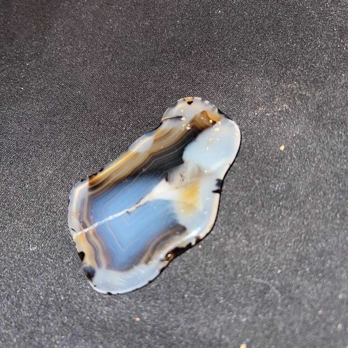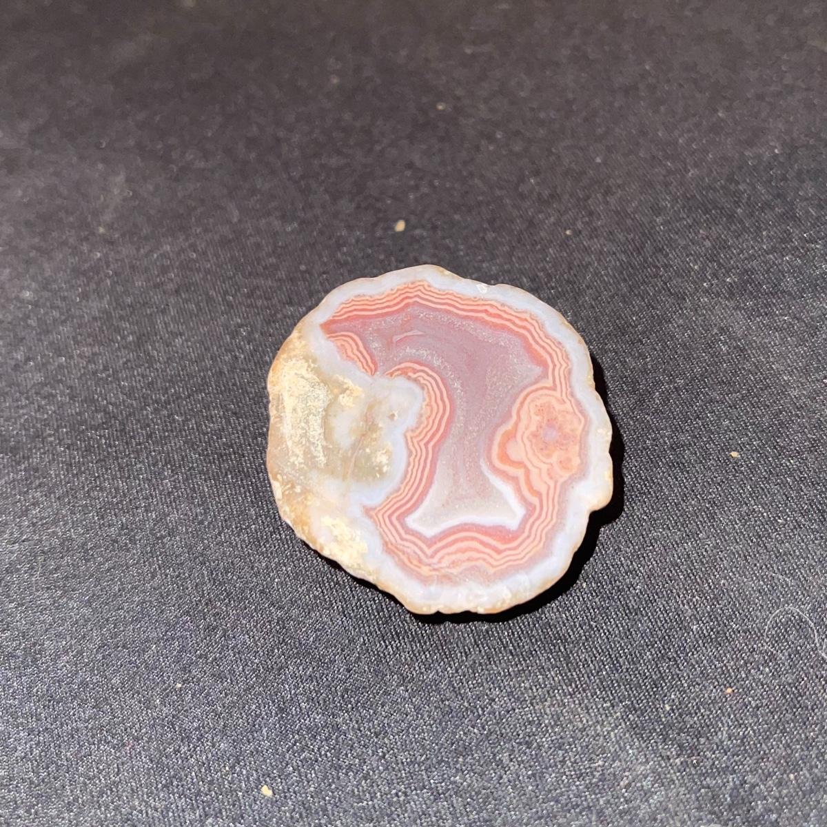The majority of agate pieces in this lot are in the orange, red, brown,and white spectrums of color. There are some pieces with some blues and other hues, notably, a circular dark blue flat
