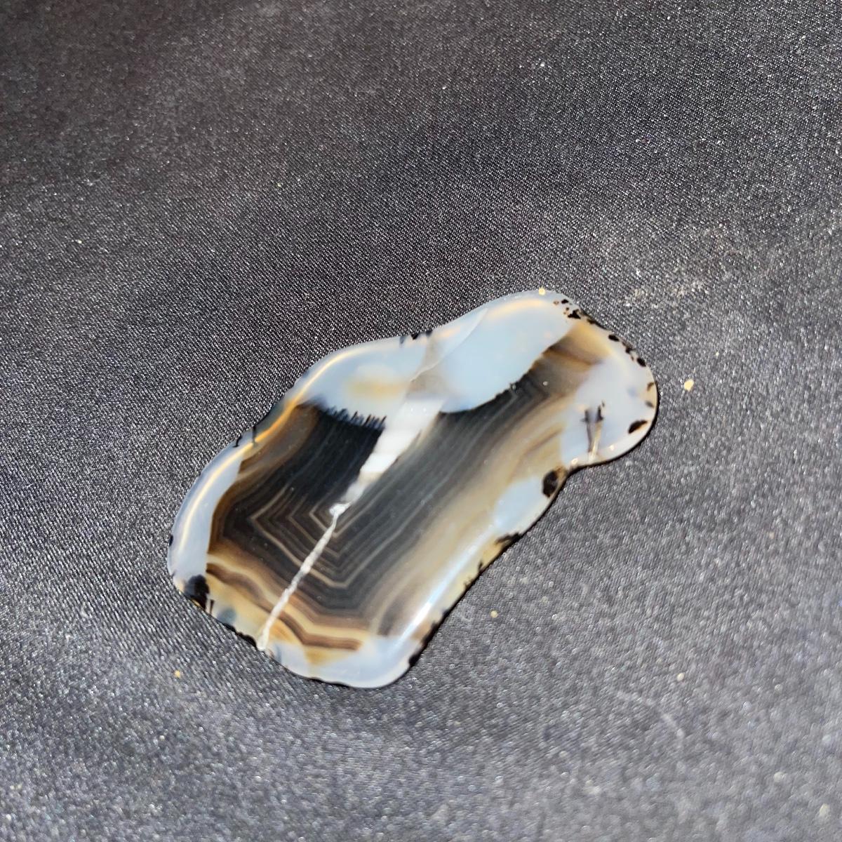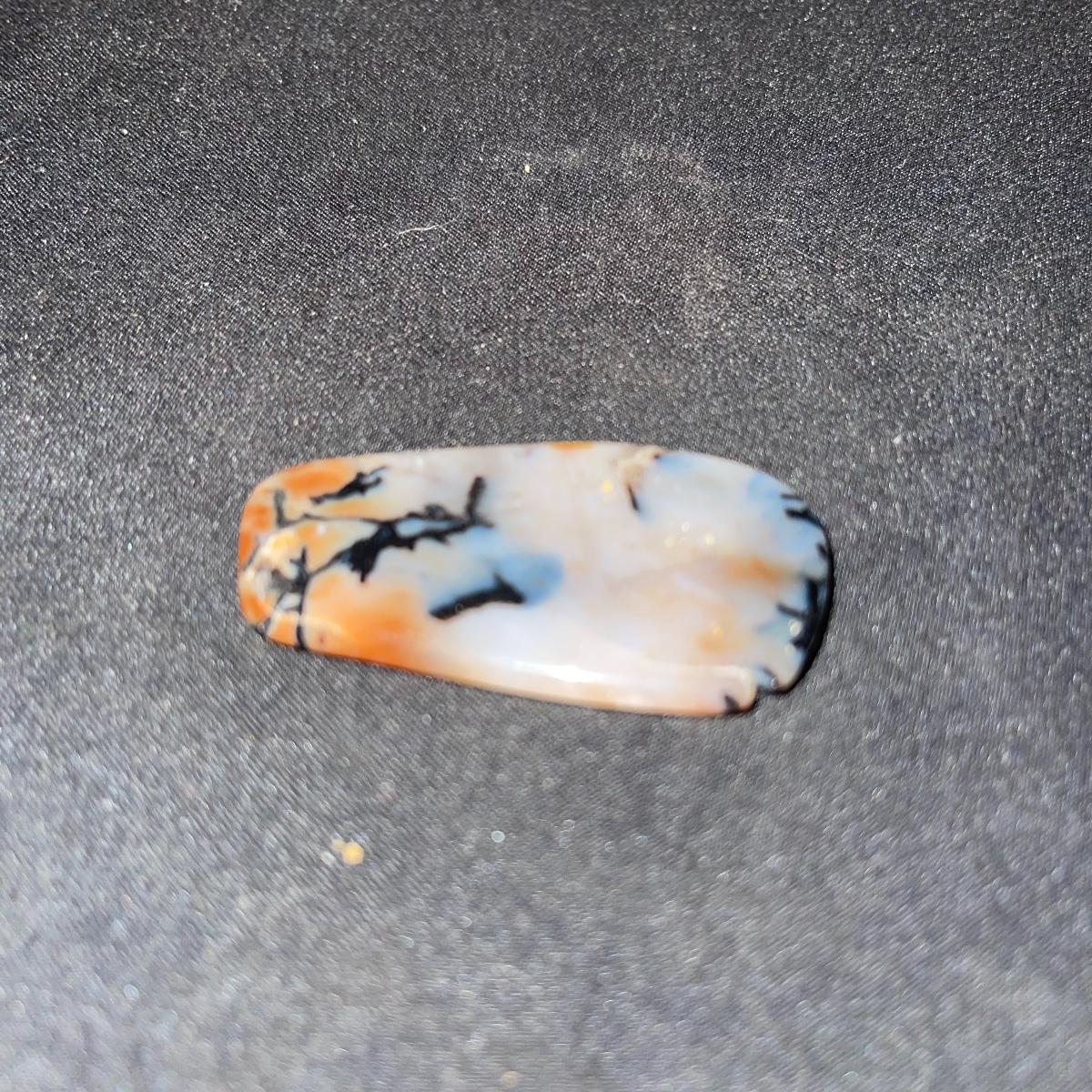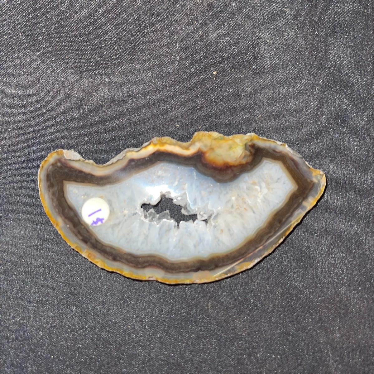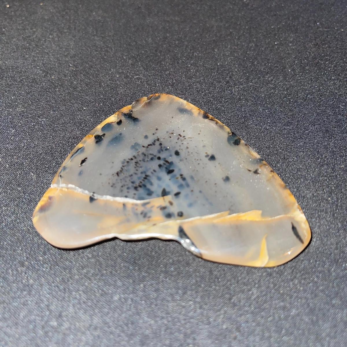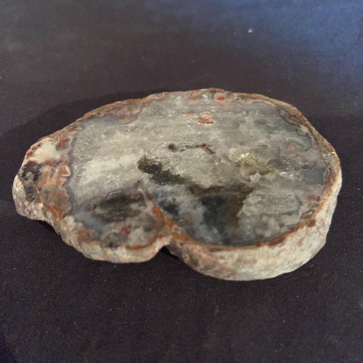 The majority of agate pieces in this lot are in the orange, red, brown,and white spectrums of color. There are some pieces with some blues and other hues, notably, a circular dark blue flat
