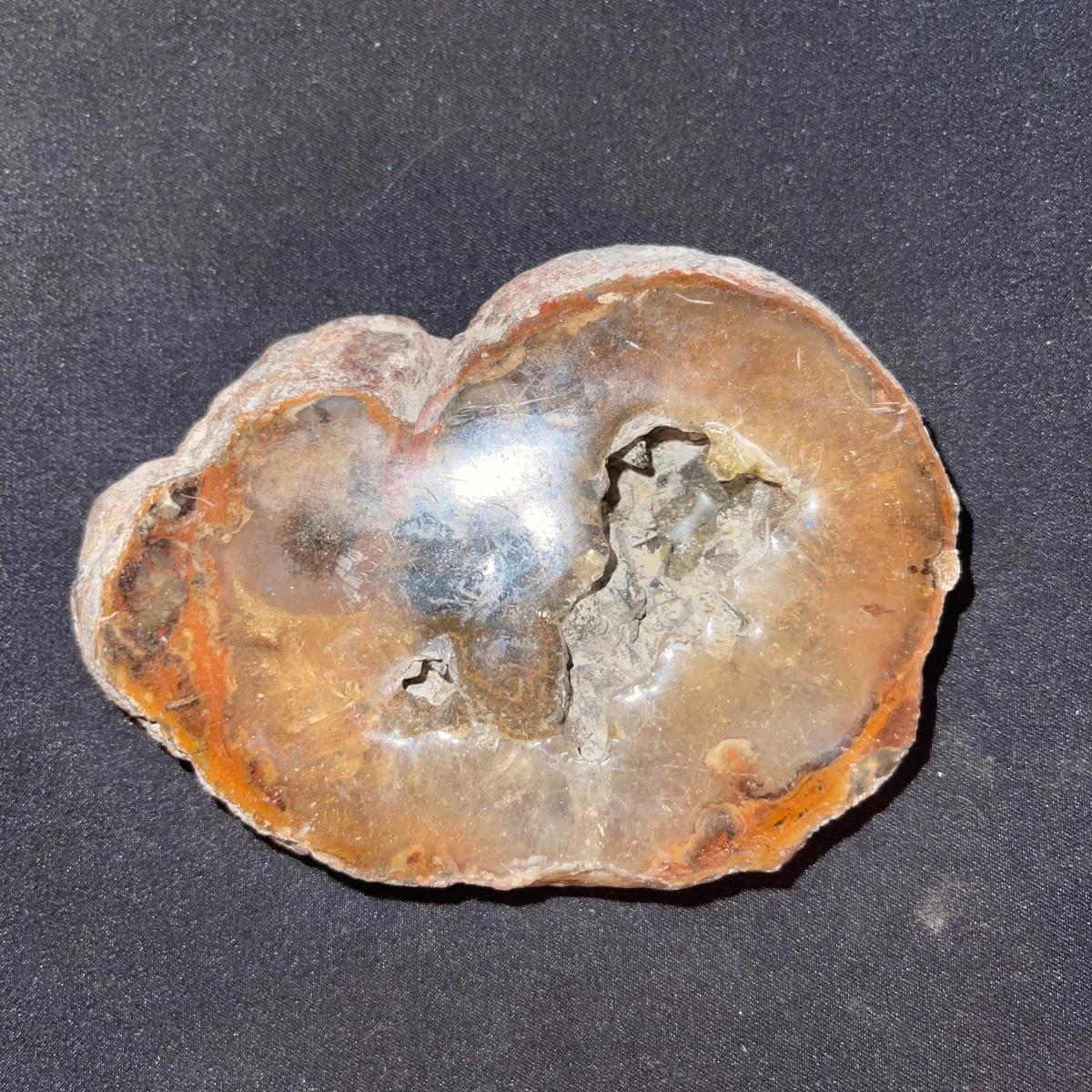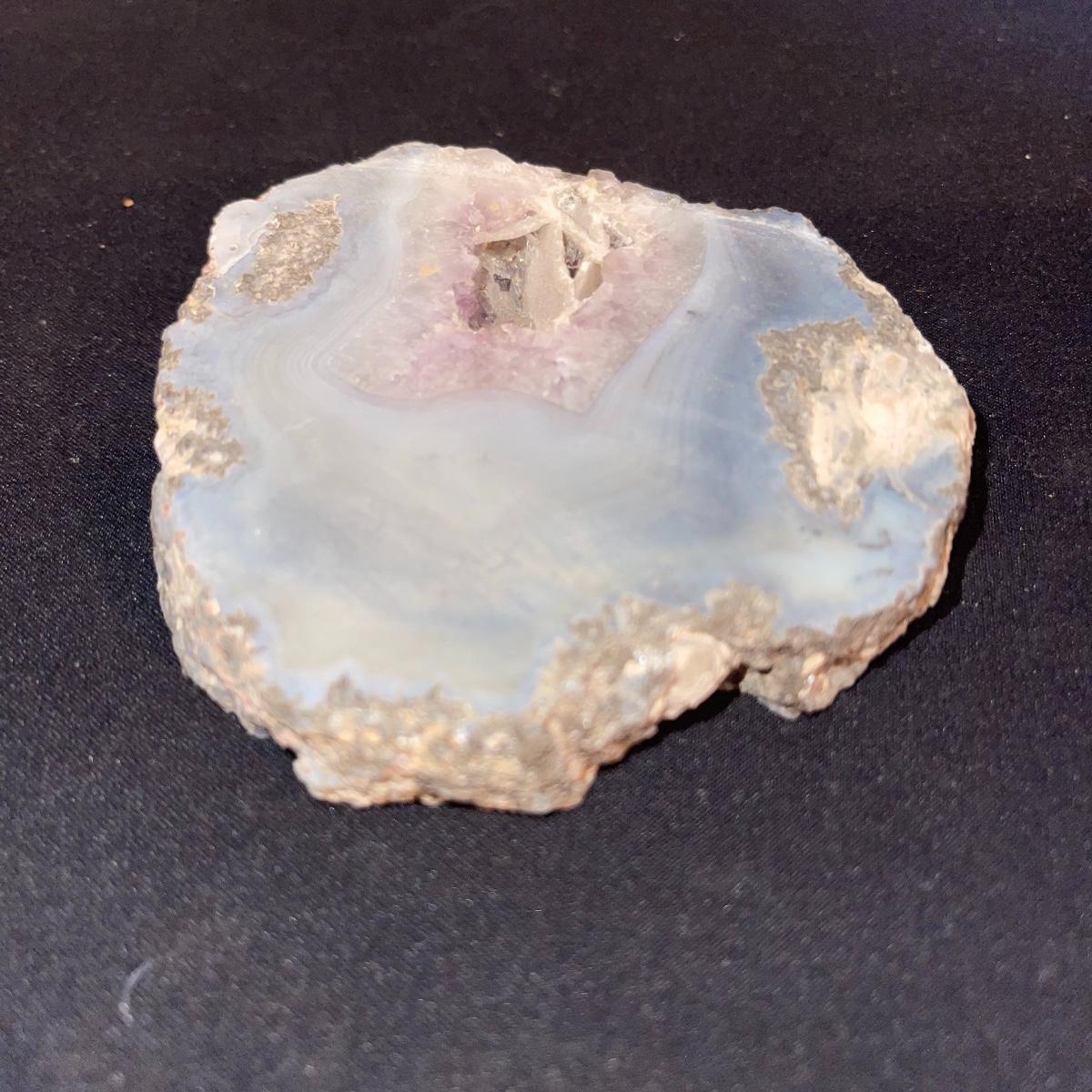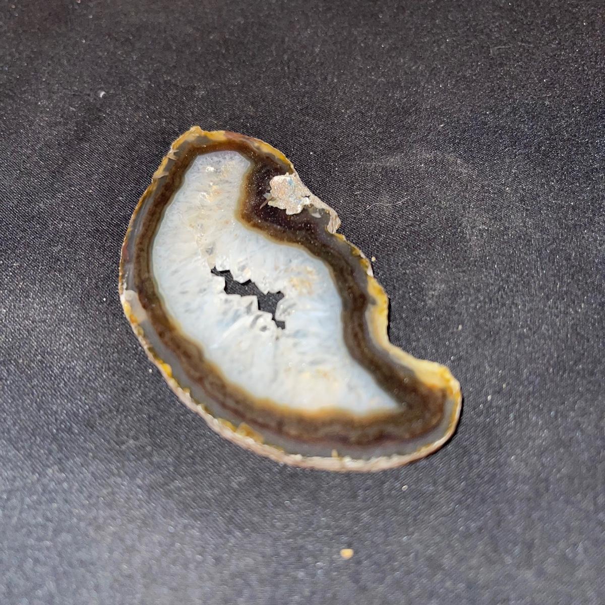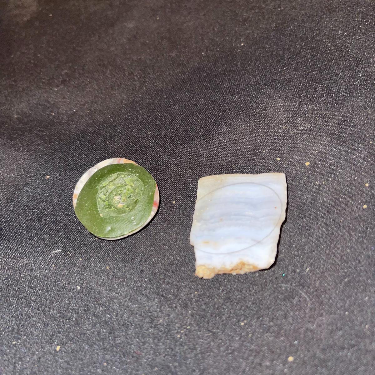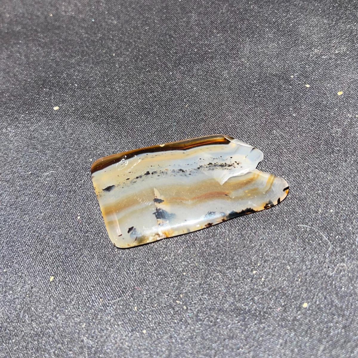The majority of agate pieces in this lot are in the orange, red, brown,and white spectrums of color. There are some pieces with some blues and other hues, notably, a circular dark blue flat