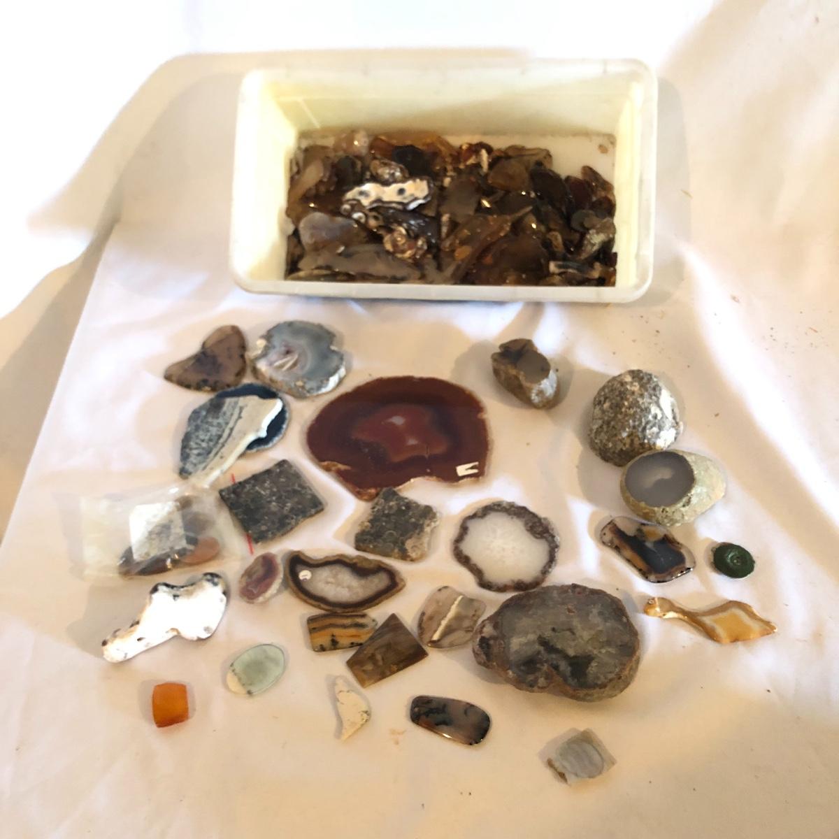 piece. At 5.5” across, the largest stone is a dark orange/red flat piece of agate, all other pieces in this lot are much smaller than that size; the smallest being smaller than a thumbnail. This large assortment is great for decorative or ornamental use, especially if some of the translucent pieces were to be near sunlight!