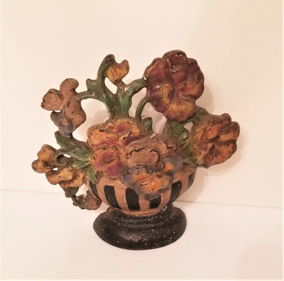 Nice Antique Cast Iron Flower Basket Door stop - all original. NOT a repo. Heavy. Measures 7" tall, 7" across.