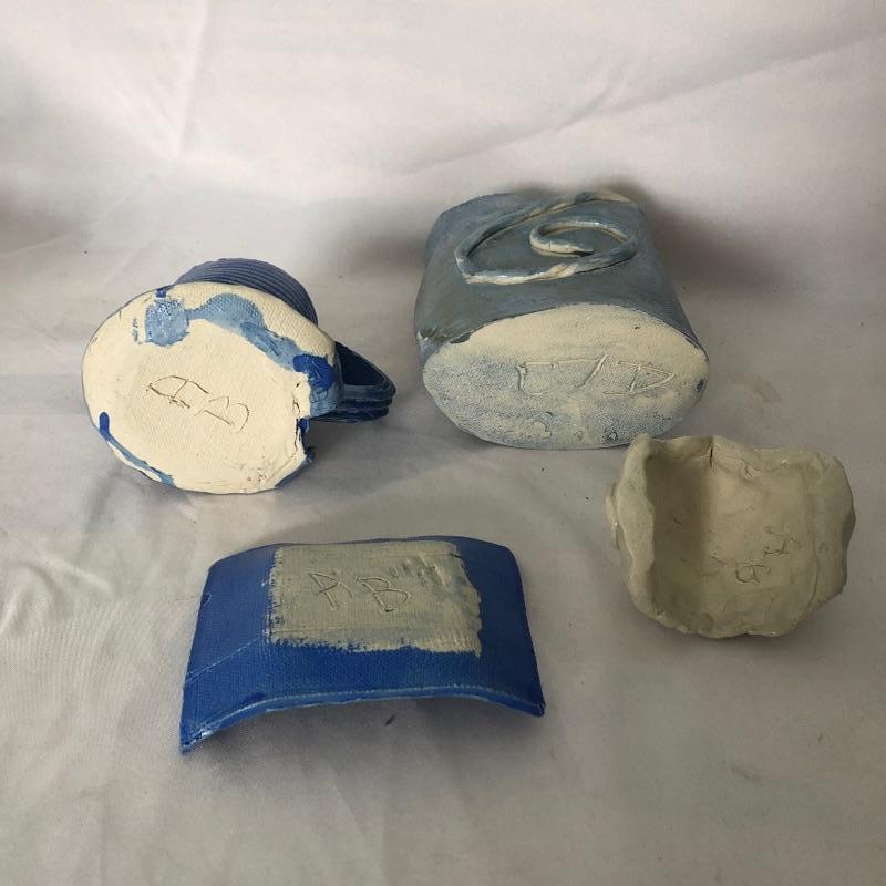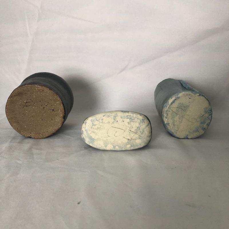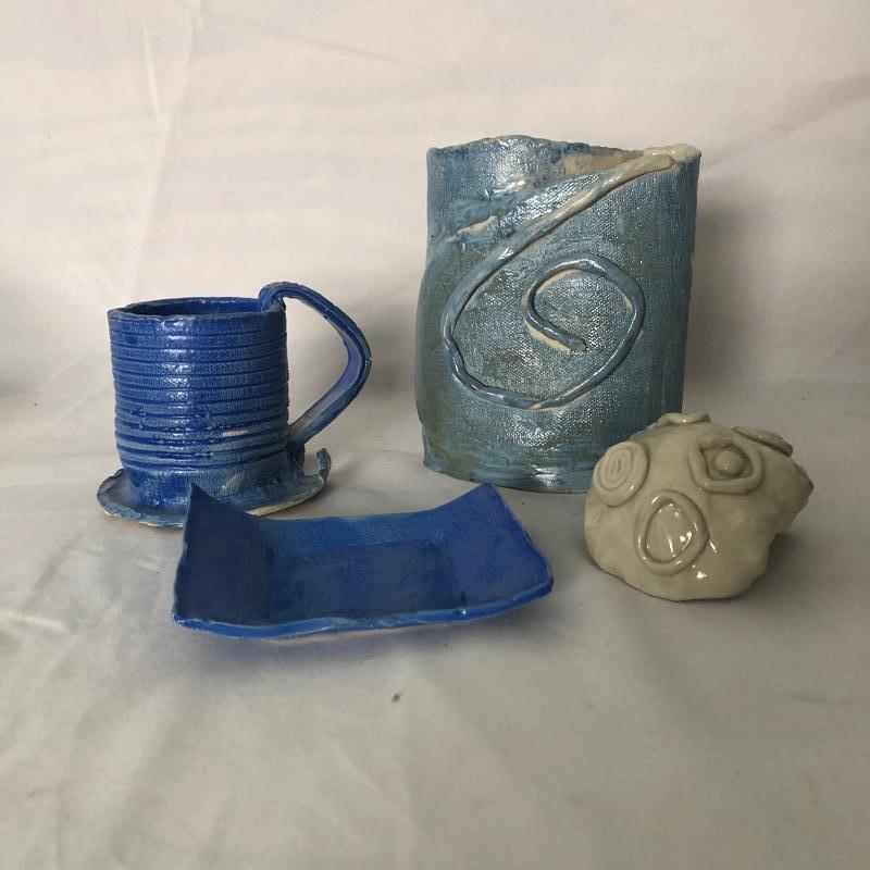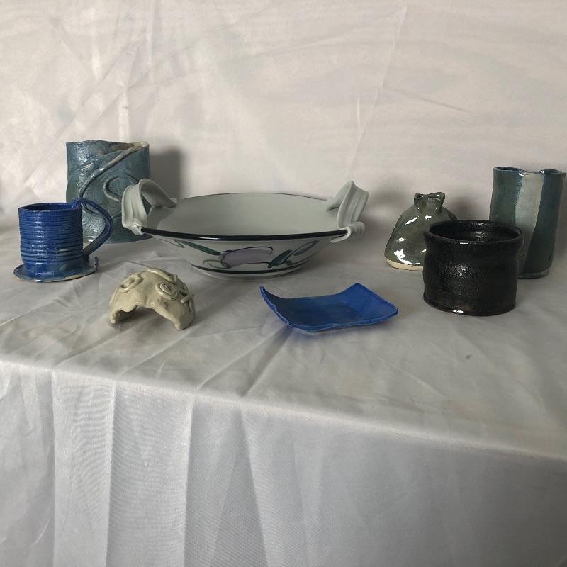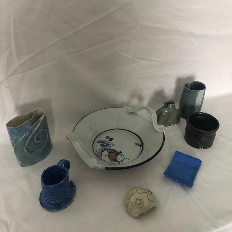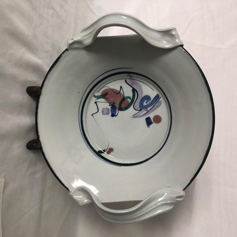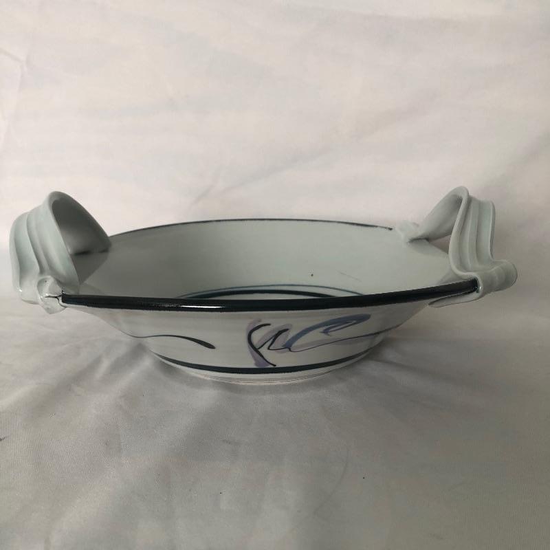 Beautifully hand crafted ceramic handled bowl. Bowl is signed by the artist. From handle to handle the bowl measures 13”. The six other pieces are handmade (possibly by the owner) and include cups, vases, and small tray. The tallest of the hand made vases is about 7” tall. The bowl would make a perfect accent piece for any table or counter. Shipping Available.