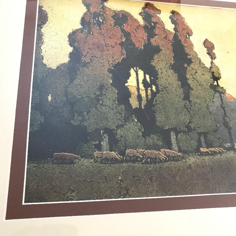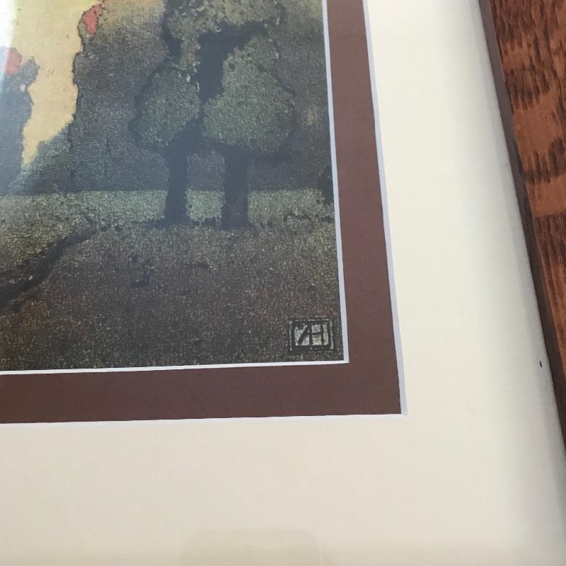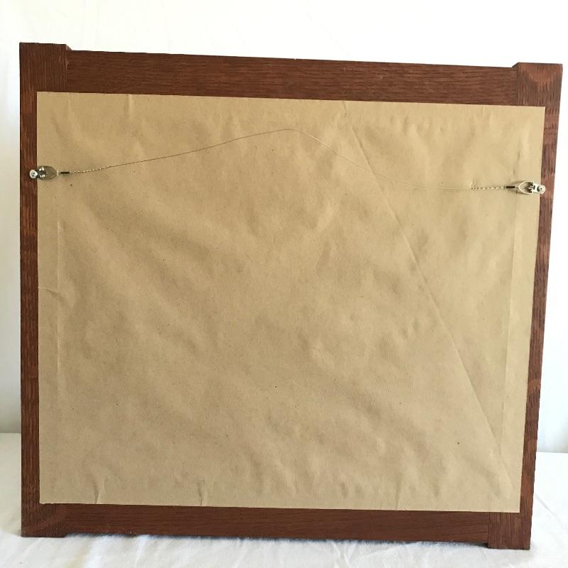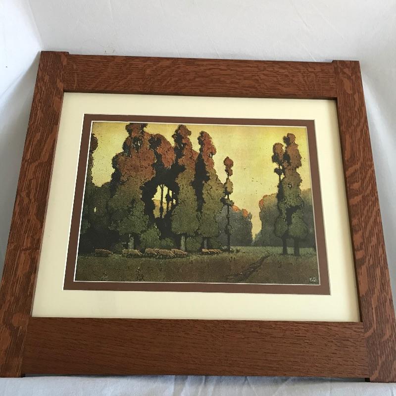 Stunning Arts & Crafts frame holding an era appropriate print reproductionn matted and behind glass. Print has artist mark in the lower right corner. The art itself is slightly bowed in areas. This occurrence is barely noticeable unless your are up close in proximity to glass, we were unable to show examples in photos. It will probably be easily remedied by a professional framer. The frame is absolutely gorgeous measuring 23.5” x 22”.