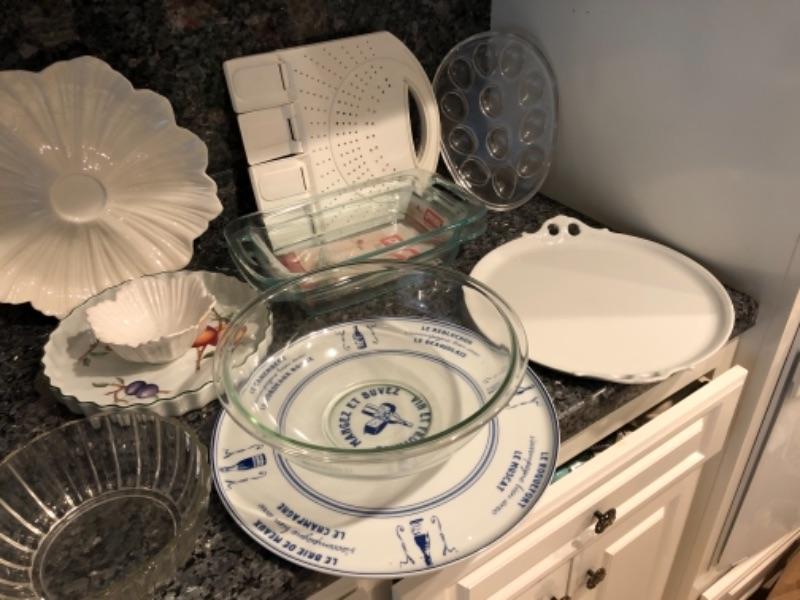 Lot 90. Assorted bowls and platters, egg dish, colander, Pyrex baking dishes--WAS $45““NOW $22.50