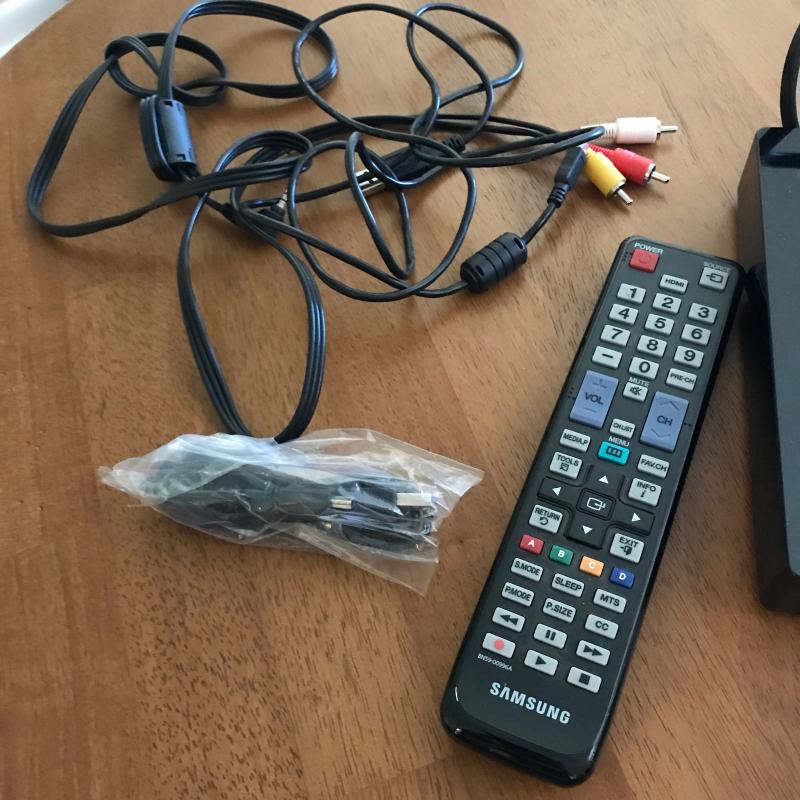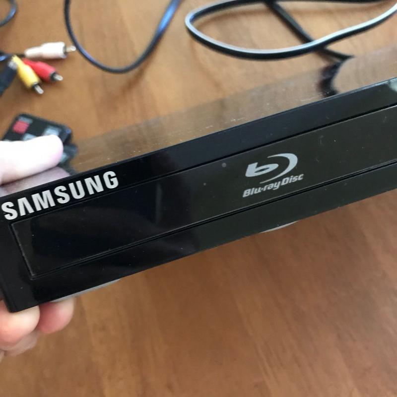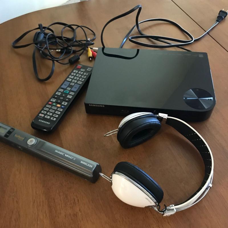 Samsung Blu-ray Disc Player BD-F5700 with remote, Rocnation Earphones, and Magic Wand II portable wireless scanner. Shipping available