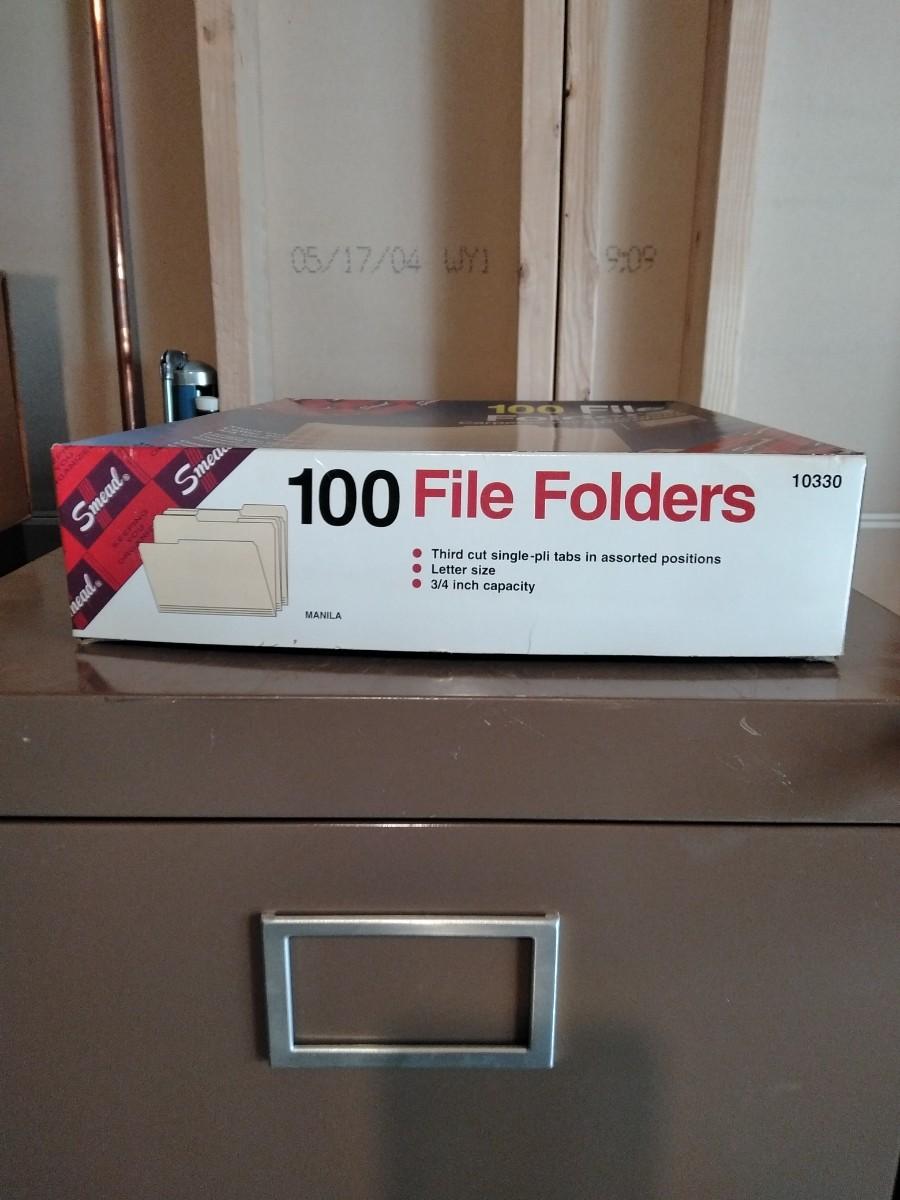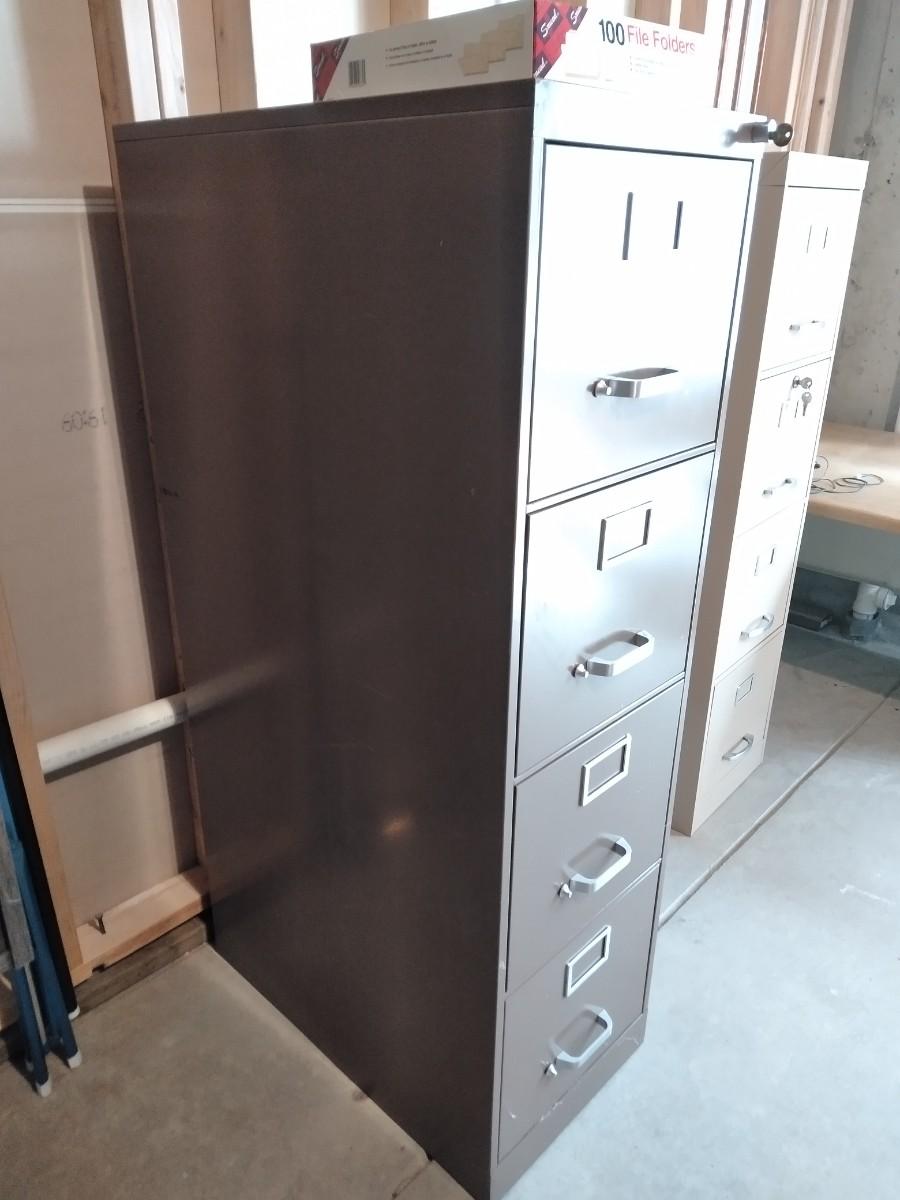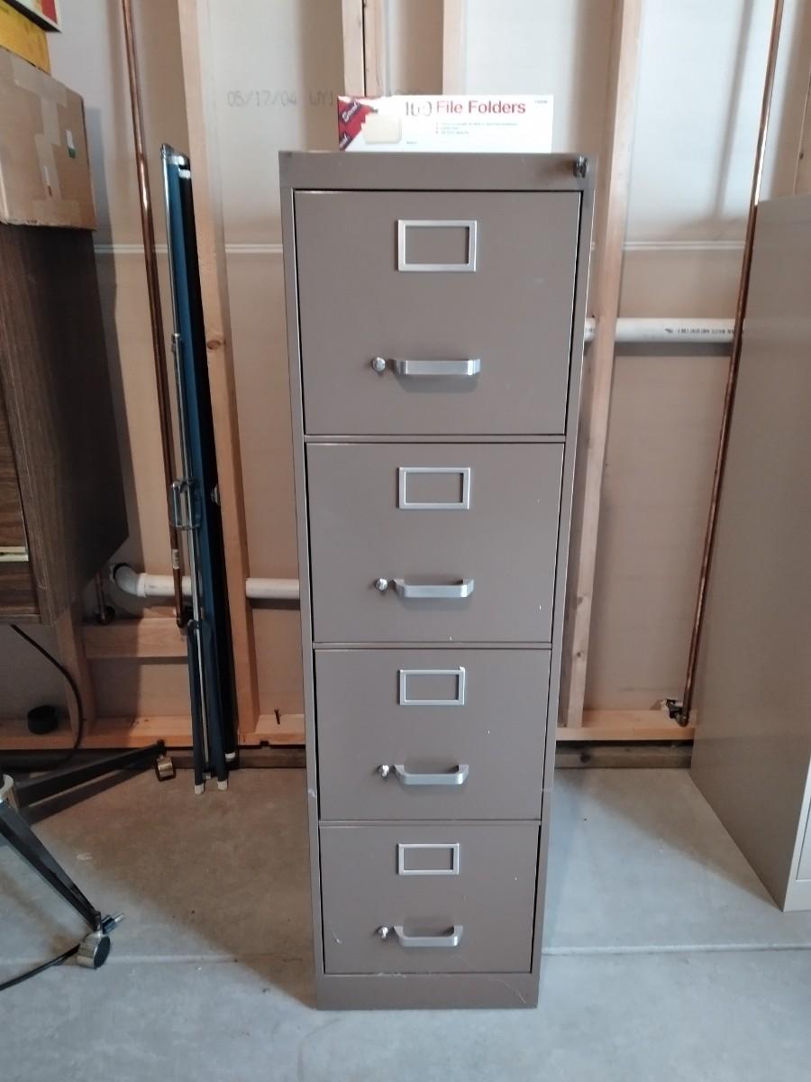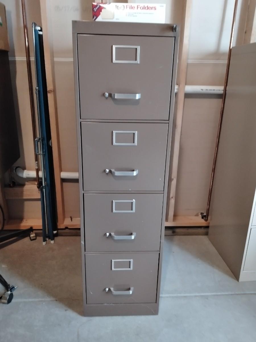 BROWN 4 DRAWER FILE CABINET WITH KEYS, AND FILE FOLDERS (opened box) 52" X 15" X 26"