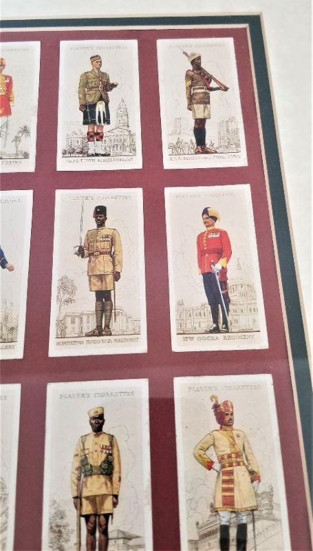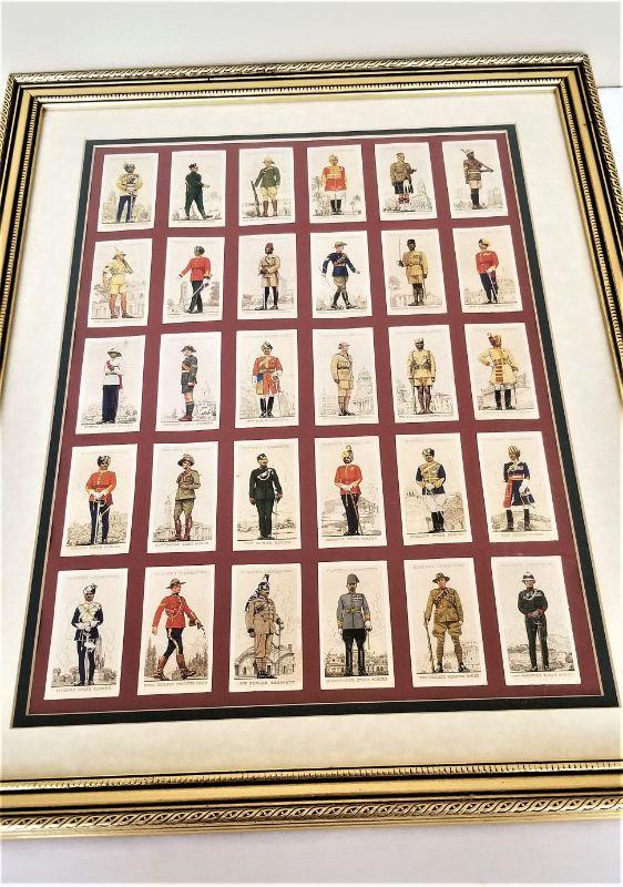 Very good-looking lot here - a set of Player's Cigarette Cards (vintage), nicely framed - they depict the uniforms from the British Colonies. A total of 30 cards, triple matted. Measures 15.6" x 20". Good condition and coloration.