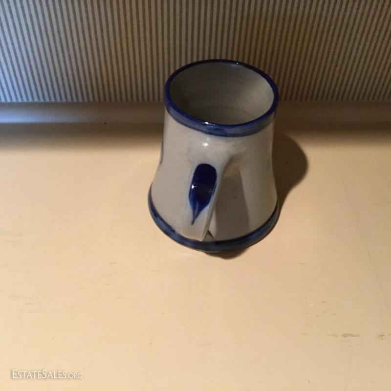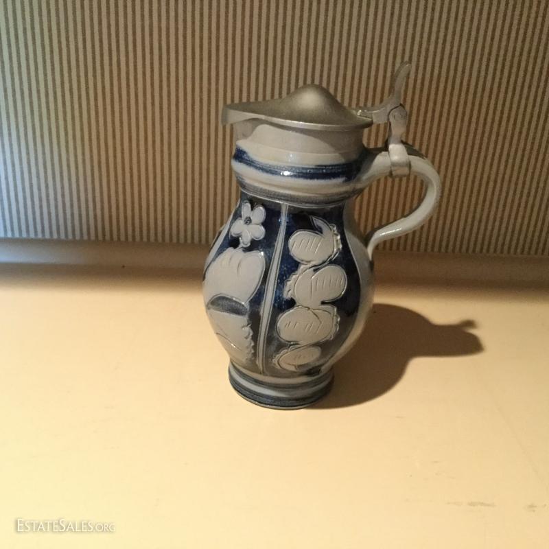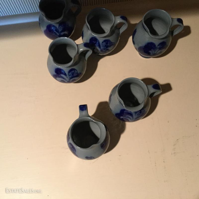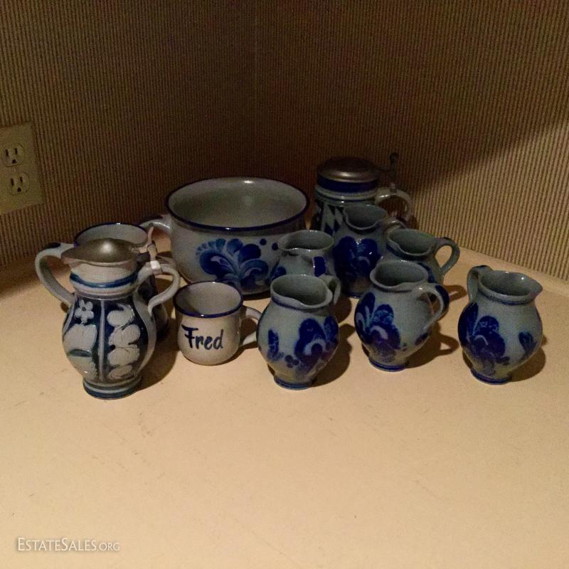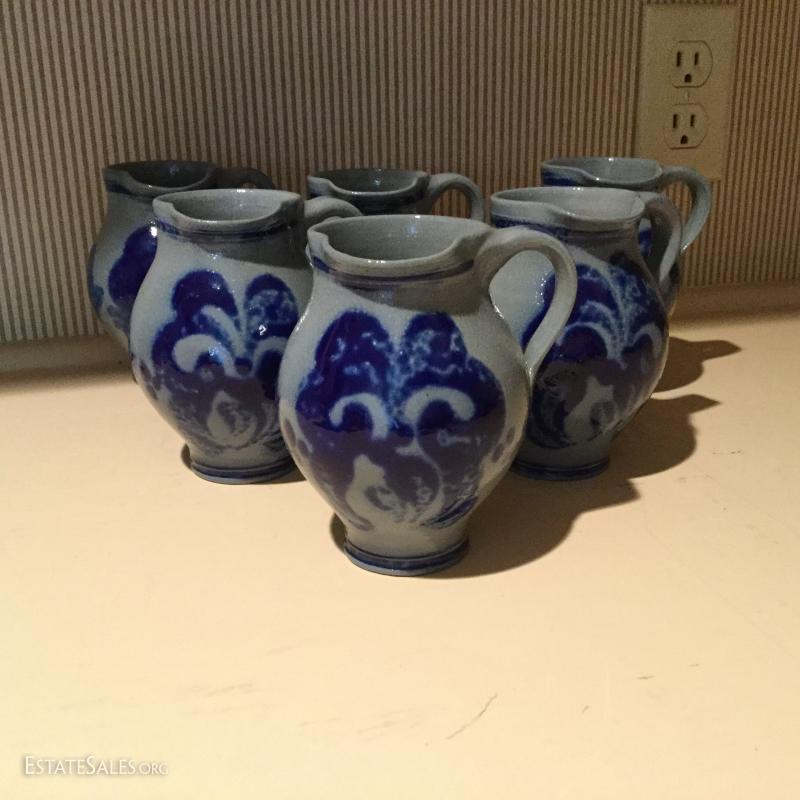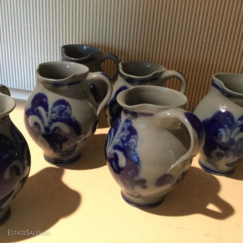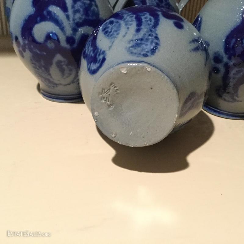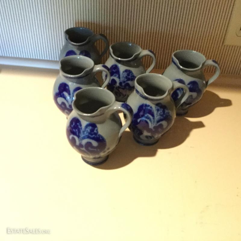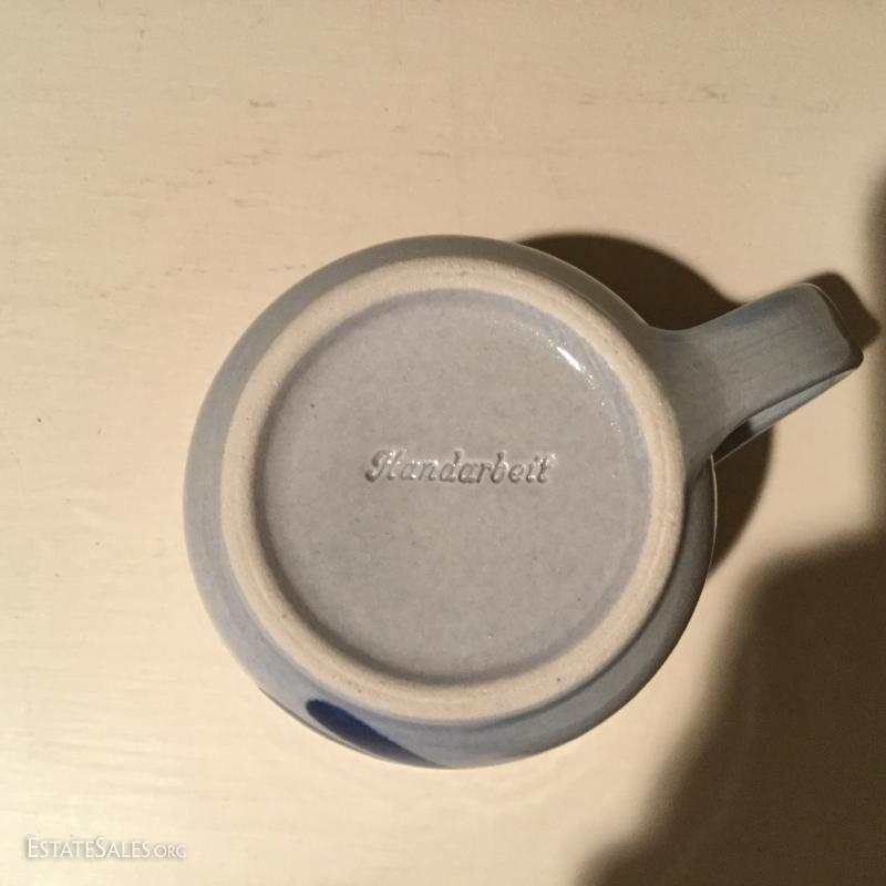 Handarbeit grey and blue pottery includes pitcher and bowl, 7.5"d x 5"h, and six beer mugs. Also includes two steins and mug with matching colors. See photos for details.