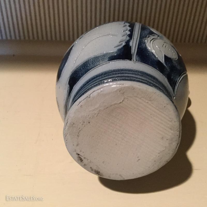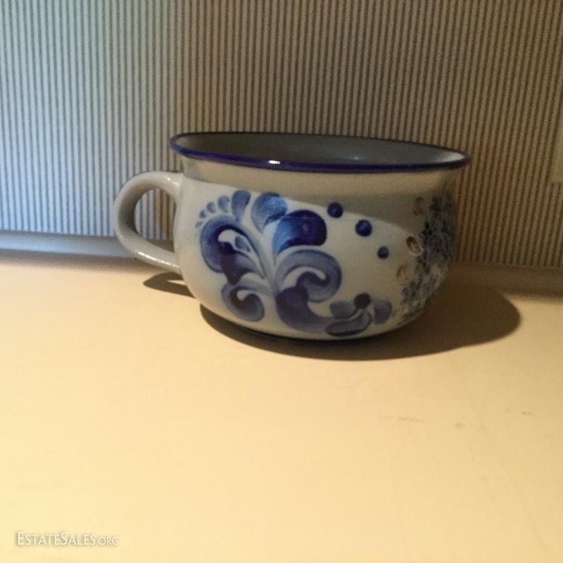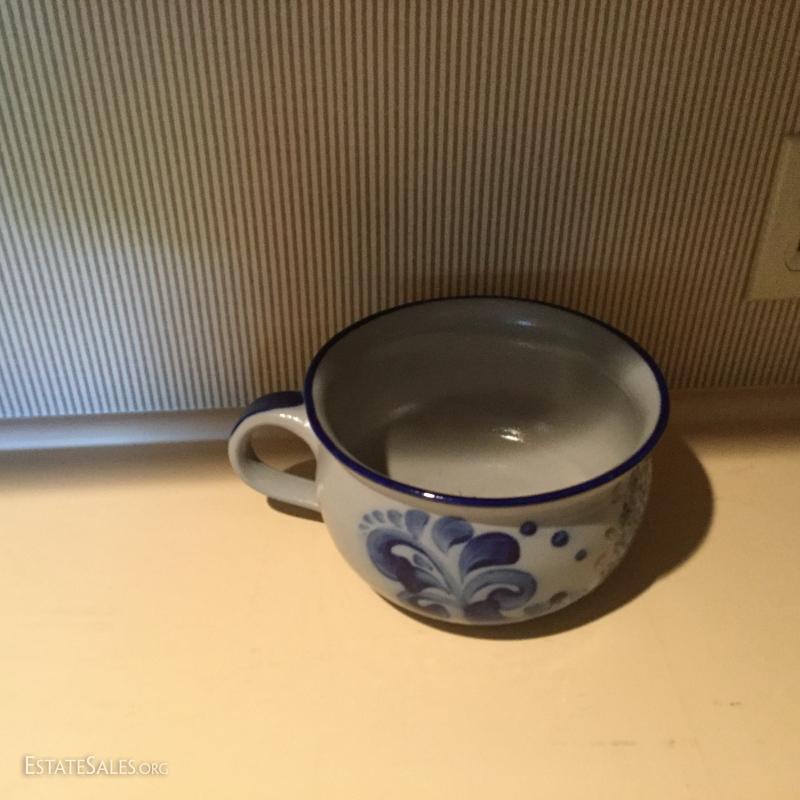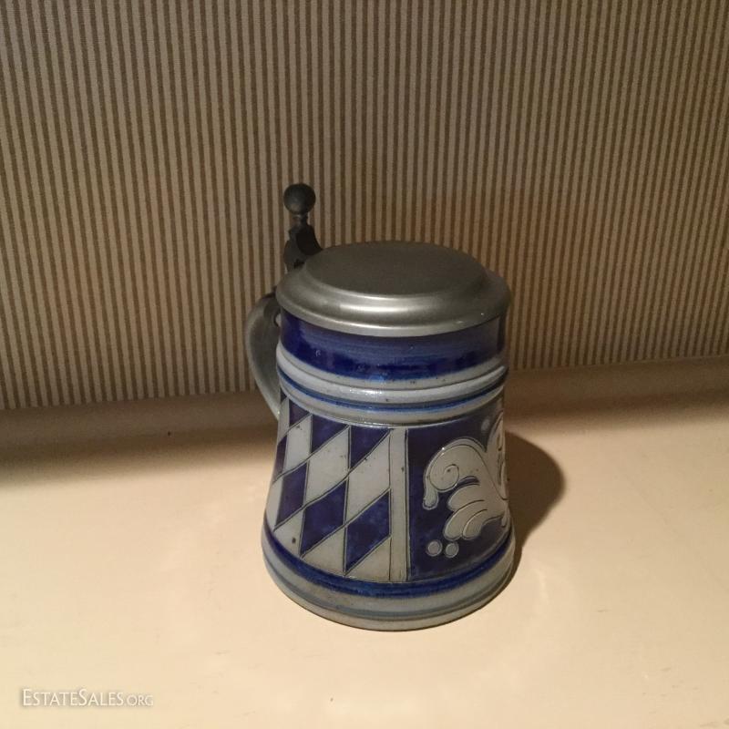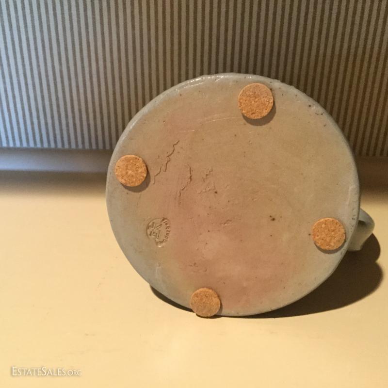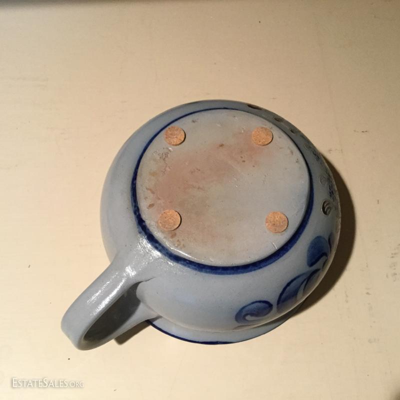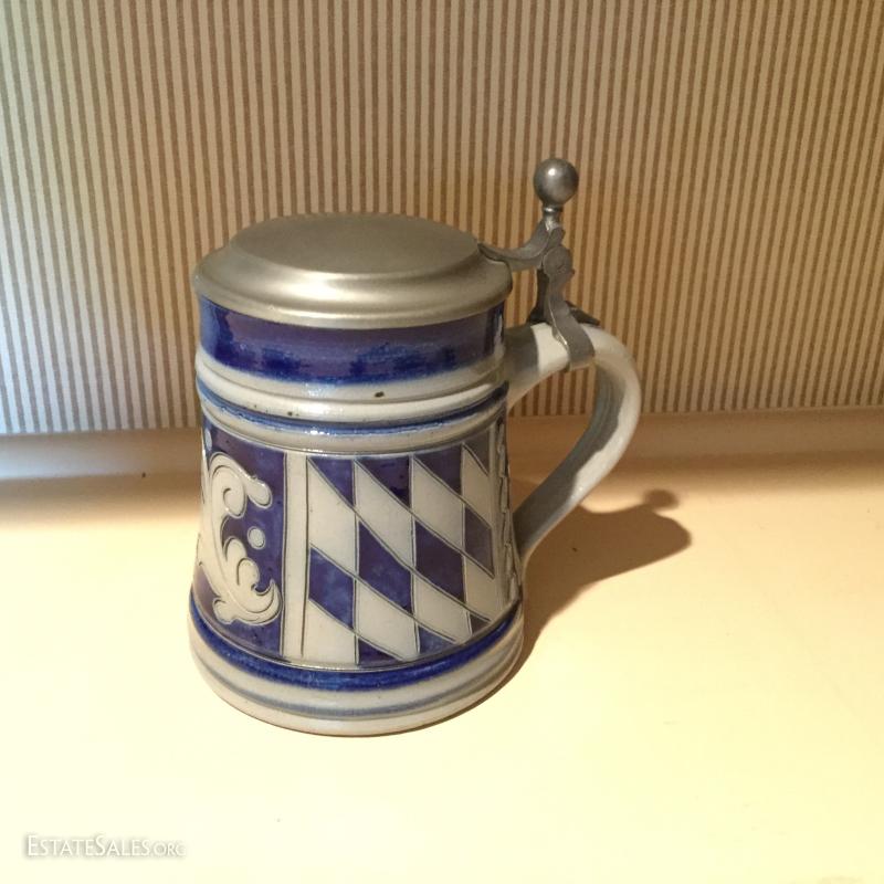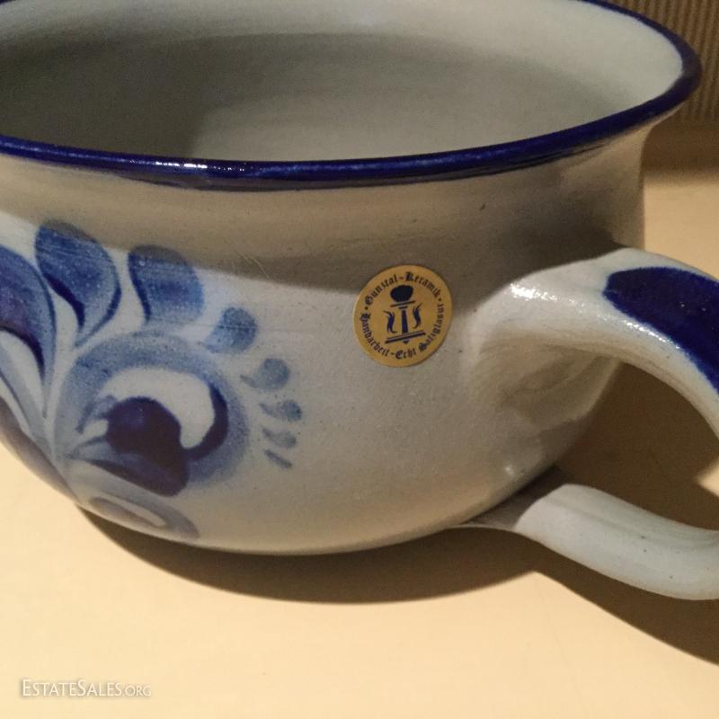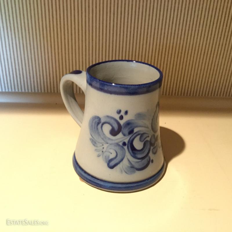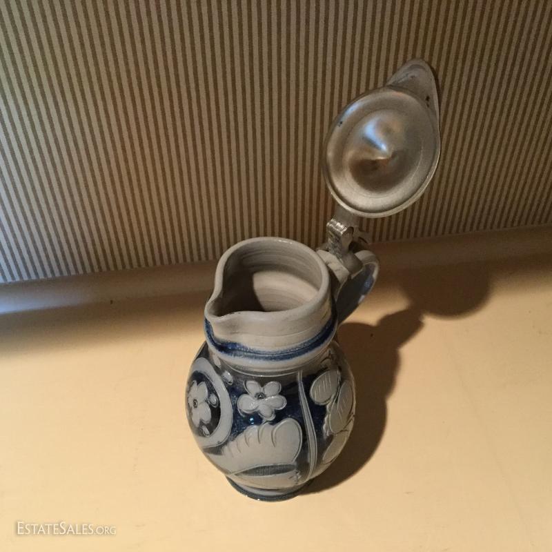 Handarbeit grey and blue pottery includes pitcher and bowl, 7.5"d x 5"h, and six beer mugs. Also includes two steins and mug with matching colors. See photos for details.