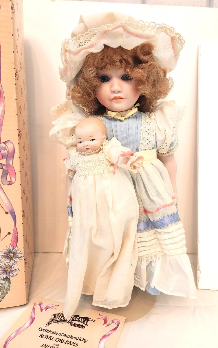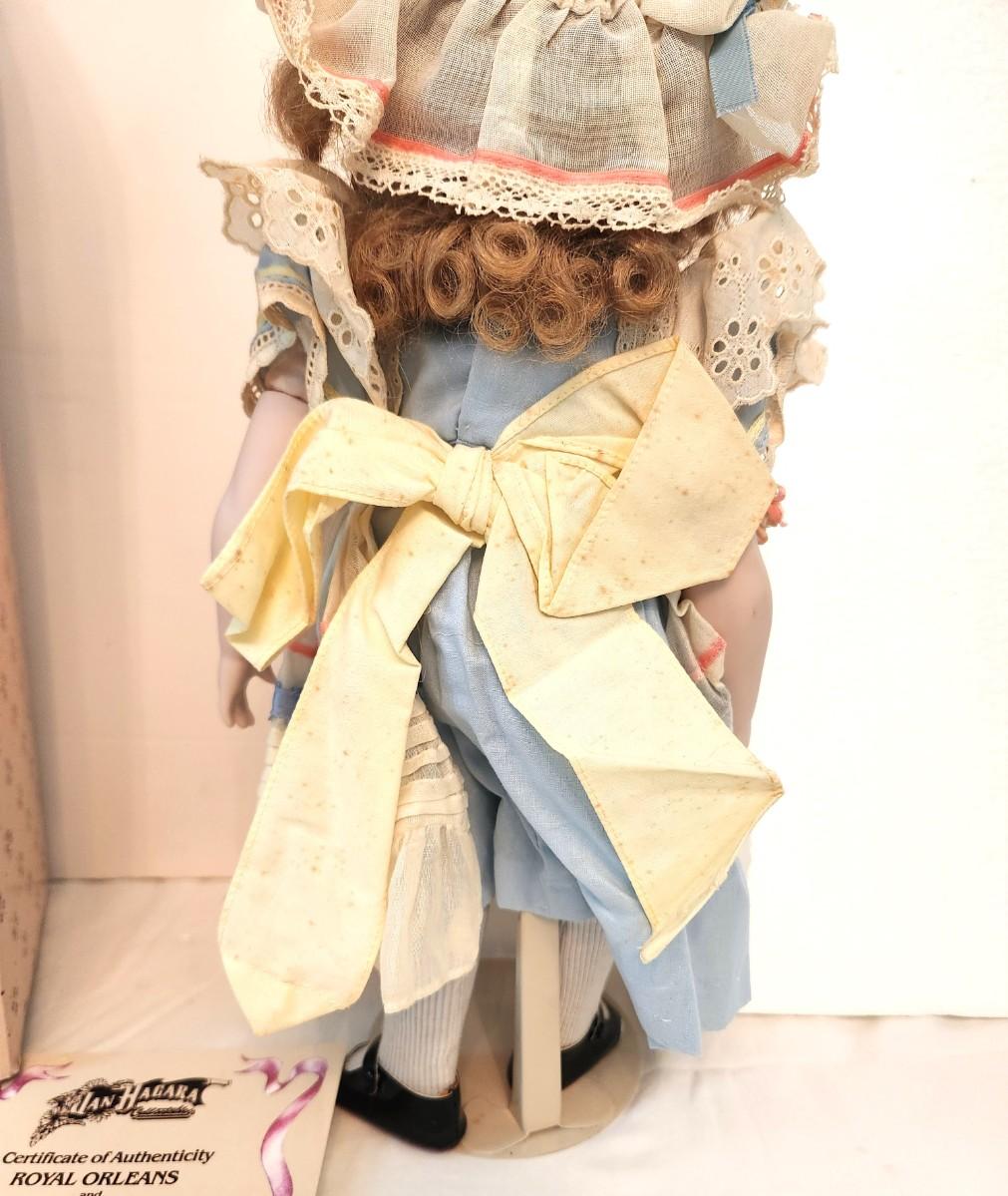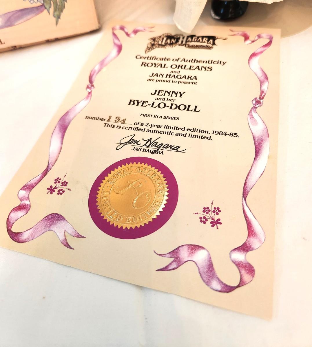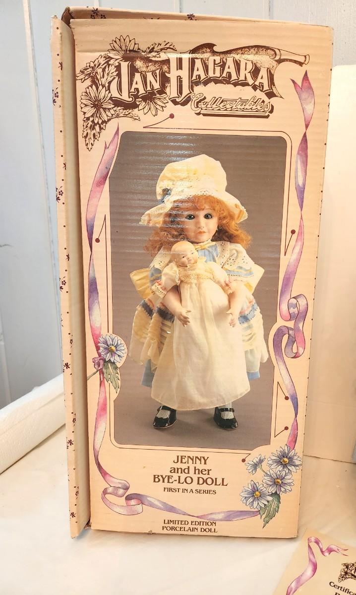 This series was started in 1984 by Jan Hagara Collectibles, and a local gift shop in the Quarter got the exclusive right to sell them. This doll "Jenny and the Bye-Lo Doll" was the first in the series. Doll is 17" tall, toy is 6: takk, Has been stored in the original box for years - there is some browning to the apron on the back. Doll has Human Hair - she was #134 in the edition.