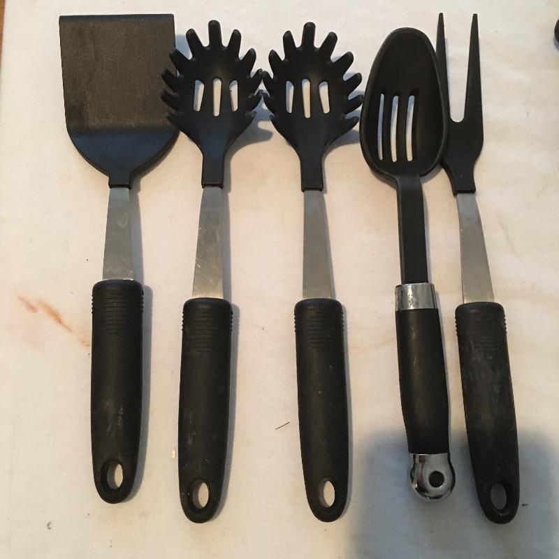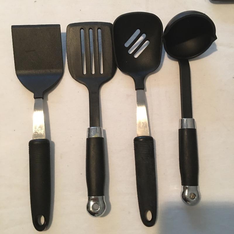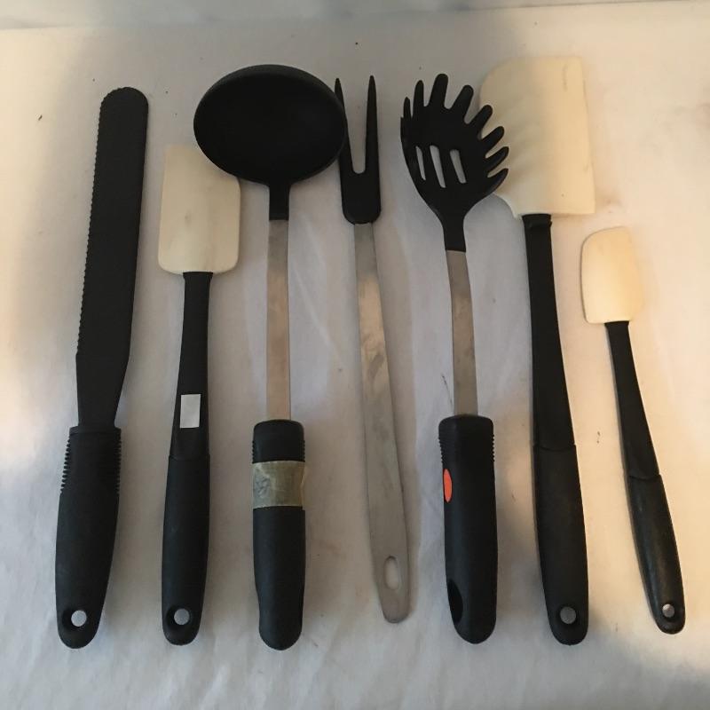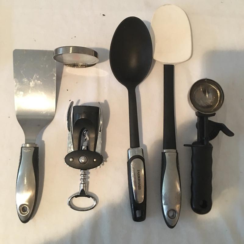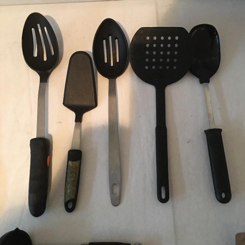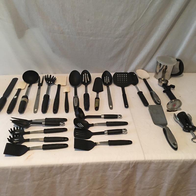 Large array of kitchen utensils includes ice cream scoop, ladle, sifter, spatulas, pasta spoons, wine opener and more.