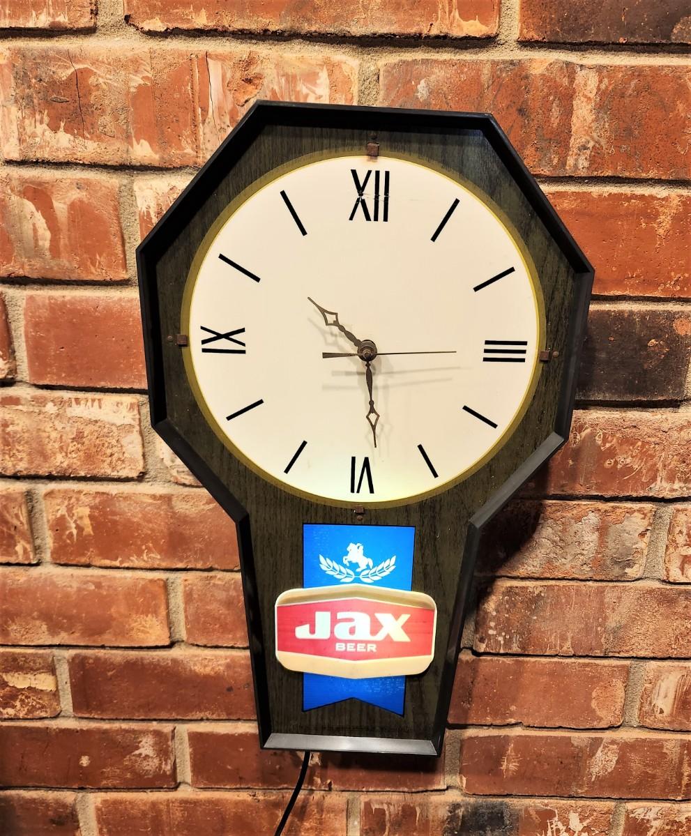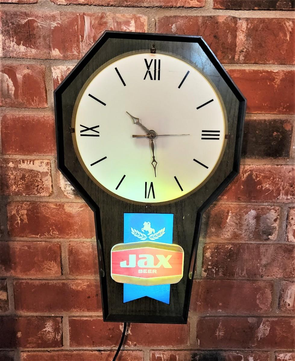 Plastic 1970's JAX light up clock - lights up but clock does not move (likely gummed up). 18" long, 11" wide at widest point.
