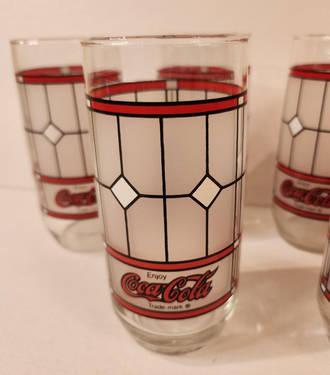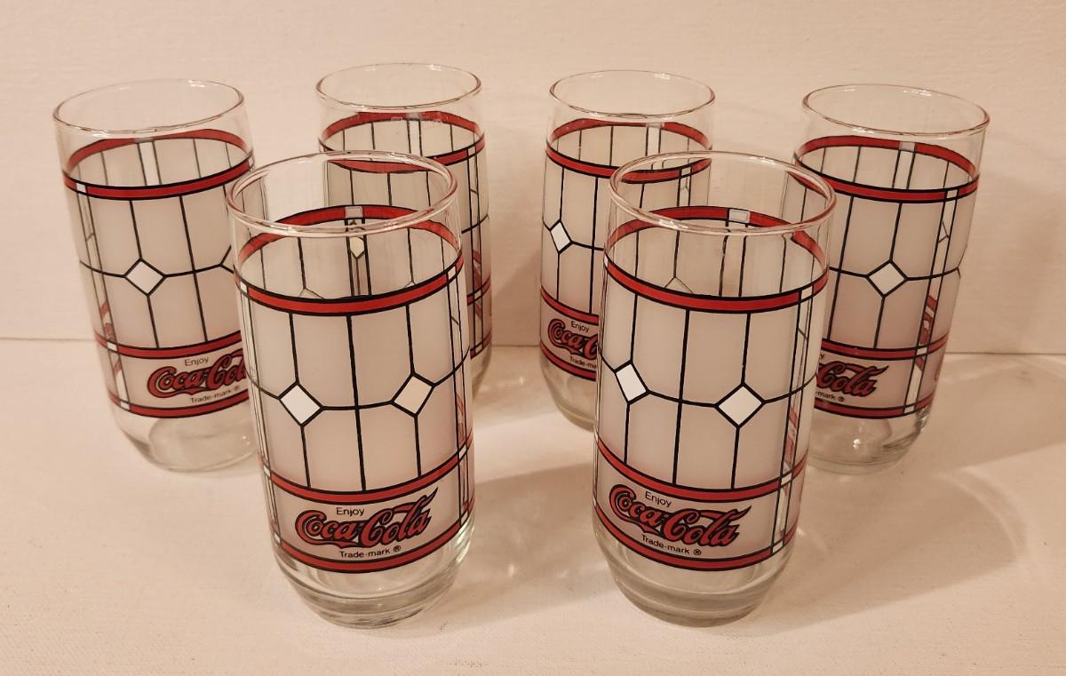 Nice lot of 6 vintage Libbey Glass Company "stained glass" style Coca-Cola glasses - each 6" tall.