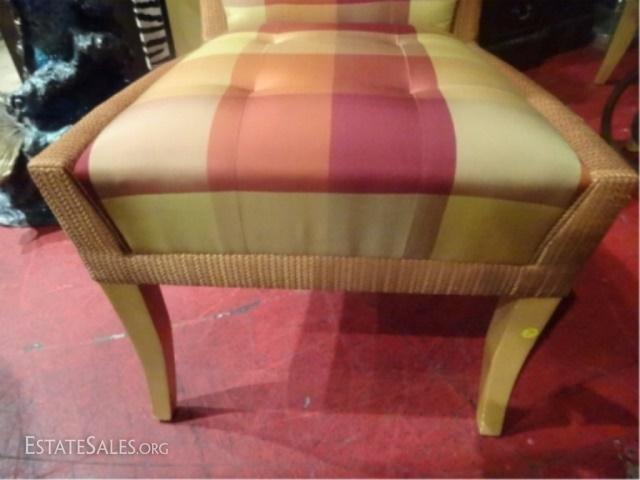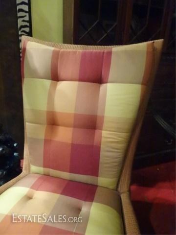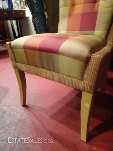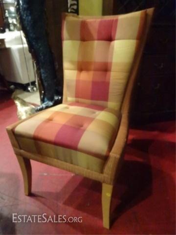 LOT 90: METAL AND GLASS DINING SET, 4 MODERN CHAIRS, SCROLLING METAL BASE TABLE WITH ROUND GLASS TOP, 4 CONTEMPORARY PLAID UPHOLSTERED CHAIRS WITH LIGHT FINISH WOOD FRAMES, GLASS TOP APPROX 5.5'W