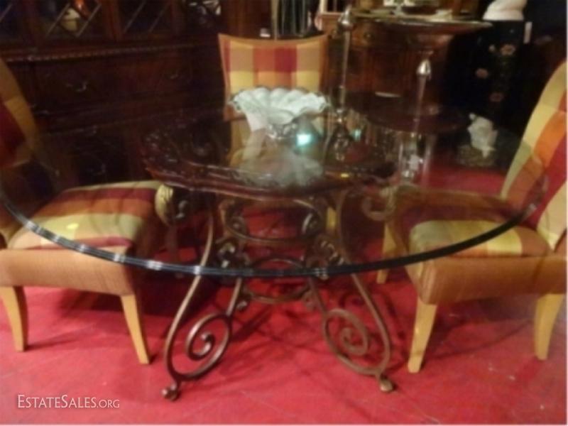 LOT 90: METAL AND GLASS DINING SET, 4 MODERN CHAIRS, SCROLLING METAL BASE TABLE