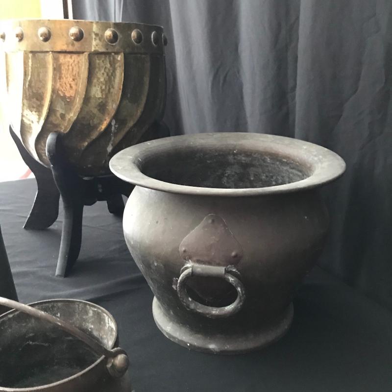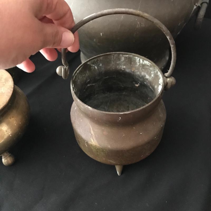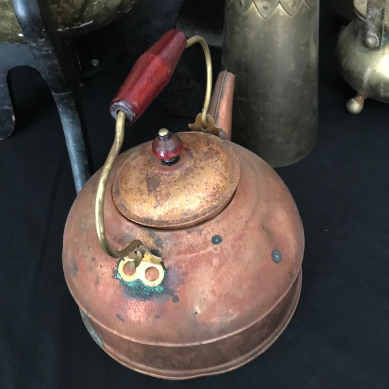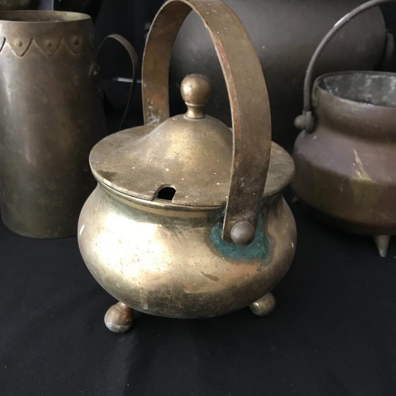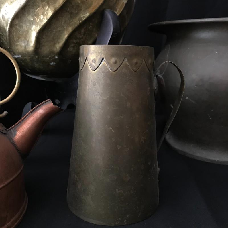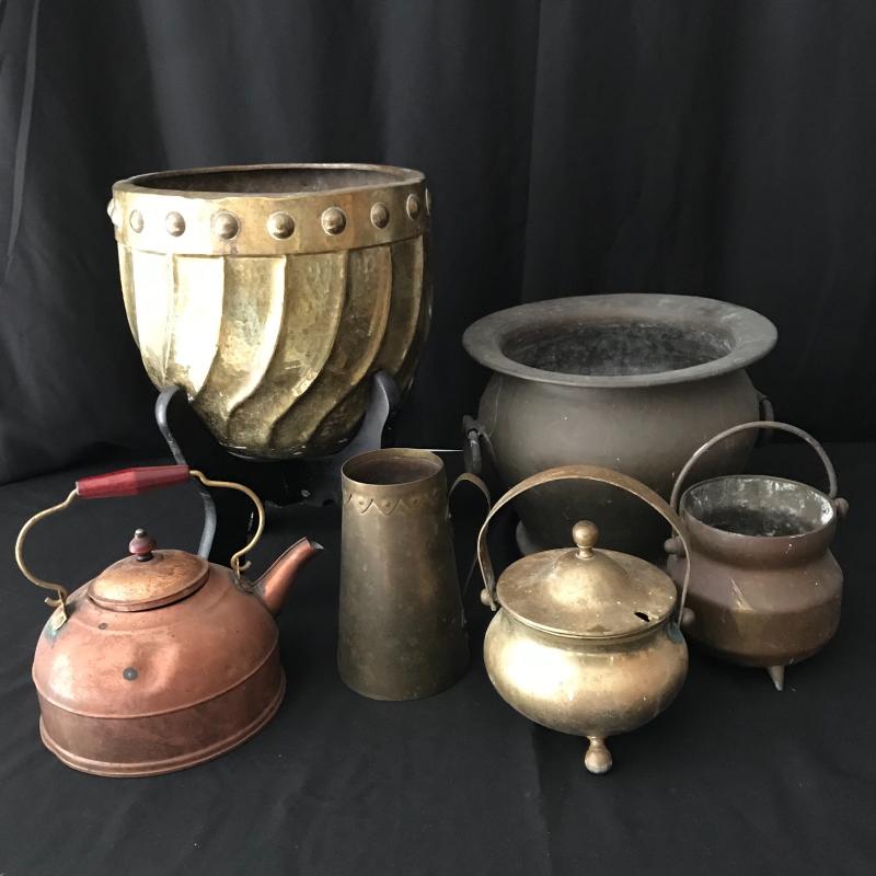 Copper teapot and brass pot collection. Largest pot with stand (stand included) measures 11x15”. Small brass pot was a cape cod fire started but is missing the tool. The stein has the only known signature, see photo. Small brown painted brass is missing a screw in the handle, but appears to be an easy fix. No shipping.