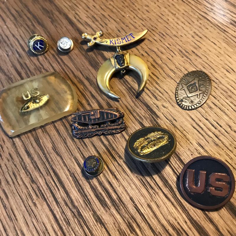 This lot includes various military and group pins and memorabilia. Includes Kiwanis and Masonic items. See photos for details. Shipping available or local pickup in Flat Rock, NC.