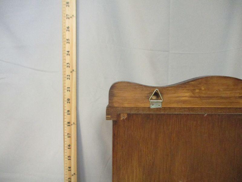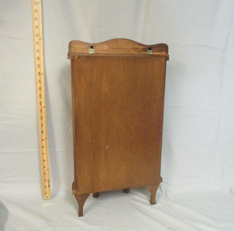 This cabinet is in great shape and can be used either on a table top, or it can be hung on a wall. The only issue is that it is missing two shelves. The pegs are there, but the shelves are missing. It stands 22.5" tall and is about 12.5" wide. It is made of wood and curved glass.