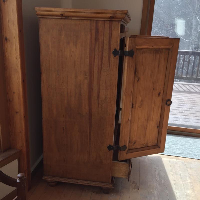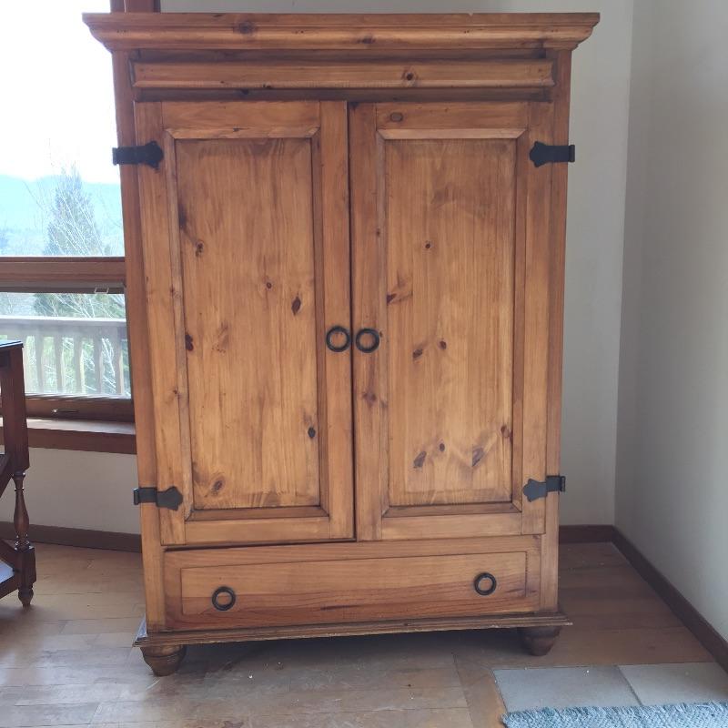 Nice solid pine armoire entertainment piece with a 34”wide opening that should fit up to 40” tv. (Tv measures at diagonal. ) Also has a bottom drawer.